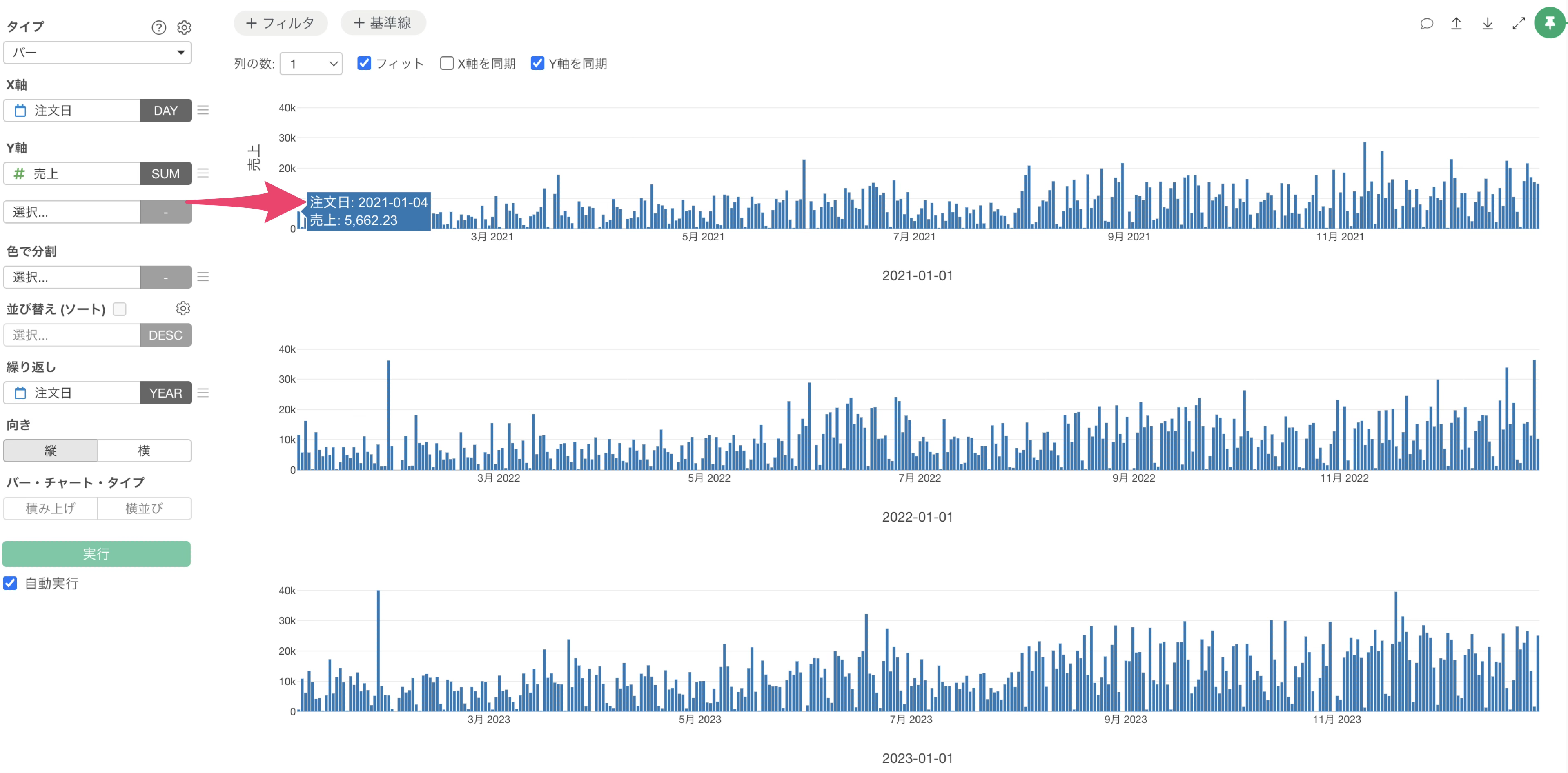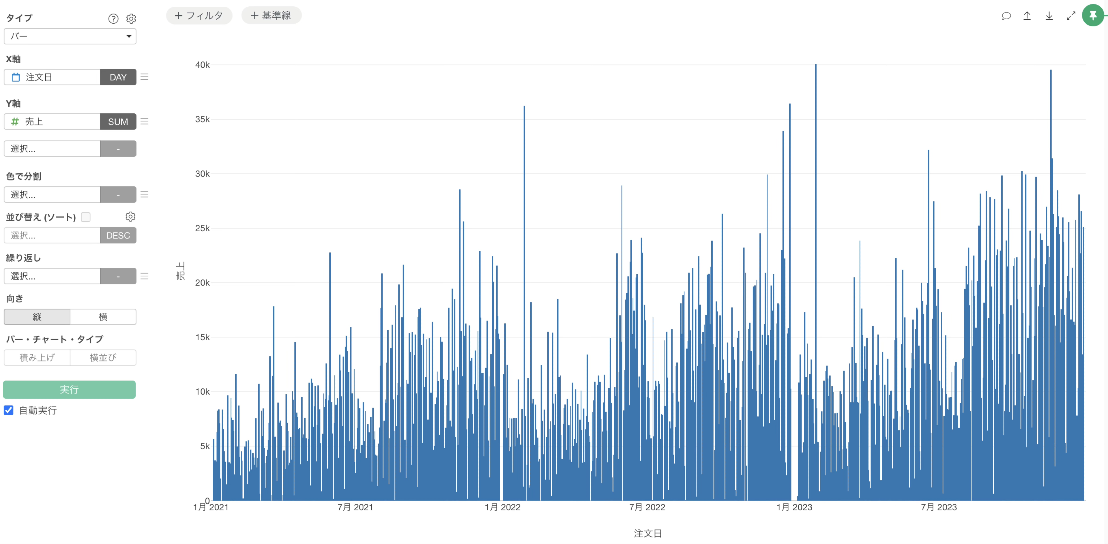 チャートビューに移動し、チャートタイプに「バー」、X軸には「注文日」を選択し、日付の単位は「日」に設定し、Y軸には「売上」を選択します。