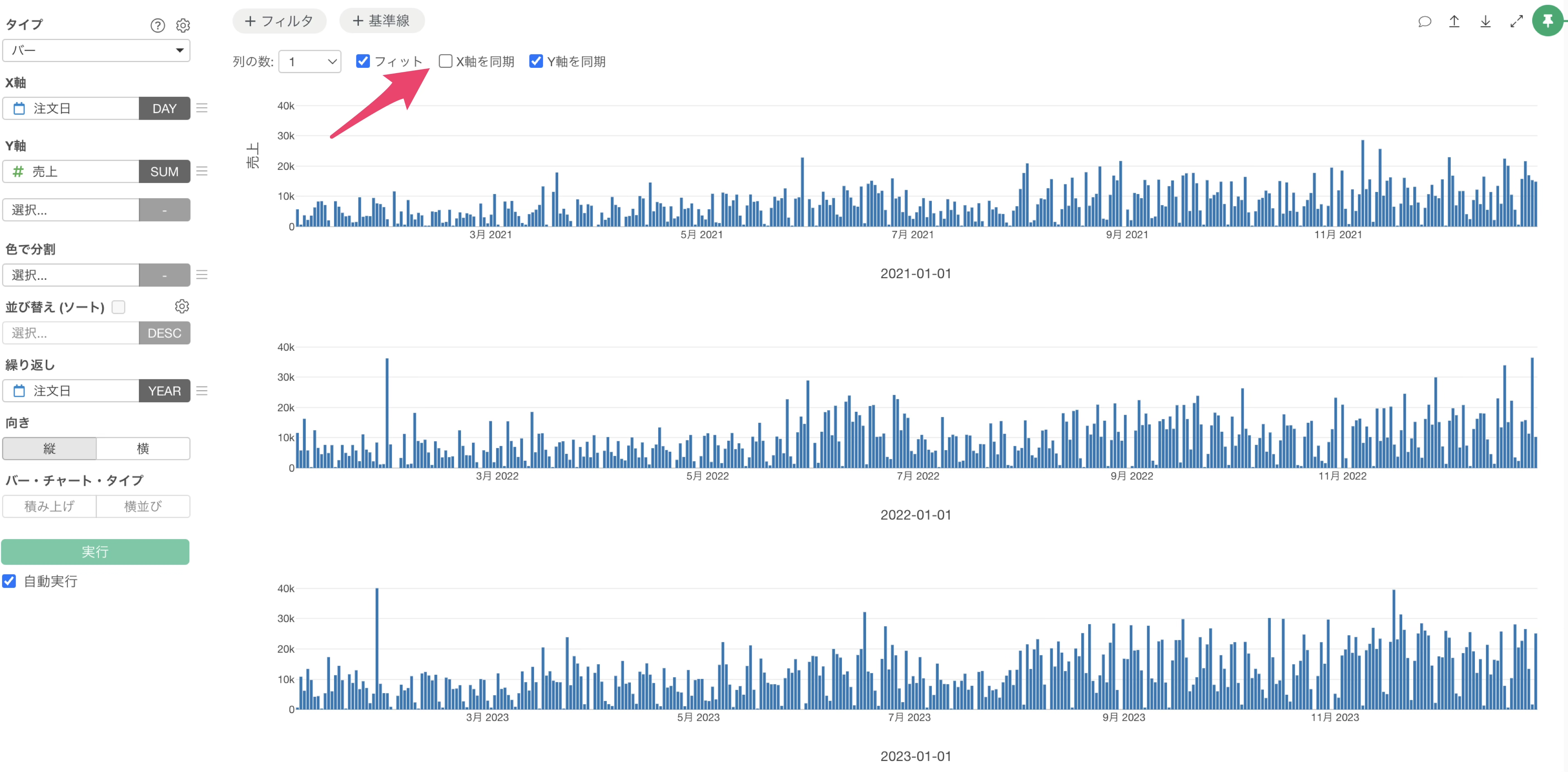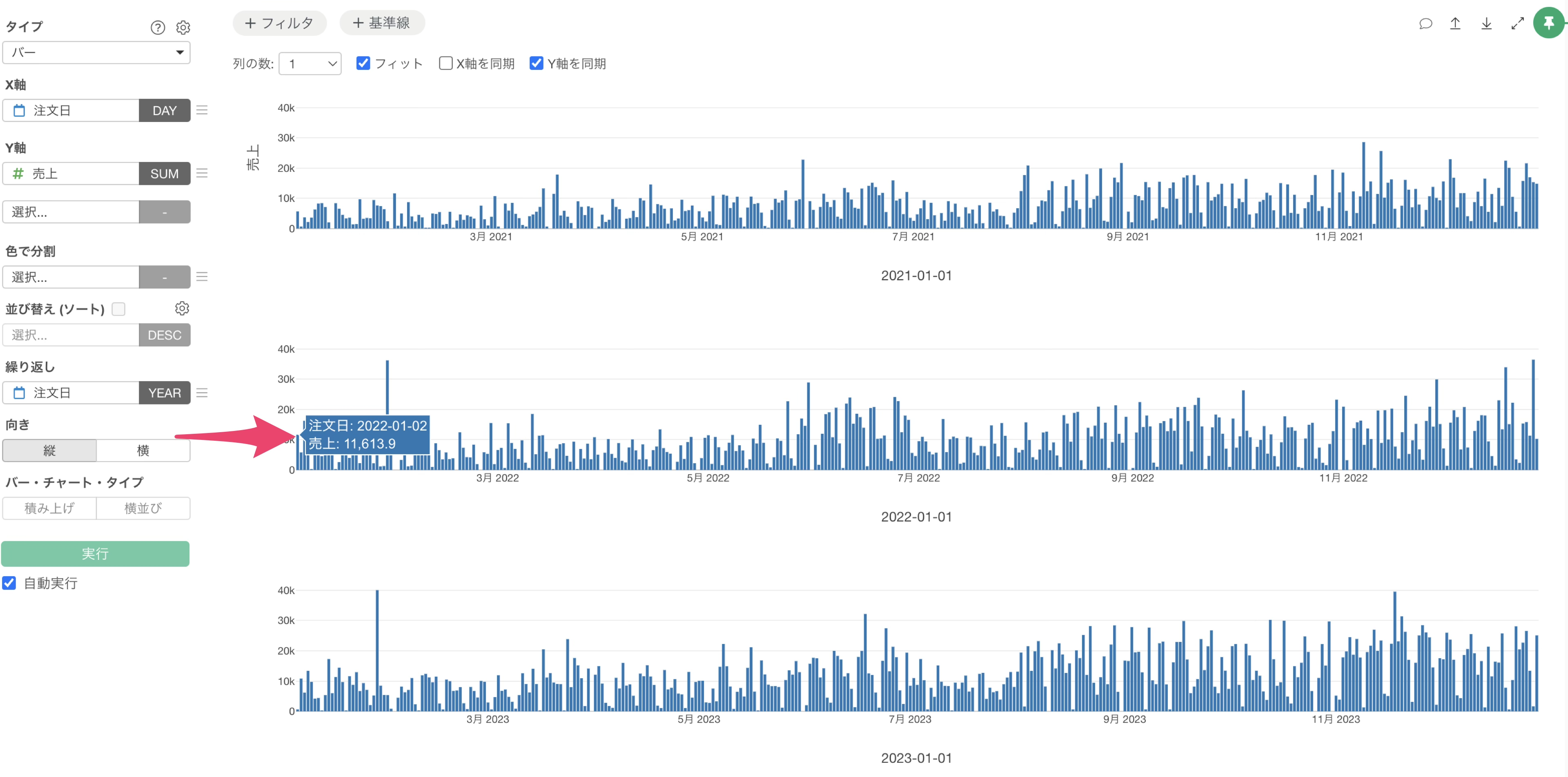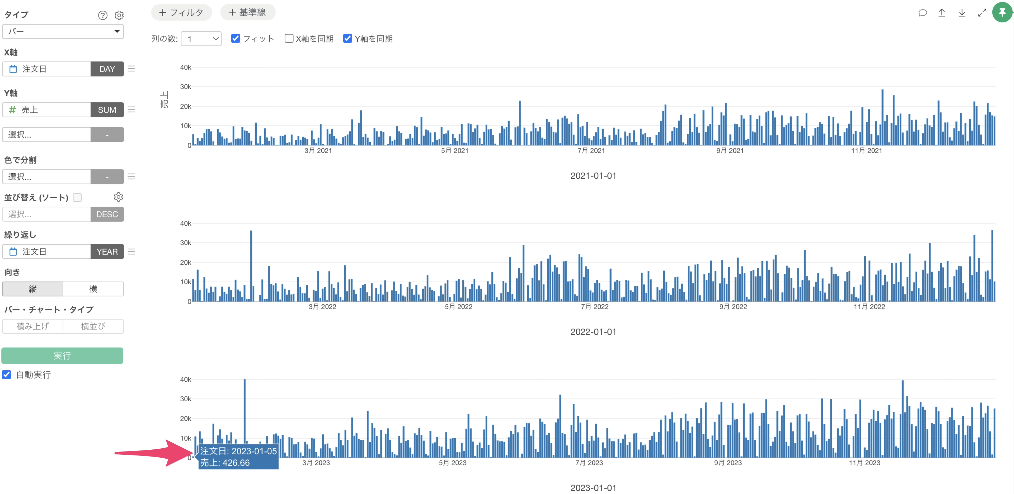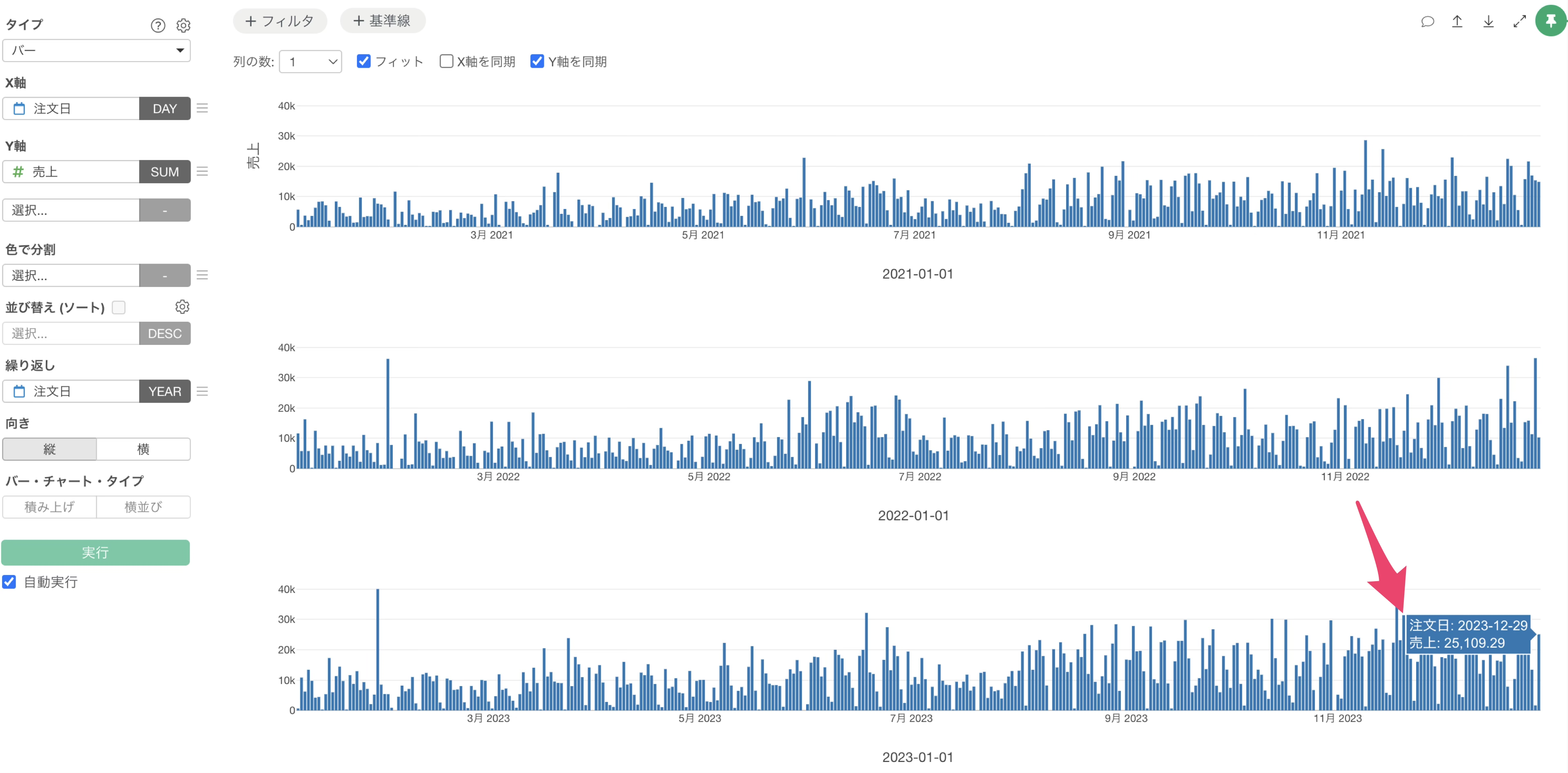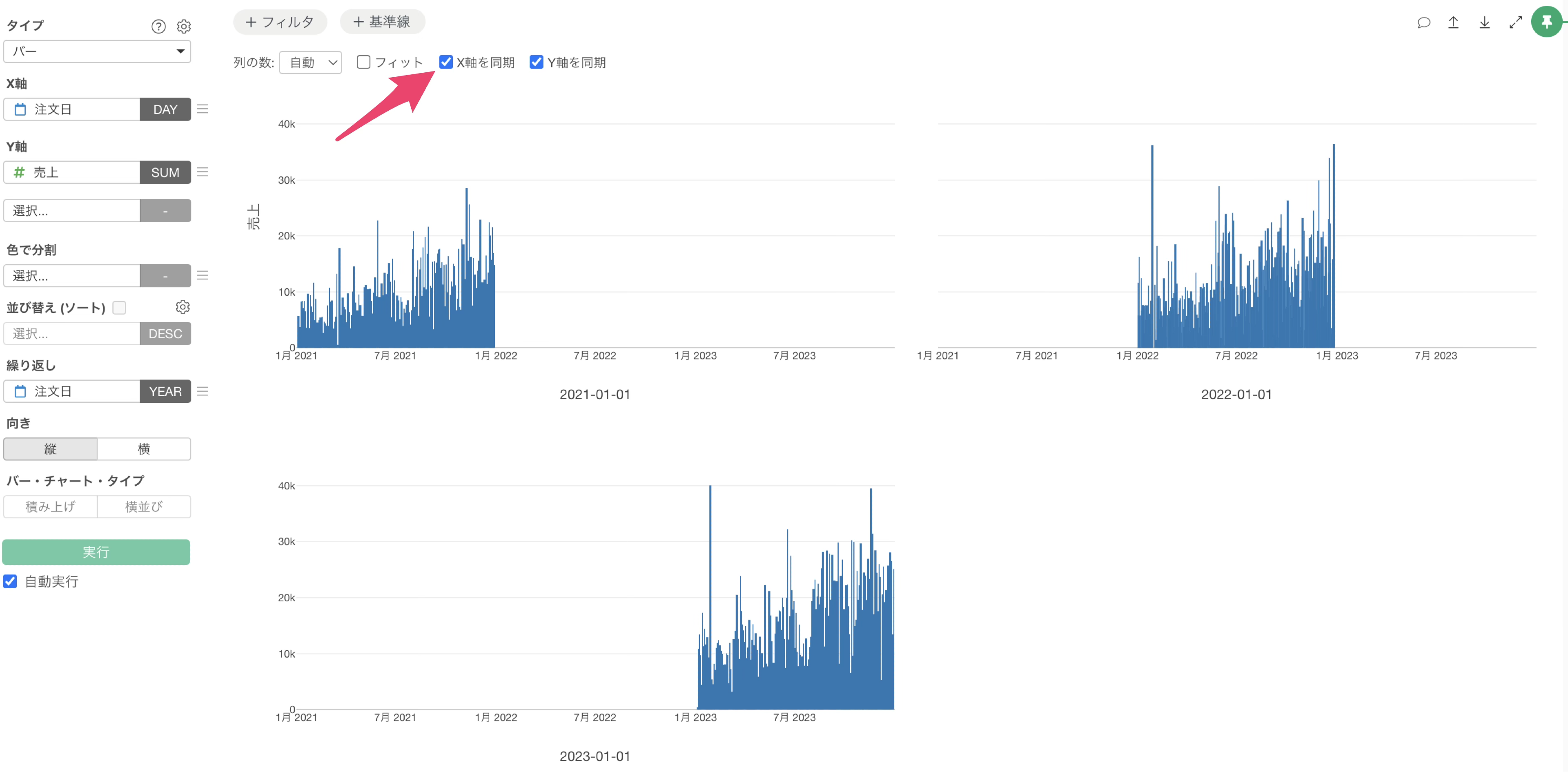 これで縦方向にチャートを比較した時に、同じ日付が同じ位置に配置され、各年の同じ日における売上を効率的にチェックすることができるようになりました。