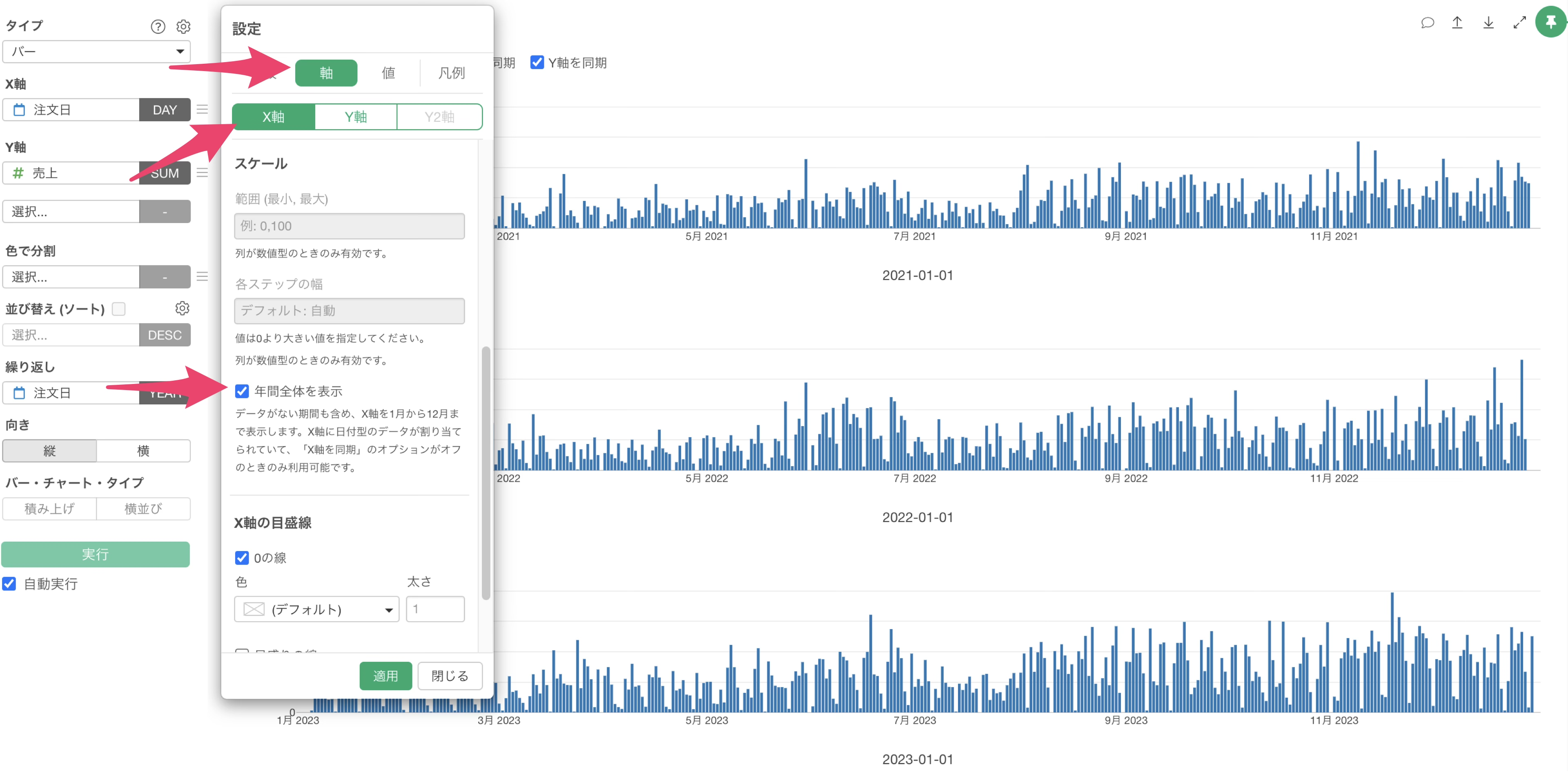 チャートの設定ボタンをクリックし、「軸」のメニューを選択のうえ、「スケール」のセクション内にある「年間全体を表示」オプションにチェックをつけ、適用ボタンをクリックします。