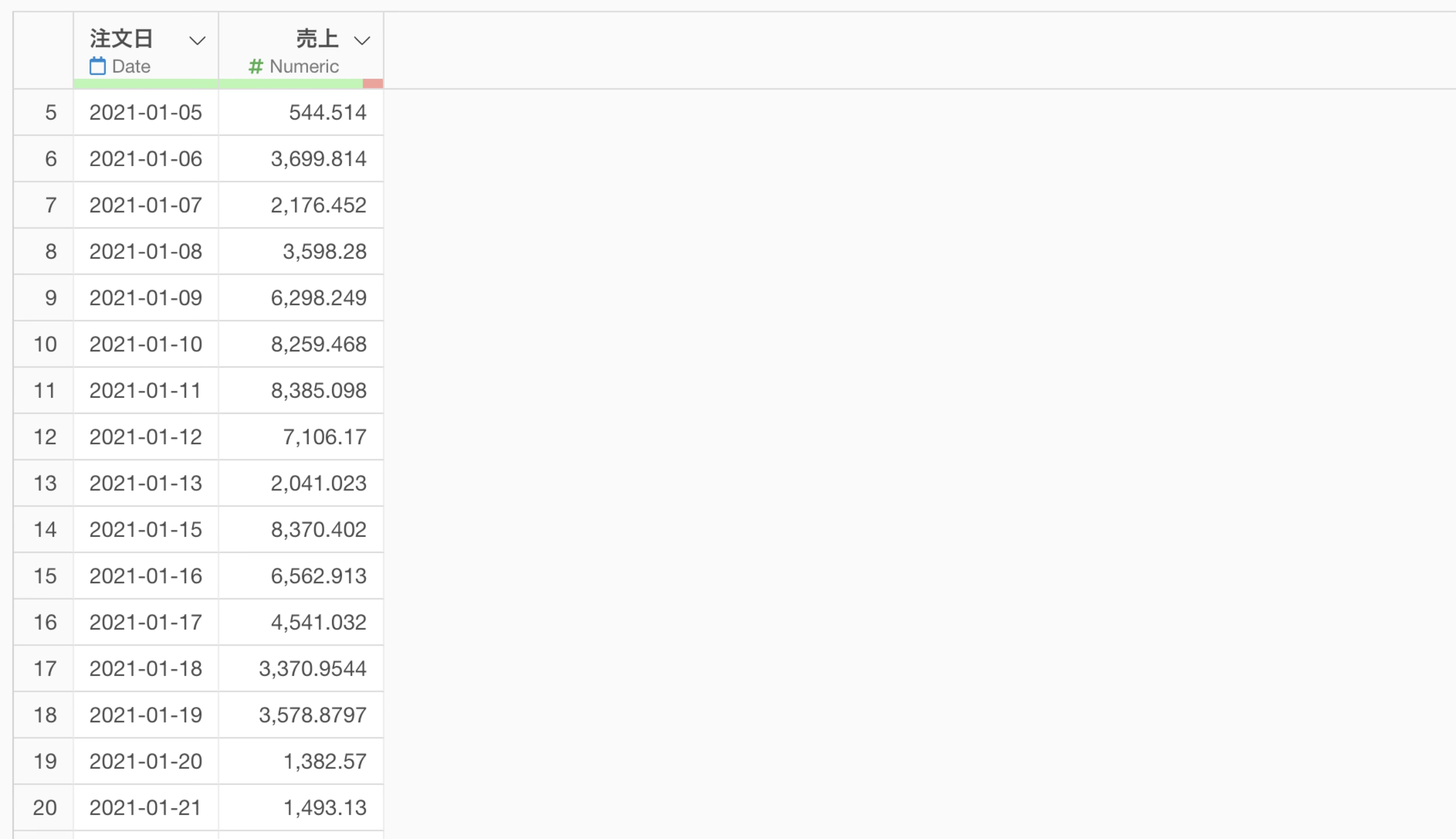 今回は1行が1日の売上を表し、列には注文日と売上の情報を持つデータを利用します。このデータは2021年1月1日から2023年12月31日までの期間をカバーしています。
