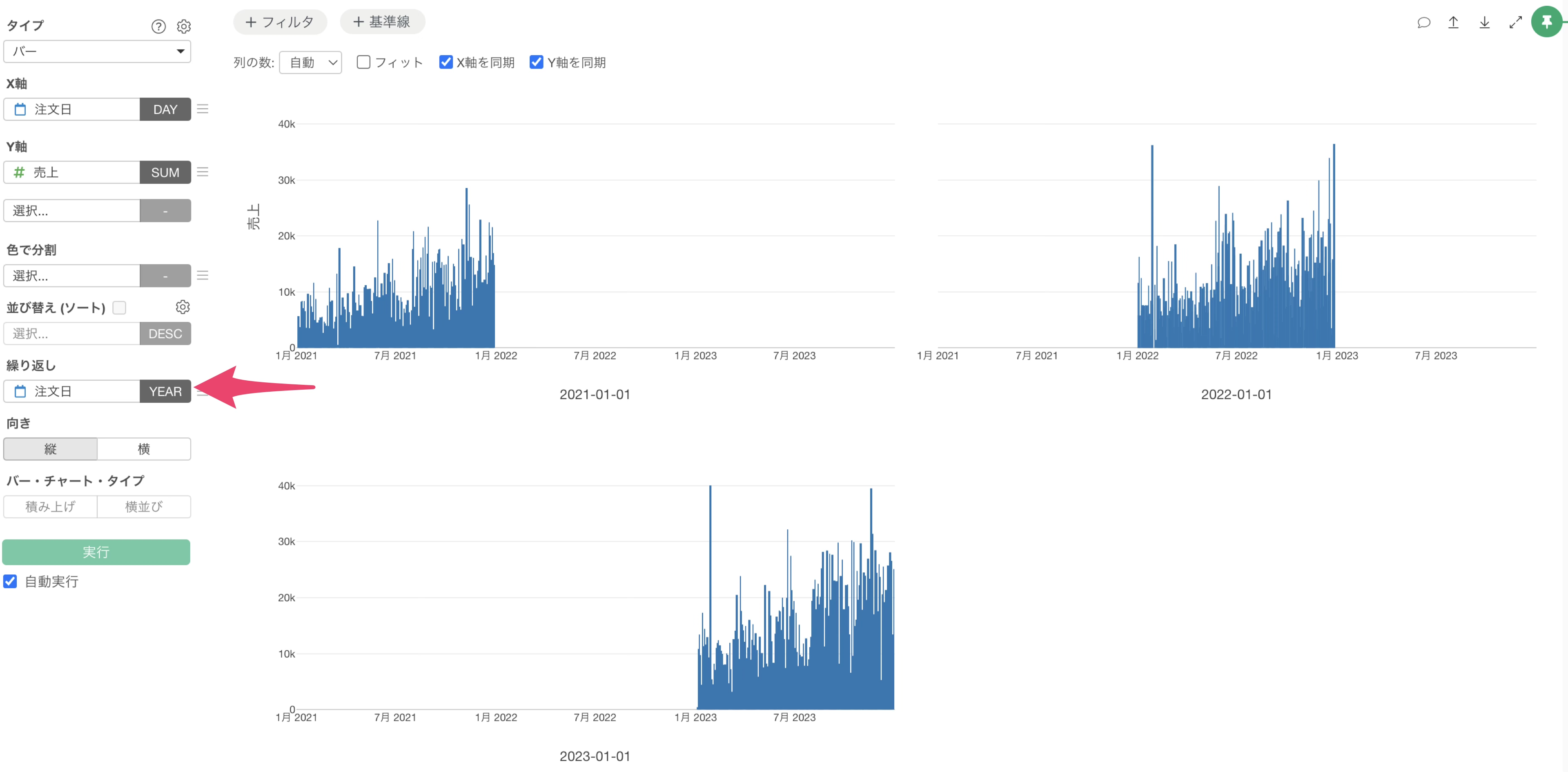 繰り返しに「注文日」を選択し、年で繰り返される形に設定します。これにより3つのチャート(2021年、2022年、2023年)が作成されます。