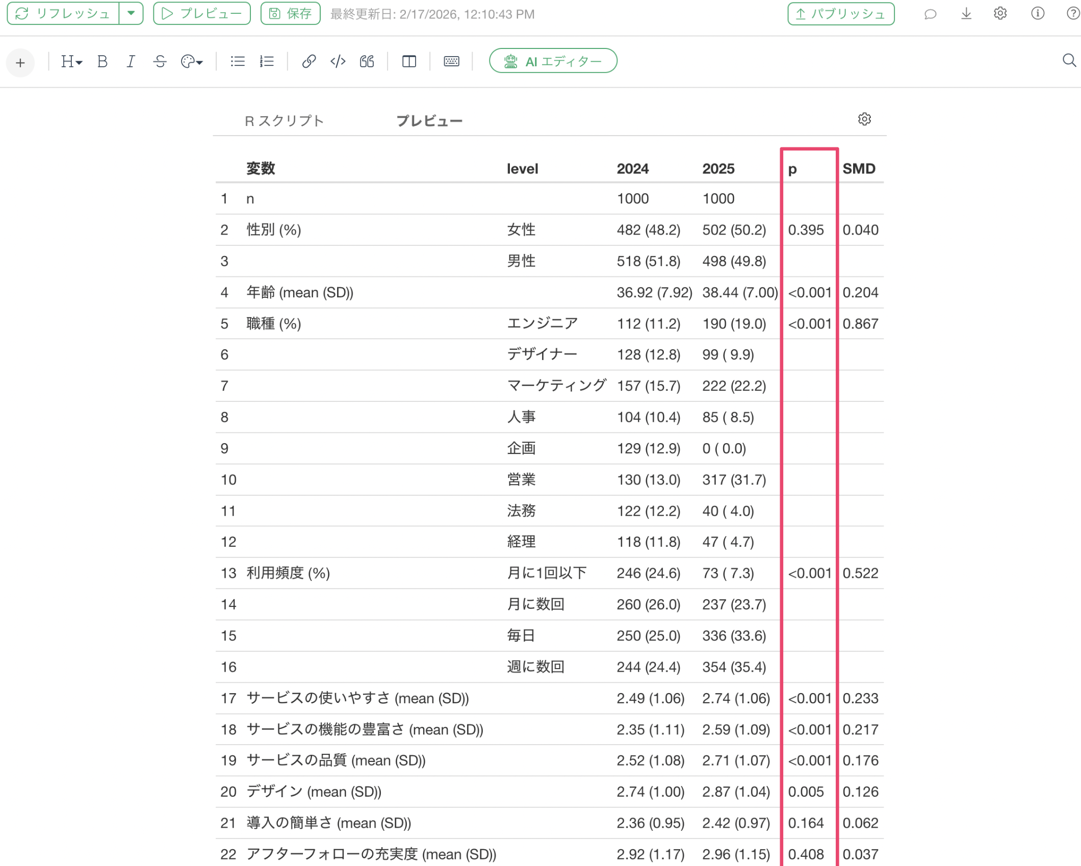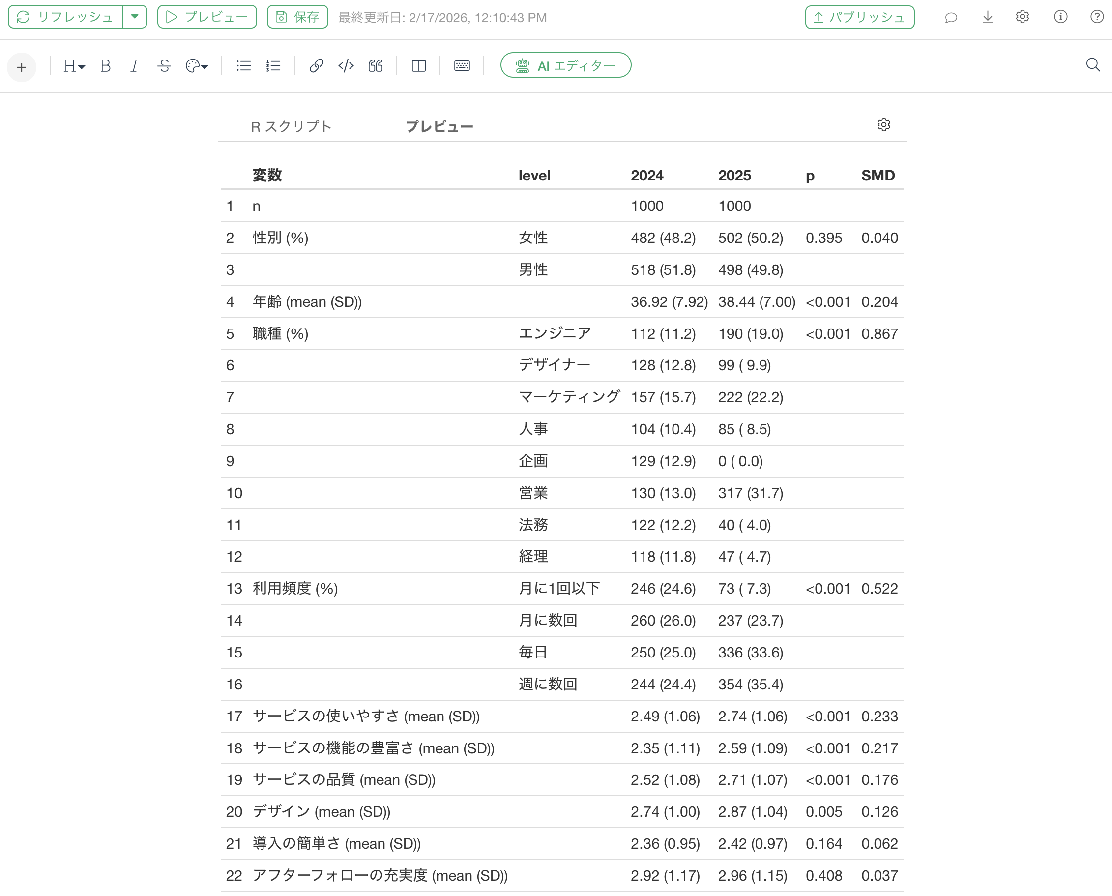 この手順の目的は、2つの年度間で回答者の属性や評価傾向に「統計的に有意な差」がある箇所を素早く特定することにあります。UI版では数値列の信頼区間の比較が主でしたが、この方法ではカテゴリー列も含めた網羅的な分析が可能です。