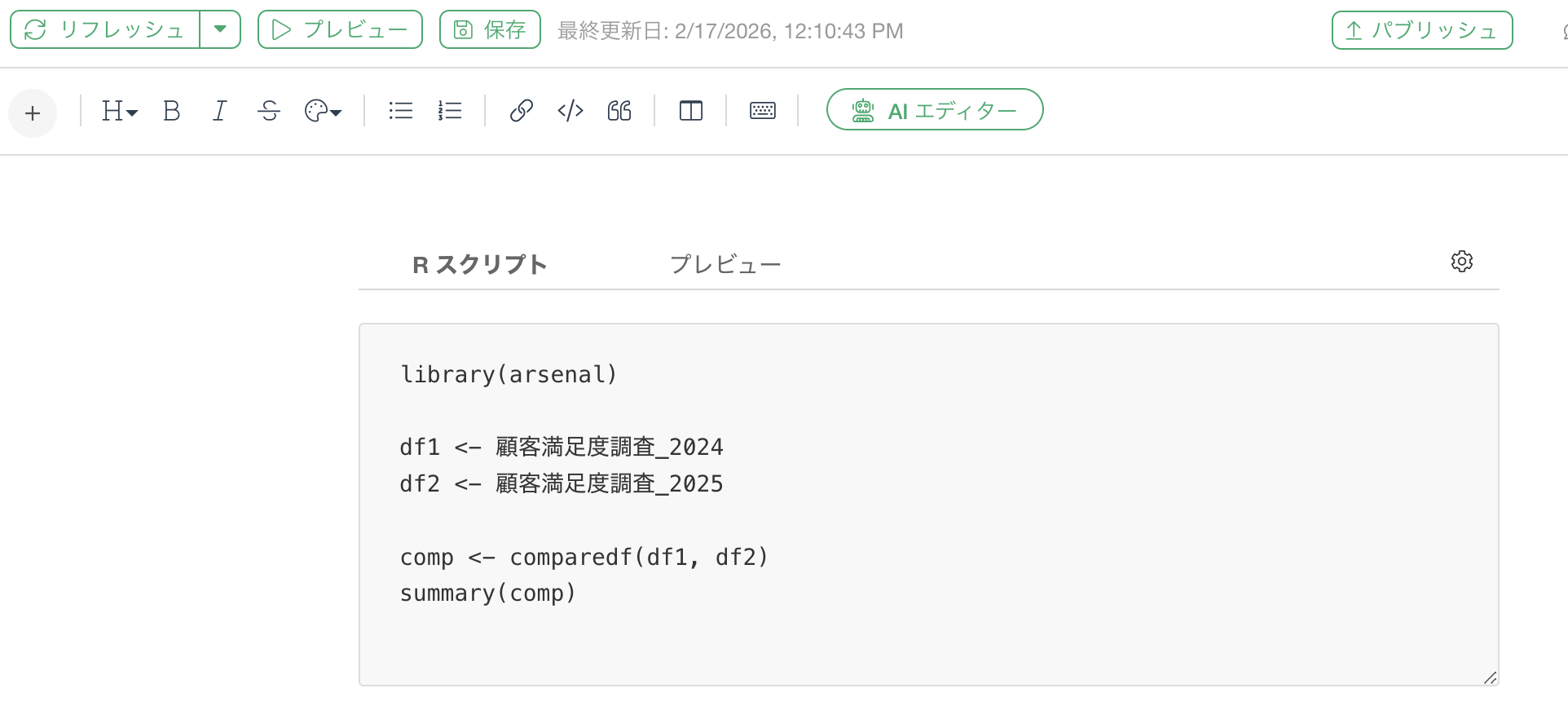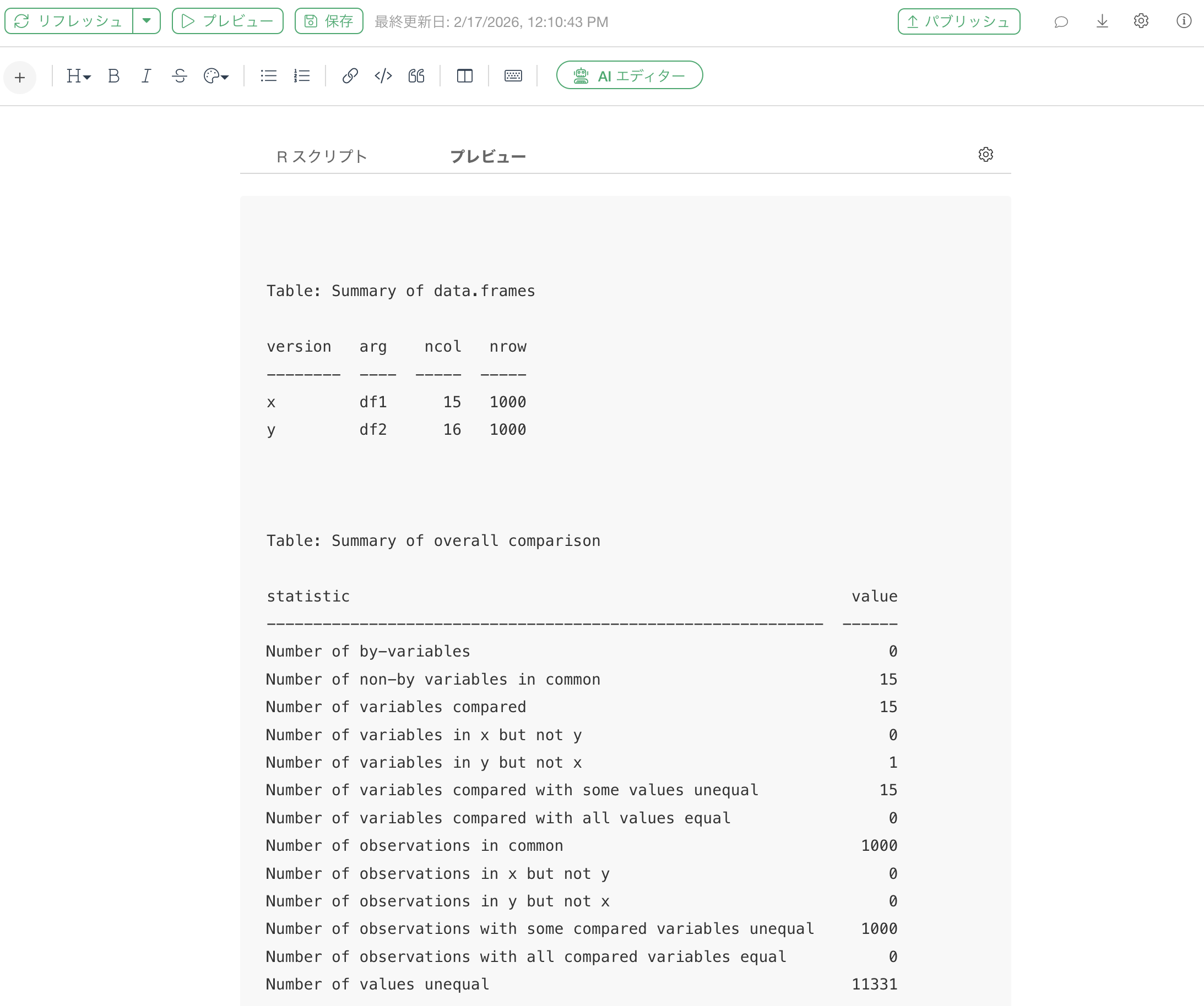 2つのデータフレームを比較する際、UI操作によるマージ(結合)以外にも、Rスクリプトを活用することでより詳細かつ効率的にデータの差異を特定する方法があります。