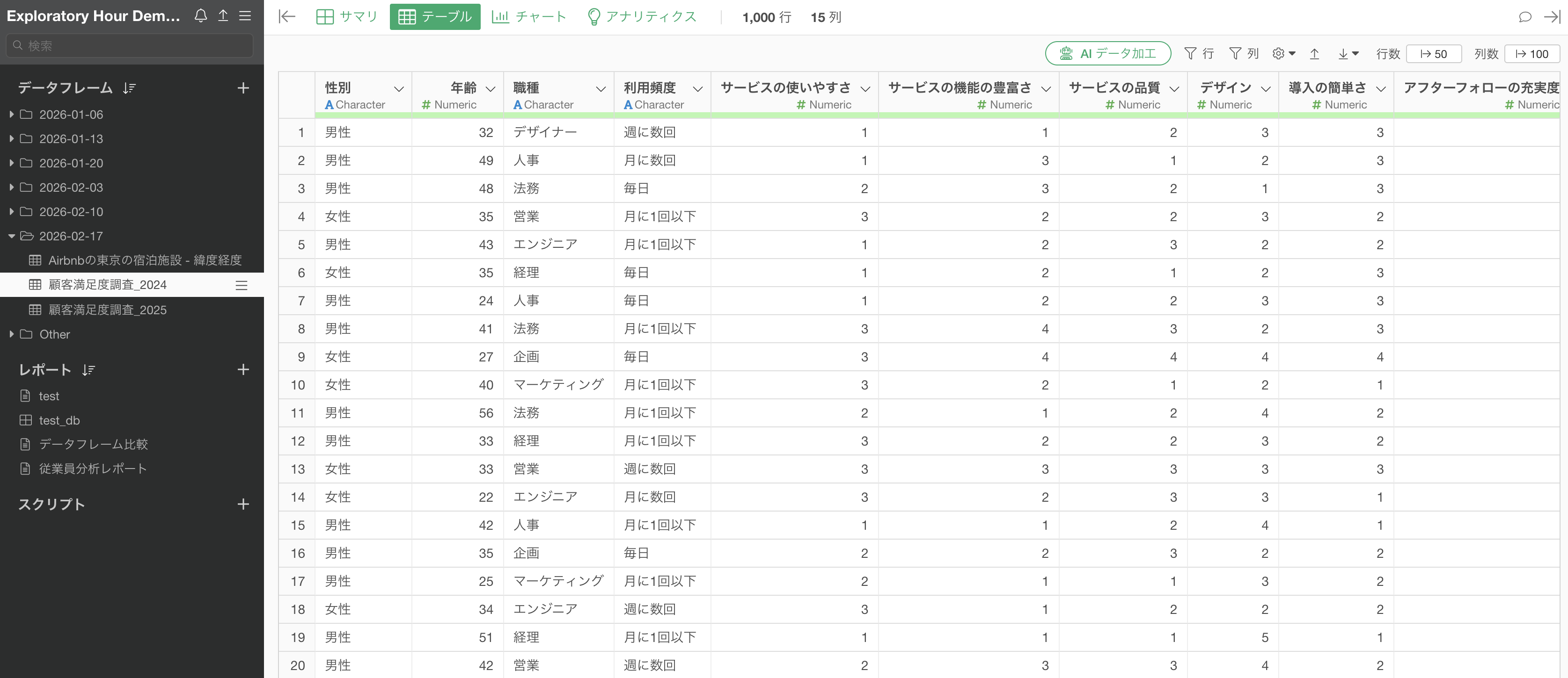 今回使用するサンプルデータは、2024年度と2025年度の顧客満足度調査データです。1行が1回答者を表し、性別や職種などの属性情報と、5段階評価の質問列が含まれています。