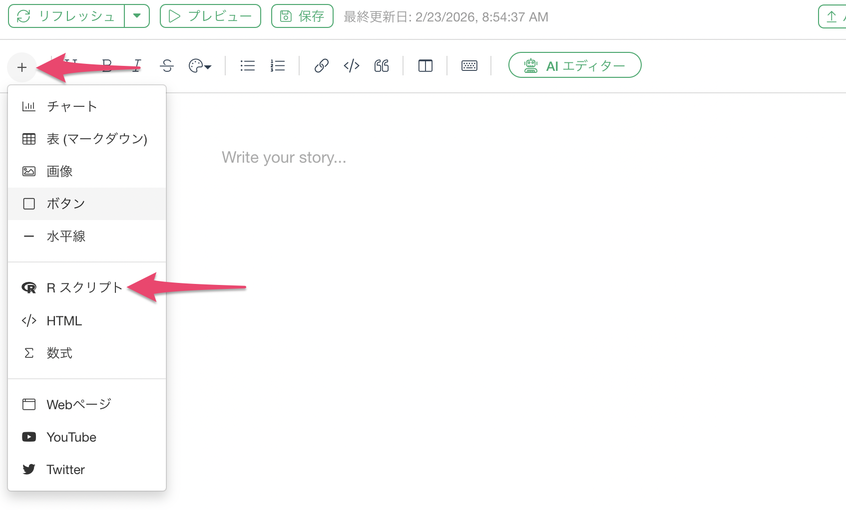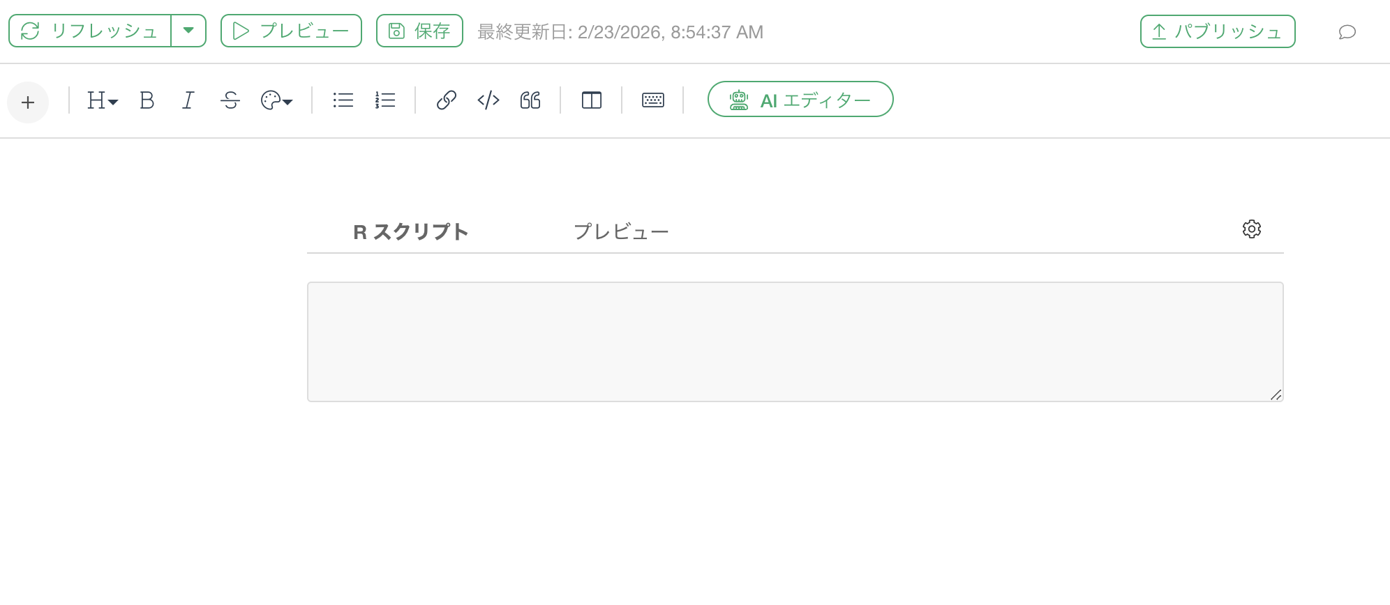 ノートが作成できたら、左上のプラスボタンからRスクリプトを選択します。
