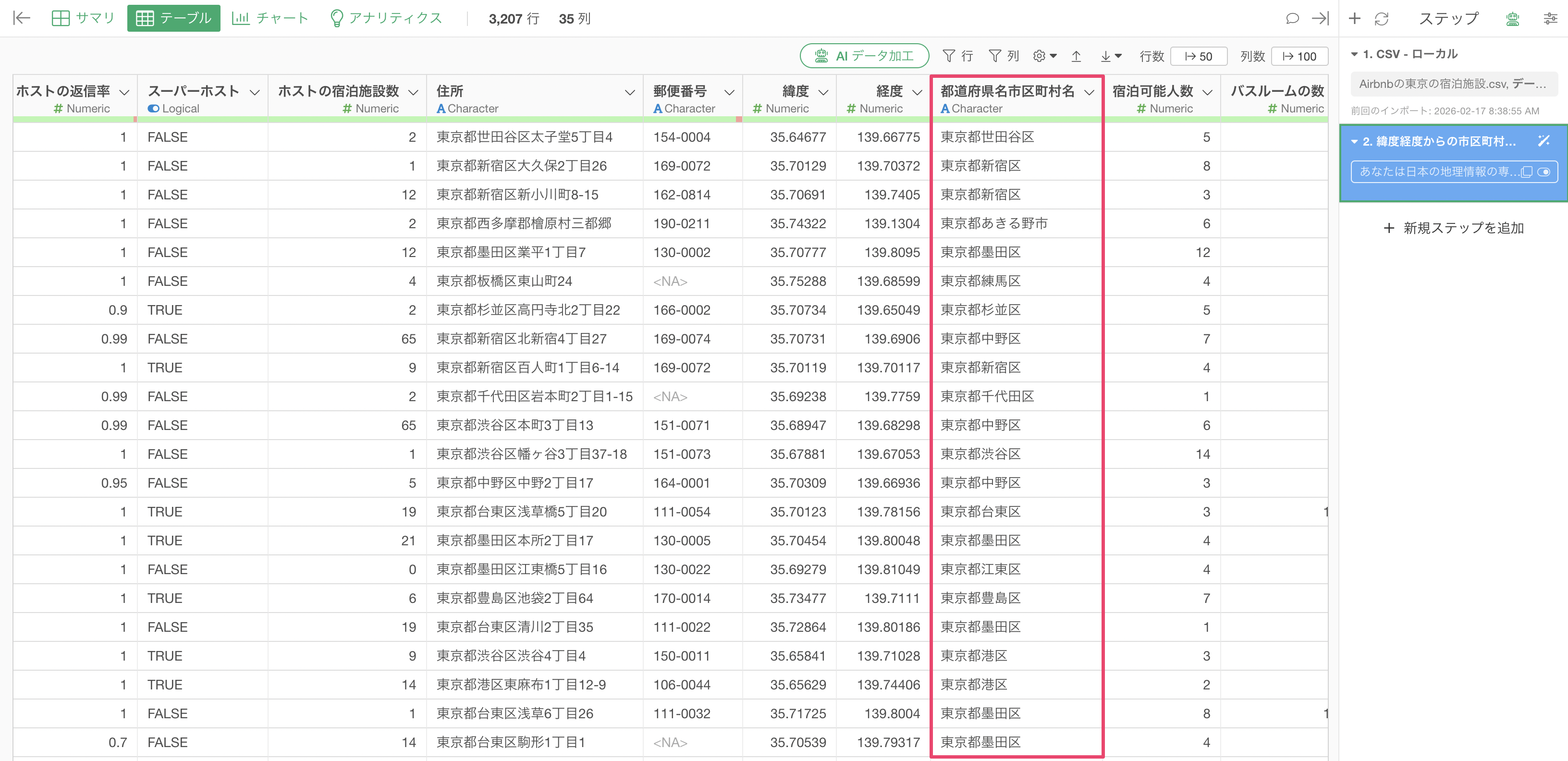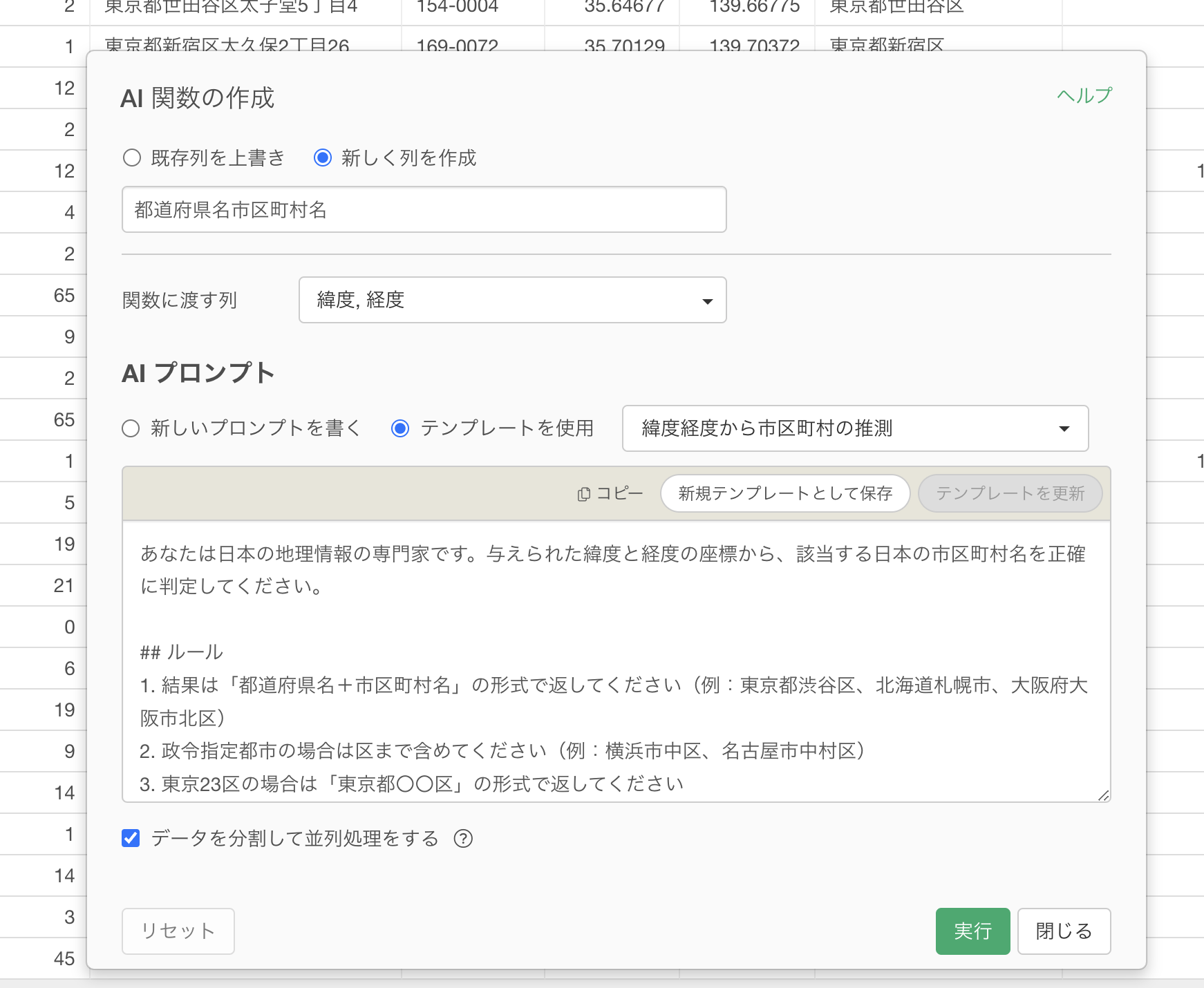 「実行」ボタンをクリックすると、AIが各行の座標データを解析し、該当する自治体名を生成します。