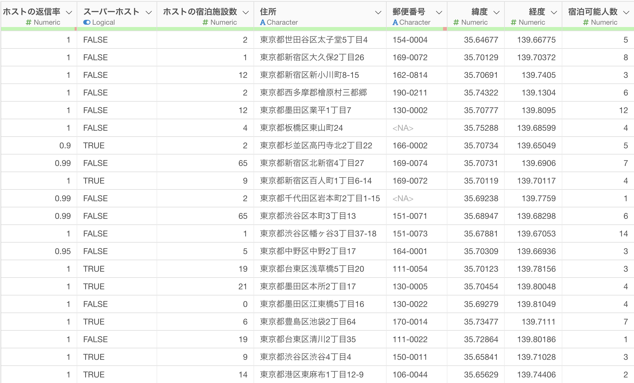 今回使用するサンプルデータは、Airbnbの東京における宿泊施設データです。このデータには「緯度(latitude)」と「経度(longitude)」の列が含まれています。