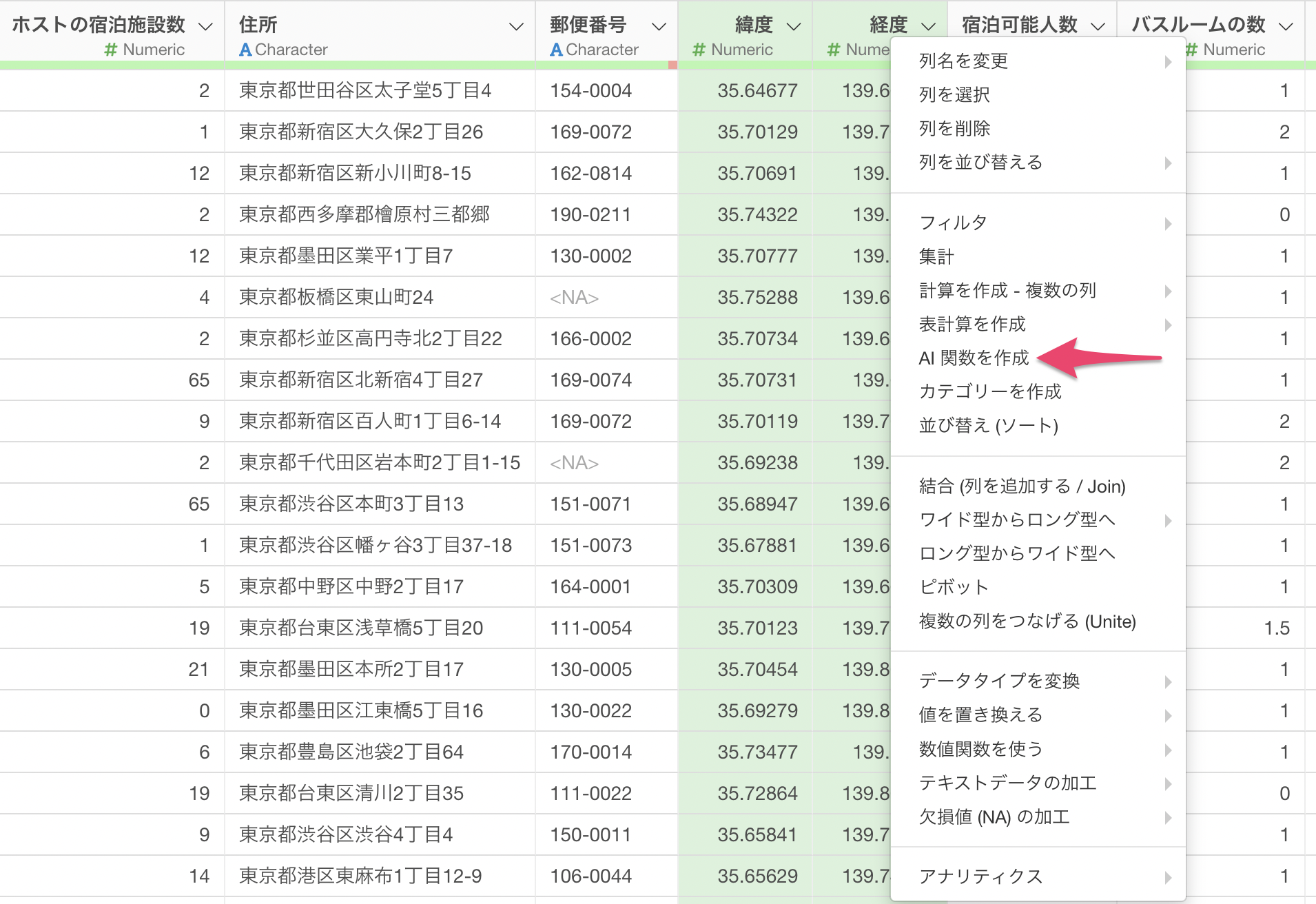 「緯度」と「経度」の2つの列をShiftキーを押しながら選択し、列ヘッダメニューから「AI関数を作成」を選択します。