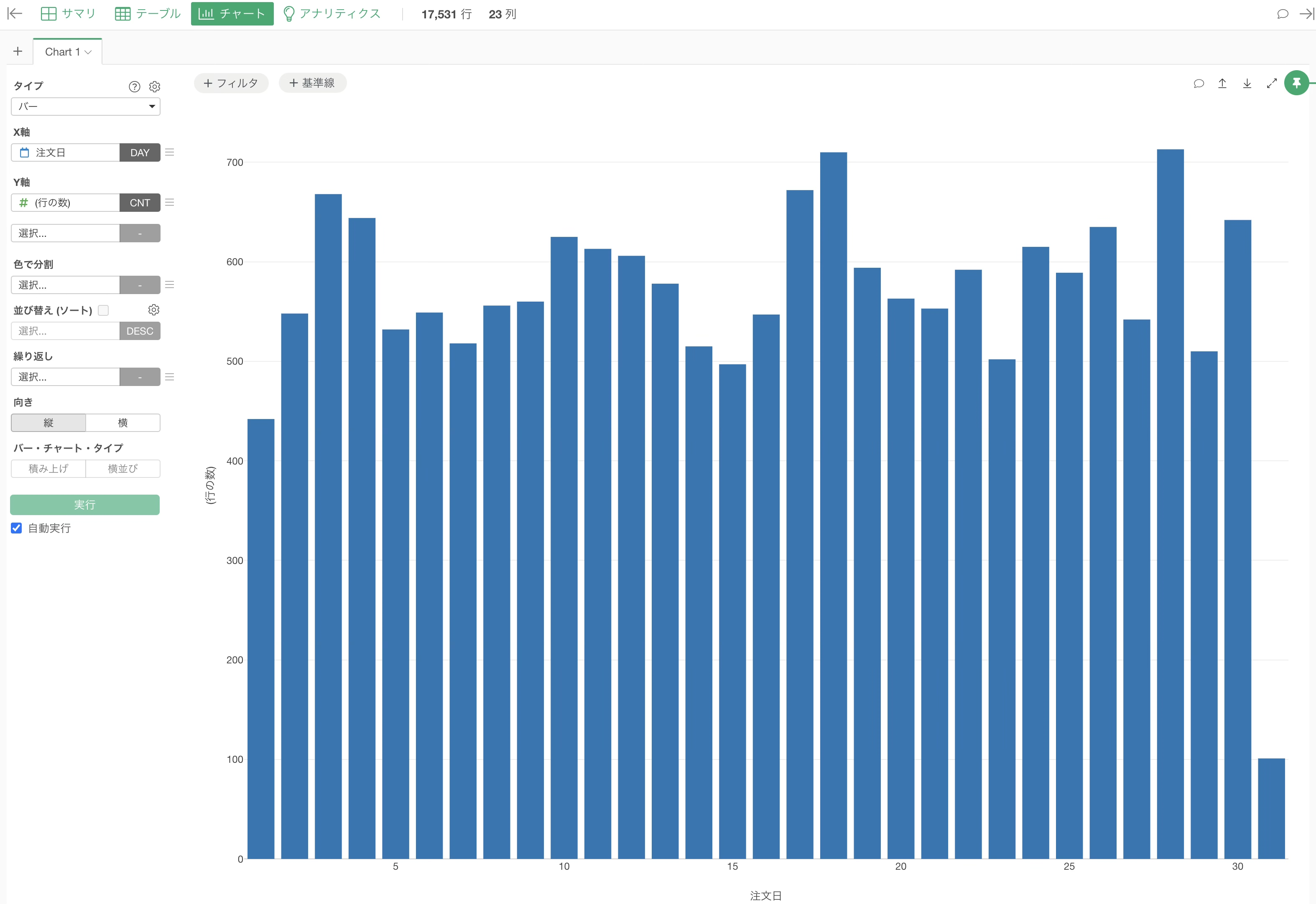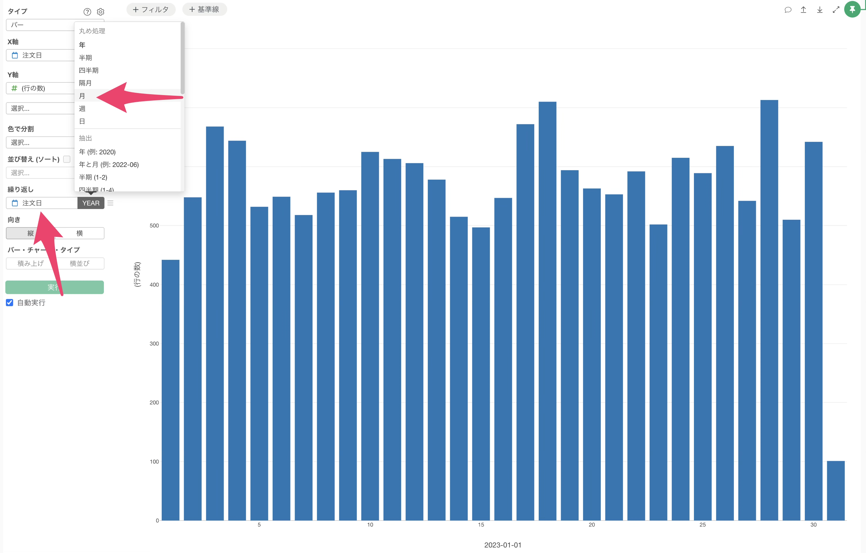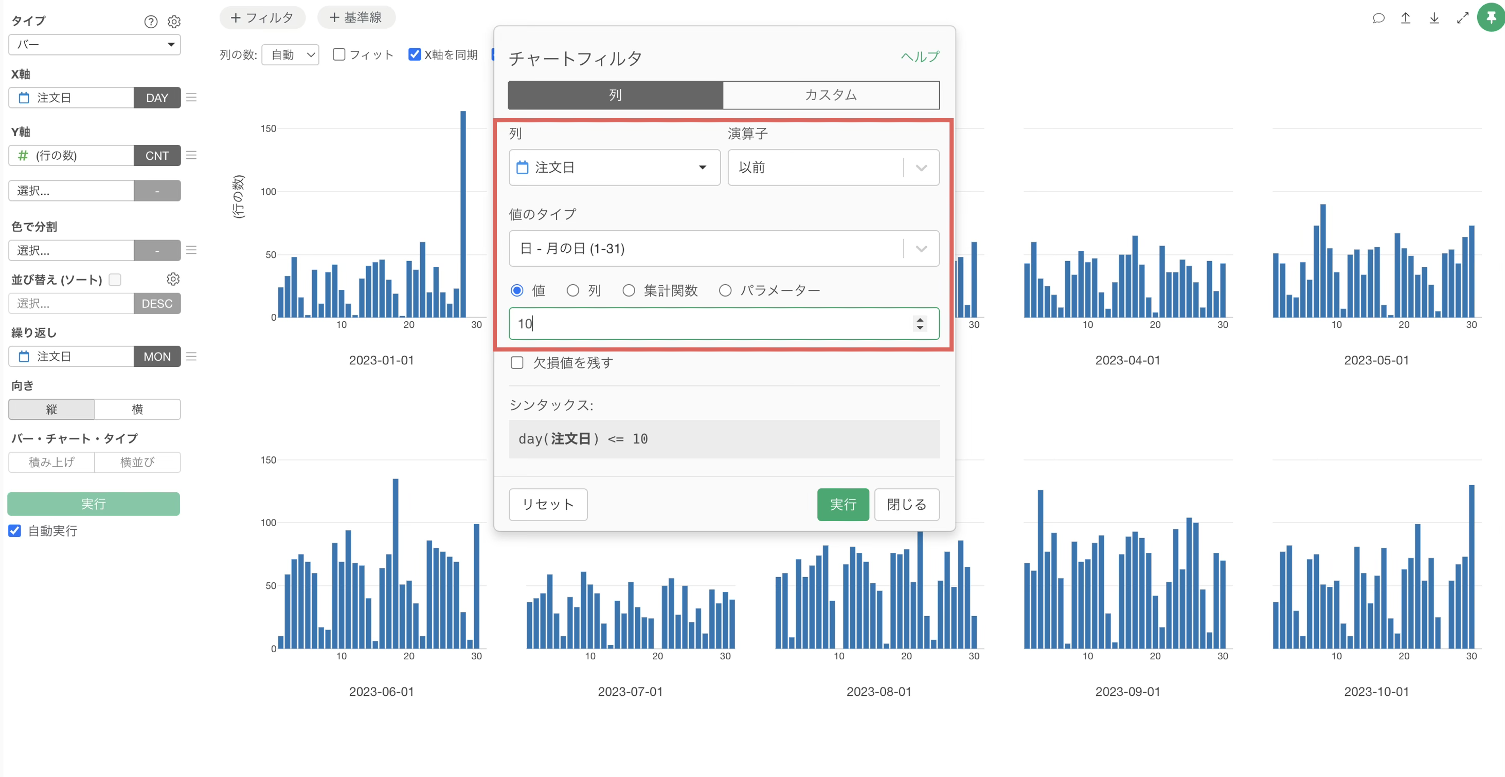 チャートビューに切り替え、チャートタイプに「バー」、X軸に「注文日」を選択し、今回は丸め処理ではなく「抽出」メニューで、「月の日」で抽出に設定します。