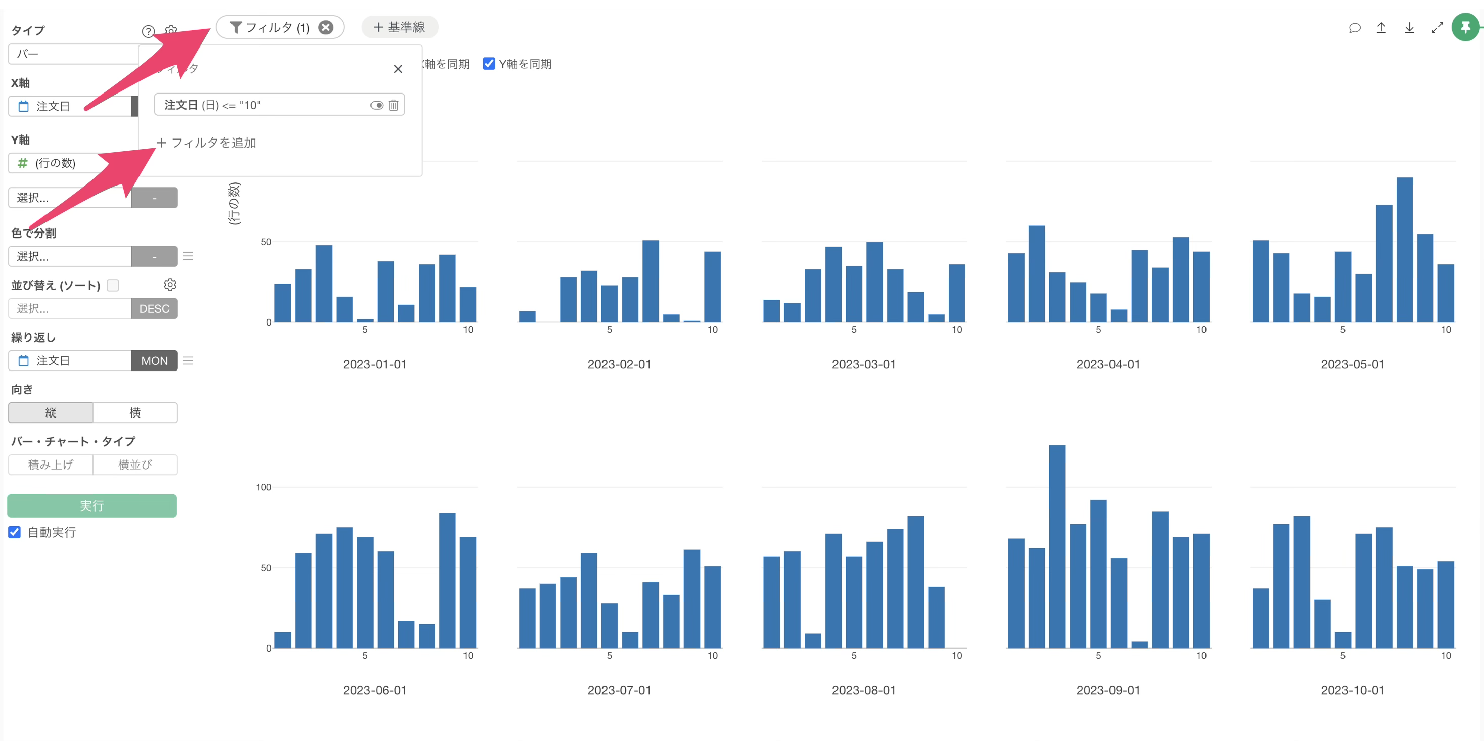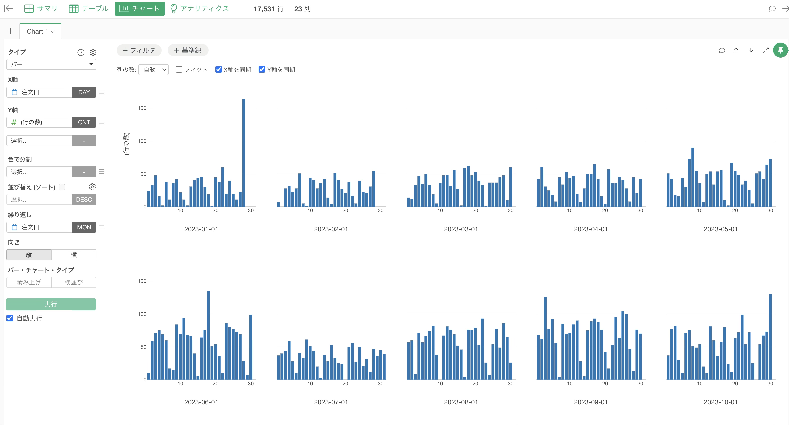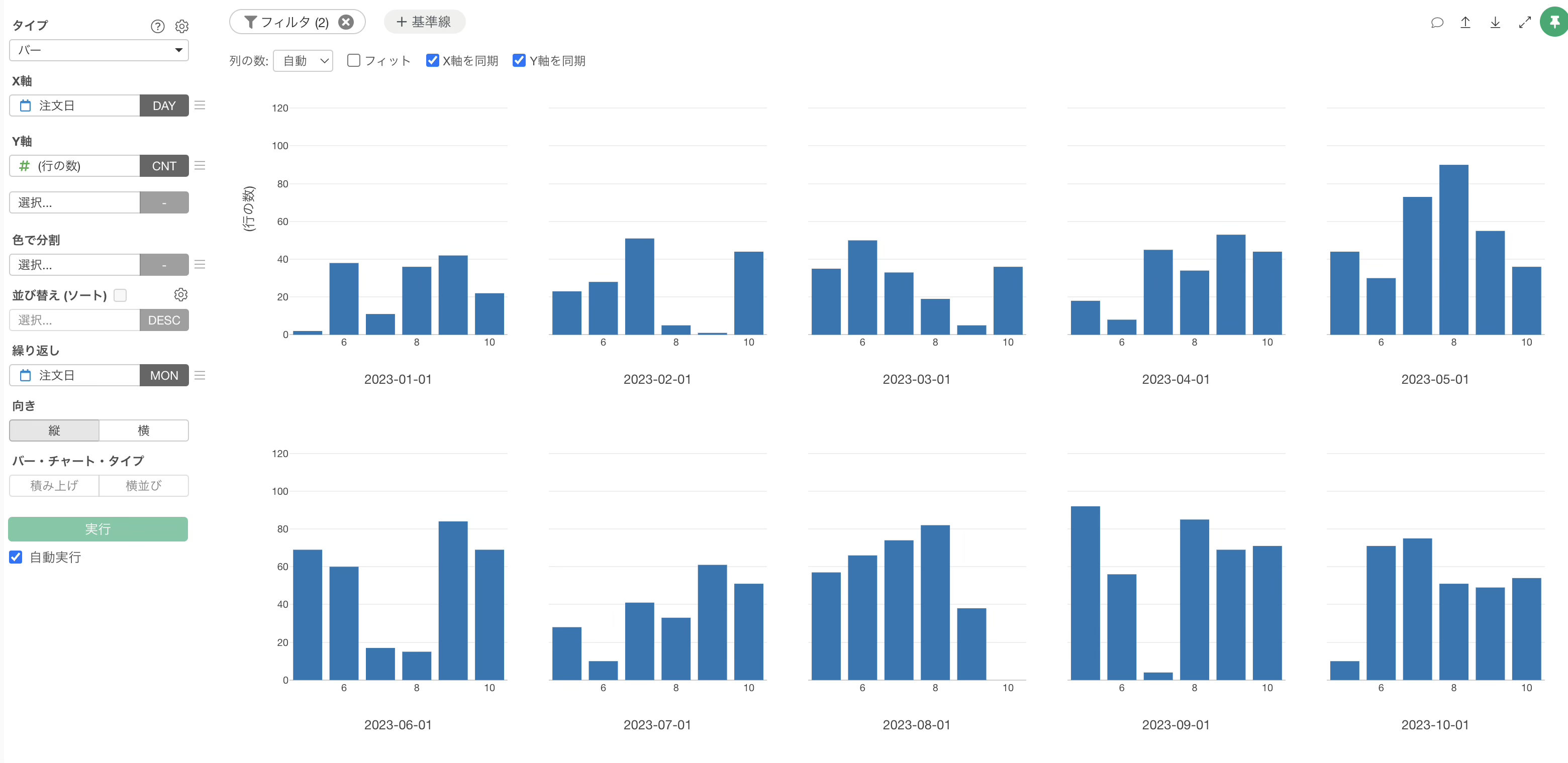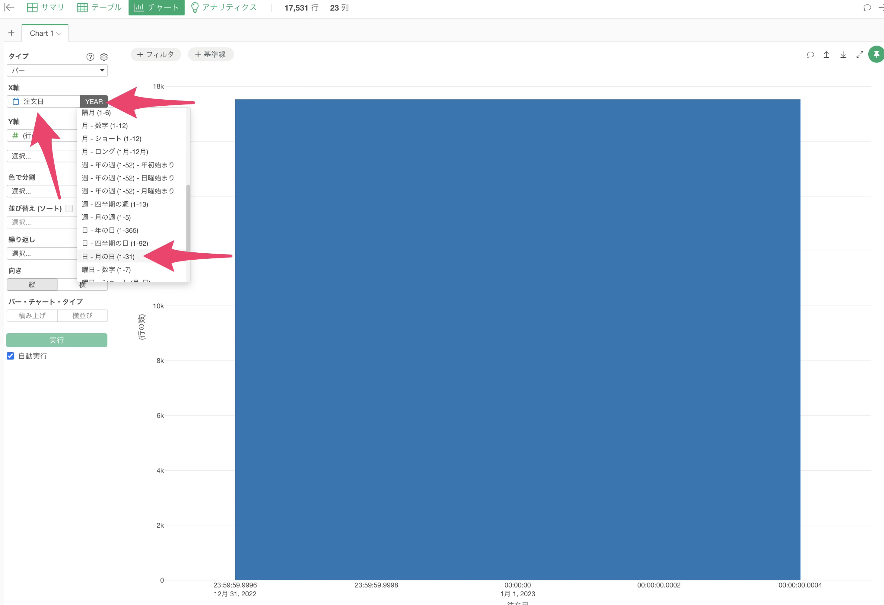 チャートビューに切り替え、チャートタイプに「バー」、X軸に「注文日」を選択し、今回は丸め処理ではなく「抽出」メニューで、「月の日」で抽出に設定します。