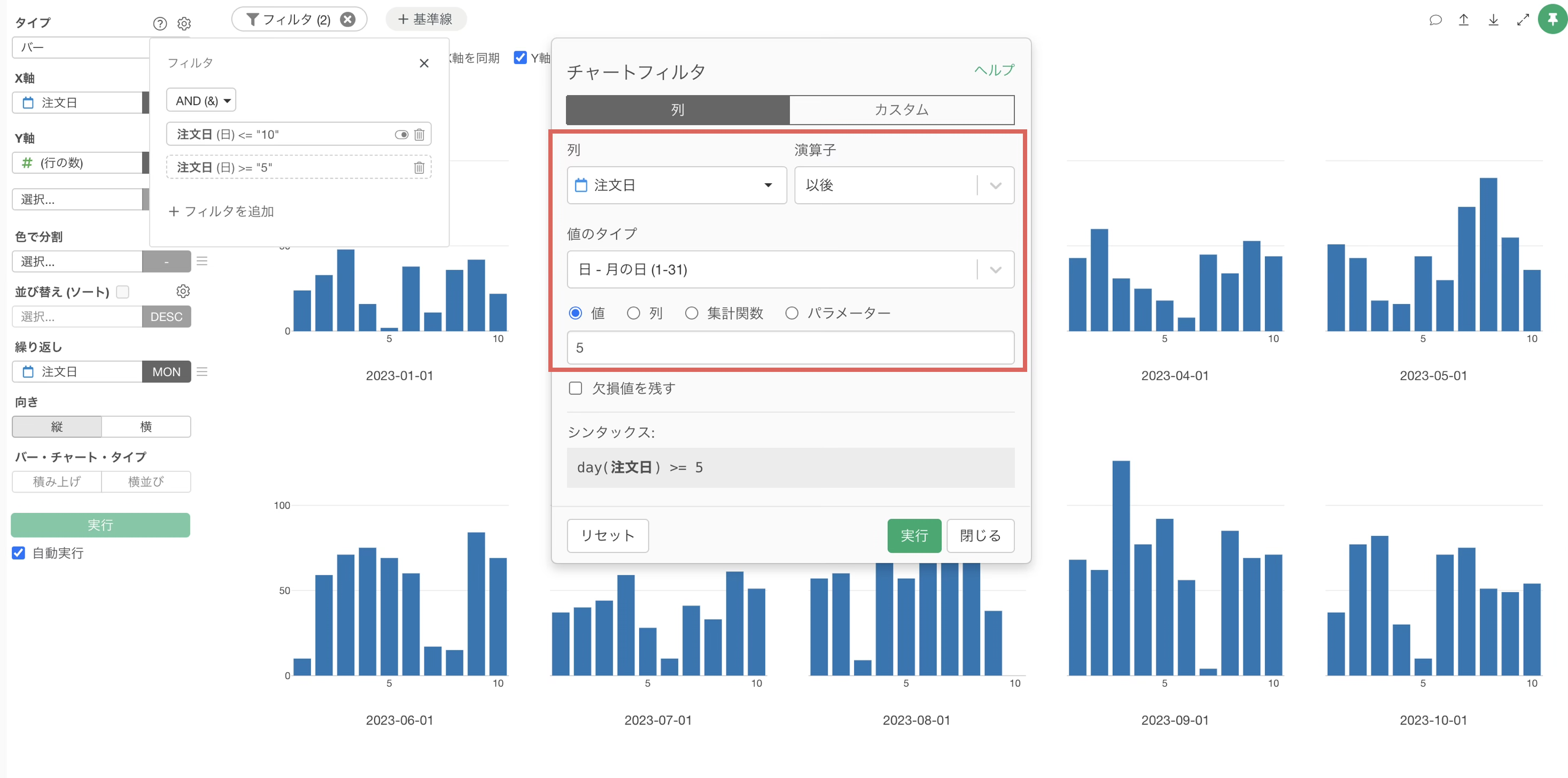 チャートフィルターのダイアログが表示されたら、演算子に「以降」、値のタイプに「月の日」を選択し、値に「5」と入力し、実行ボタンをクリックします。