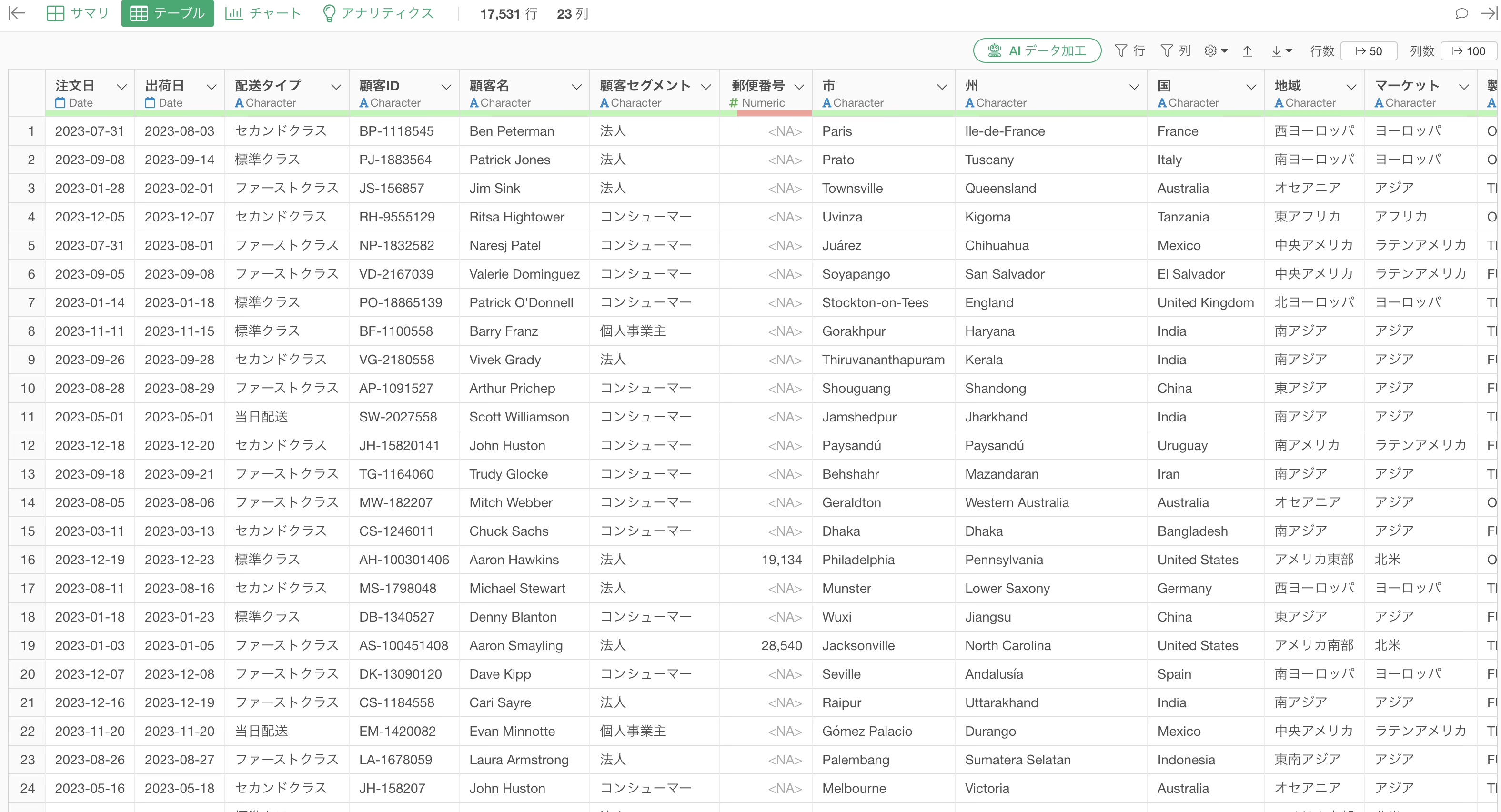 今回は1行が1つの注文を表し、列には顧客情報、注文日、商品情報、売上金額などの情報を持つ注文データを利用します。