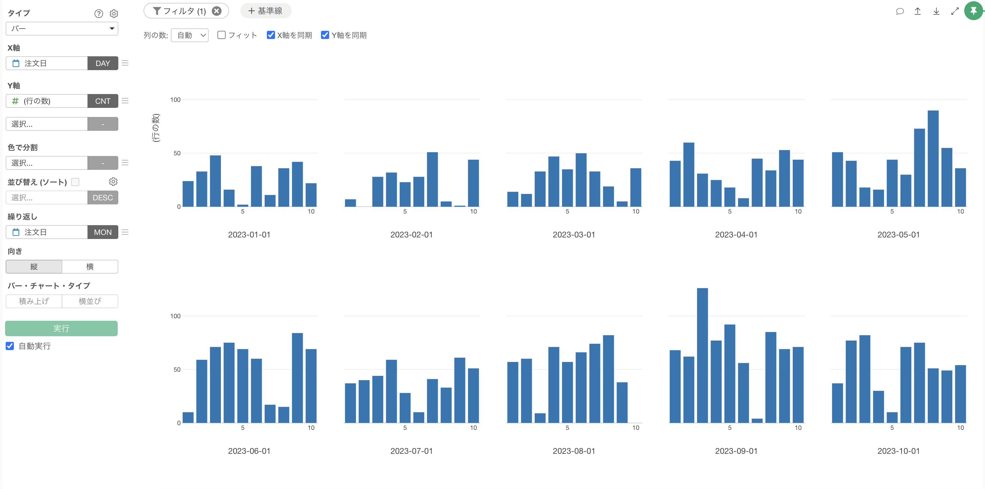 例えば、毎月の売上を日別に比較したい場合、注文日から「月の日」を抽出してX軸に設定すれば、1日から31日までの売上を並べて表示できます。さらに、繰り返し機能に月を設定することで、月ごとの日別売上を一覧で比較することが可能です。