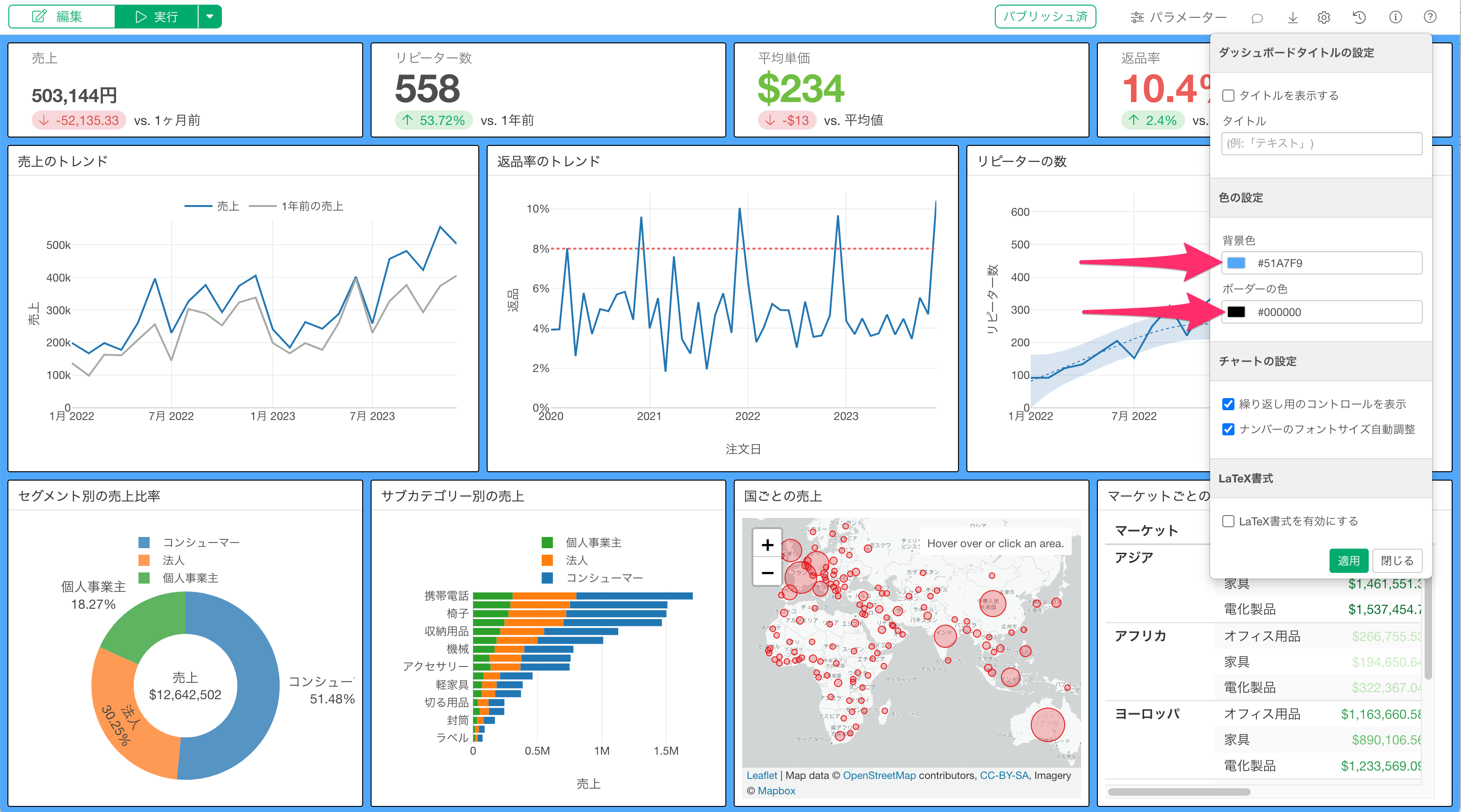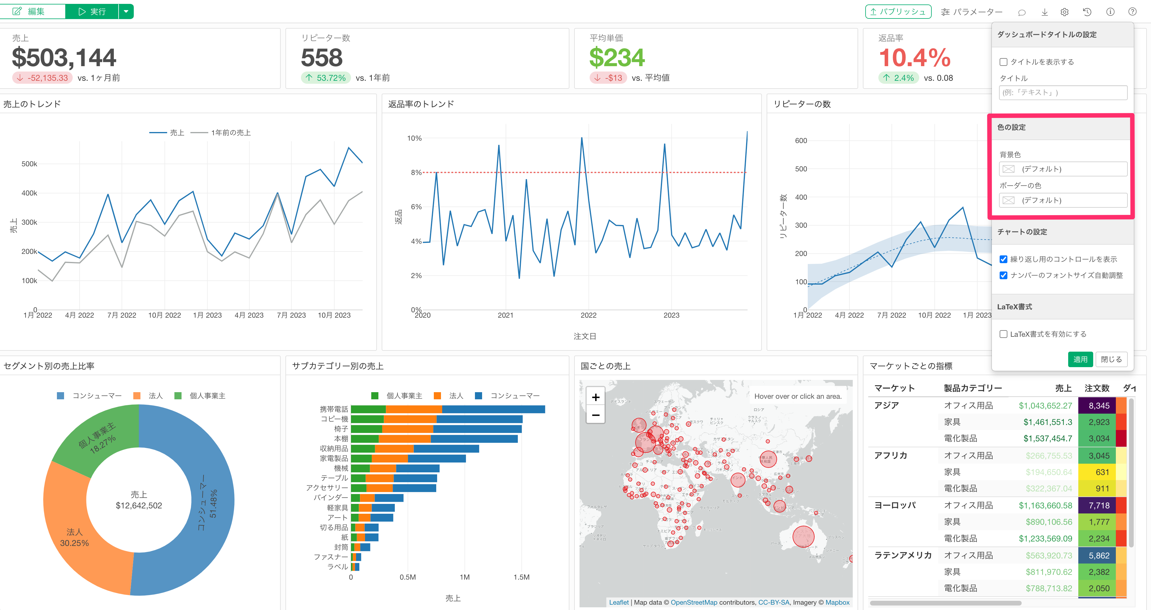 Exploratoryのバージョン14.5から、ダッシュボードの背景色とボーダー(枠線)の色をカスタマイズできる機能が追加されました。ダッシュボードの設定から一括で変更でき、背景色とボーダーの色は独立して設定できます。