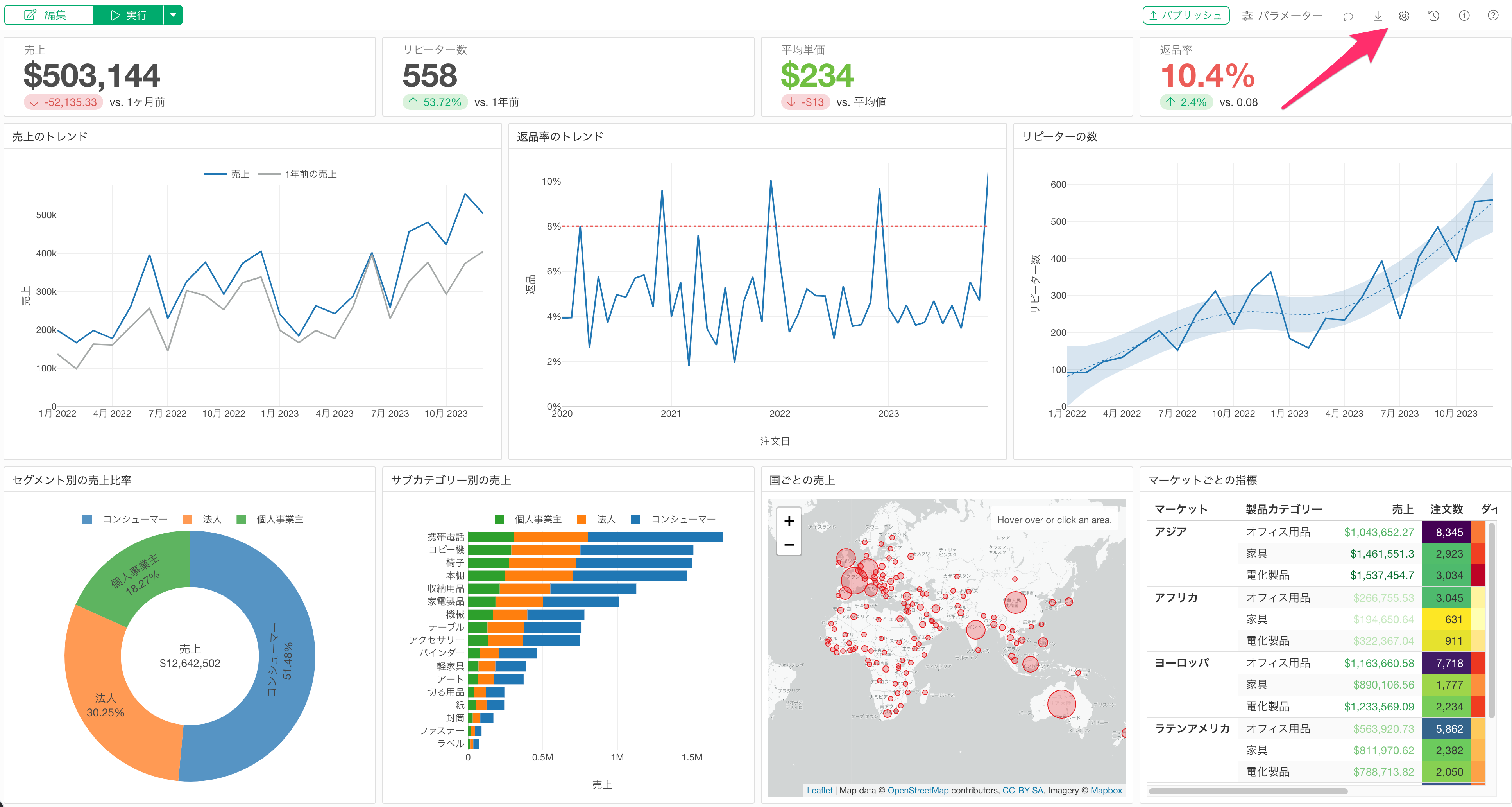 2つの設定は独立しているため、どちらか一方だけを変更することも可能です。今回は事前に作成した売上に関するダッシュボードを利用します。