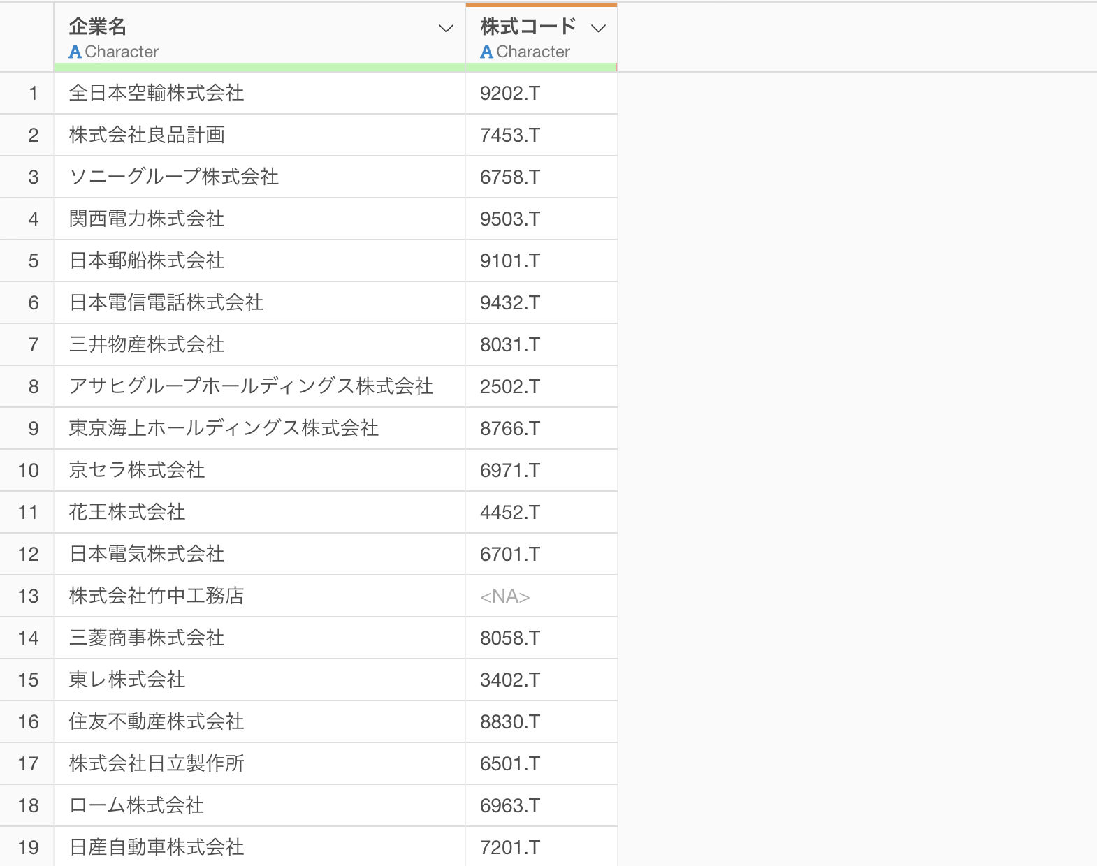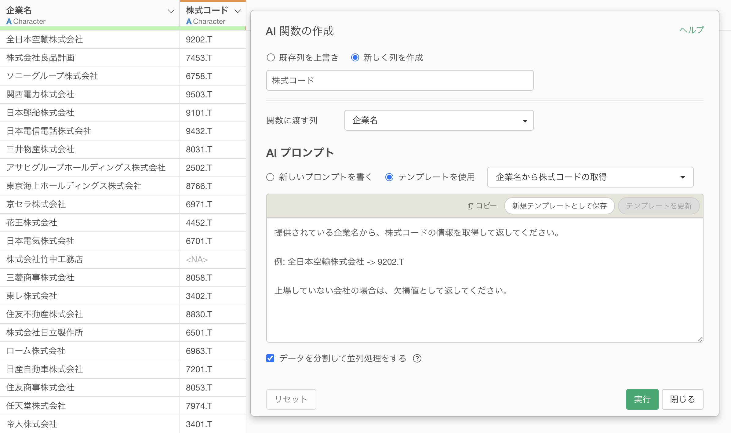 実行することで、AIが各企業名を判断し、「9202.T(ANAホールディングス)」や「7453.T(良品計画)」といった株式コードの列が自動的に生成されます。上場廃止や非上場の企業については、指示通り欠損値として処理されます。