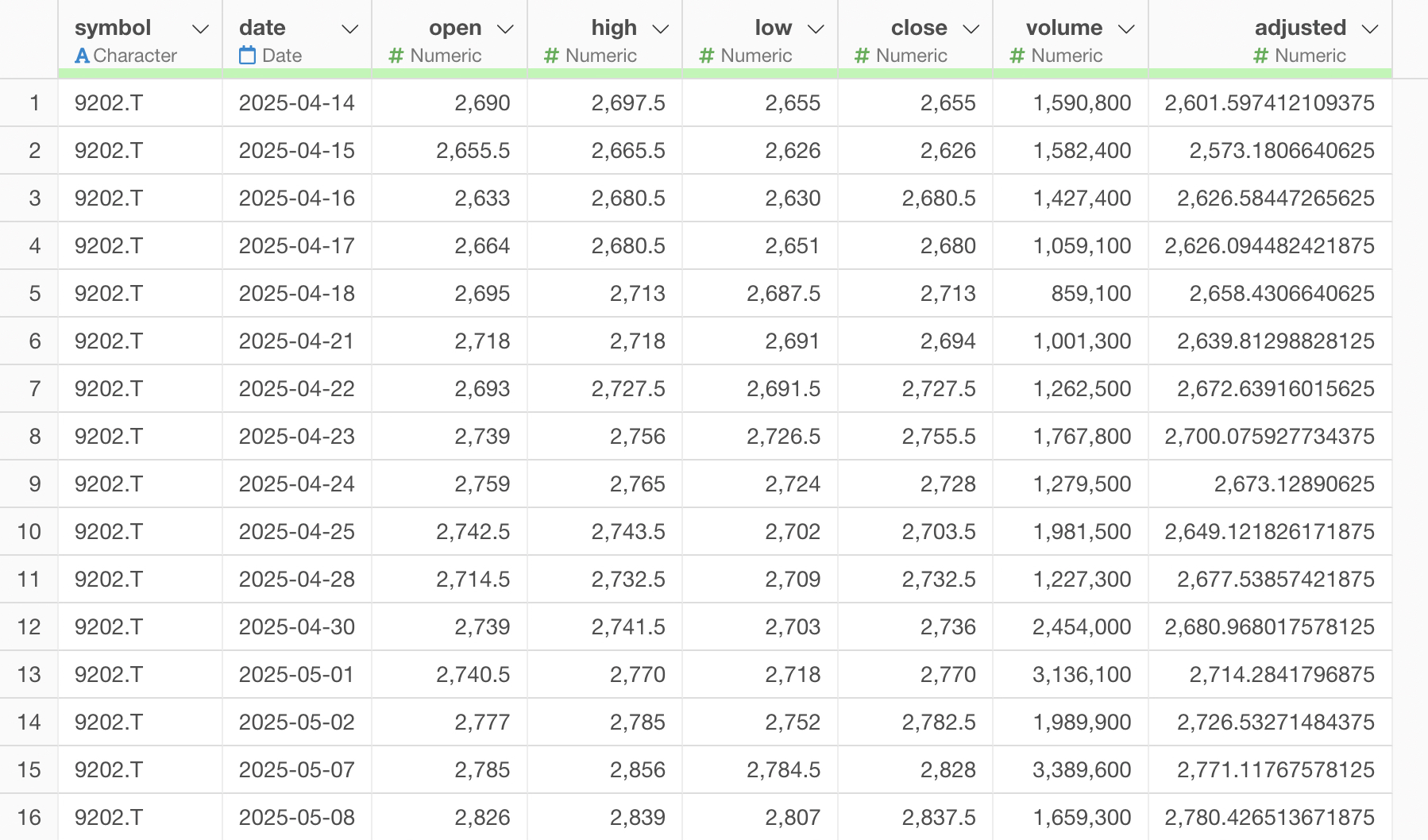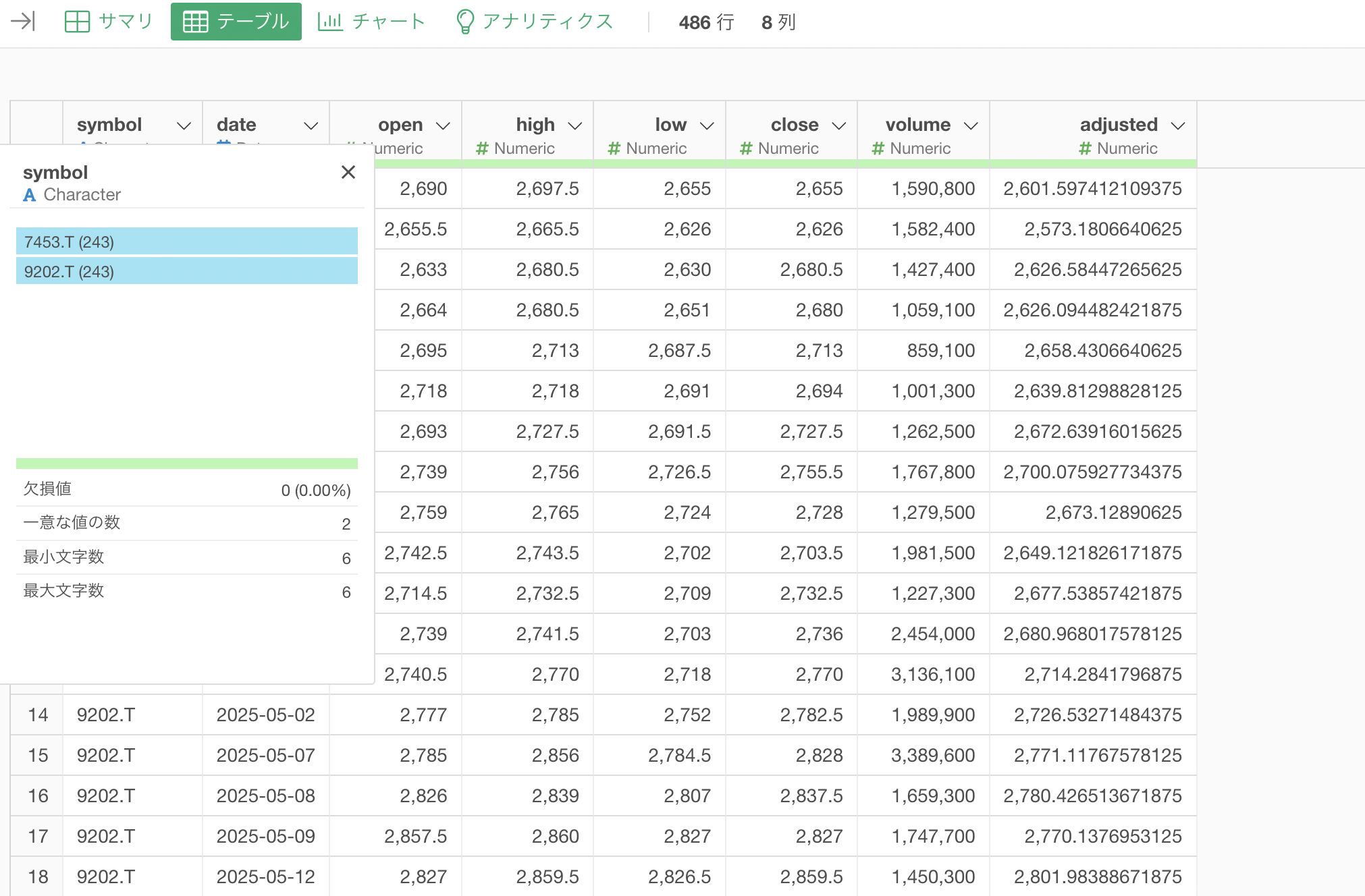 取得されたデータには、日付ごとの始値、高値、安値、終値、出来高などが含まれており、即座に時系列分析や可視化を行うことが可能な状態になります。