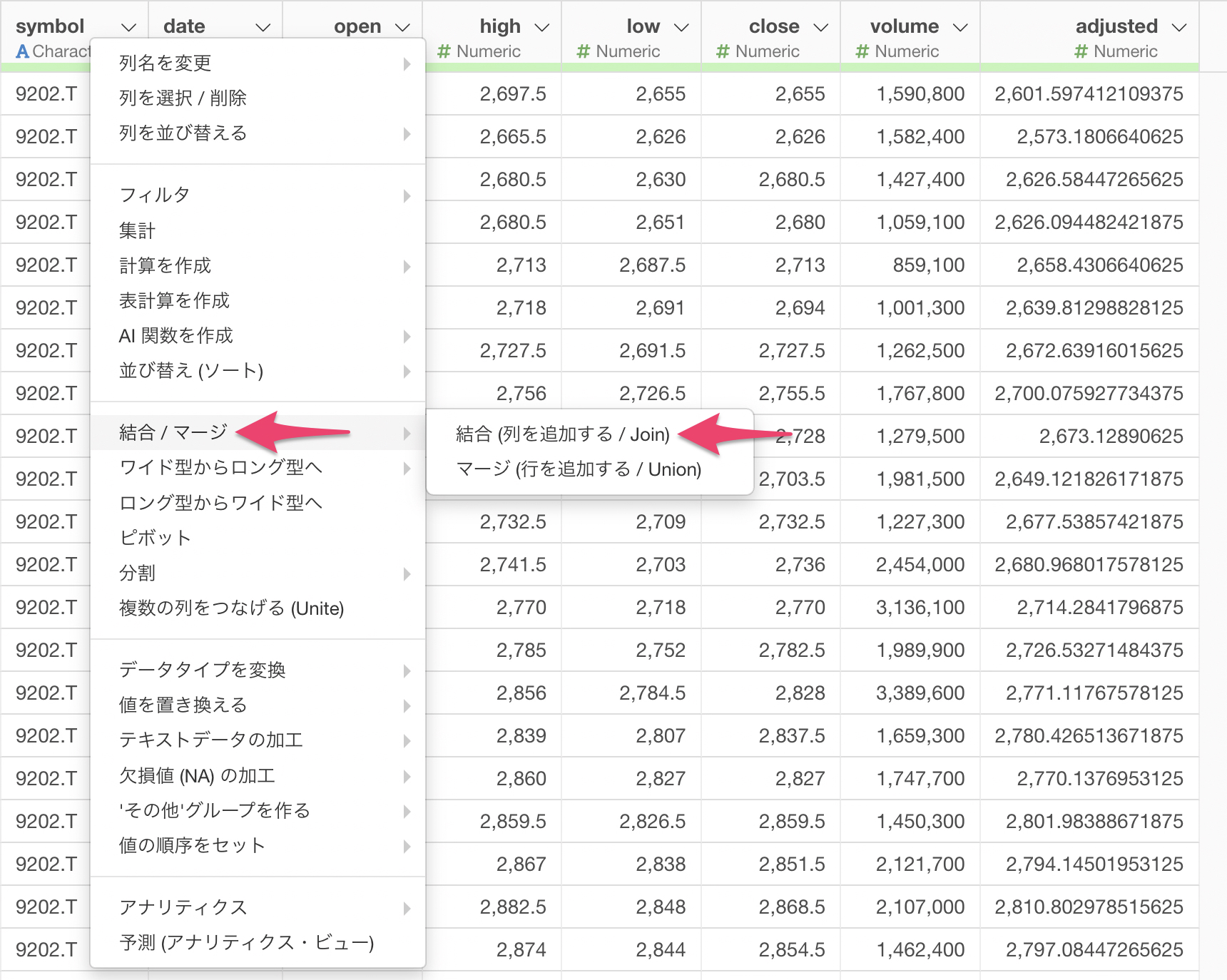 株価データの列ヘッダメニューから「結合(Join)」を選択し、結合先に先ほどの企業リストを指定します。