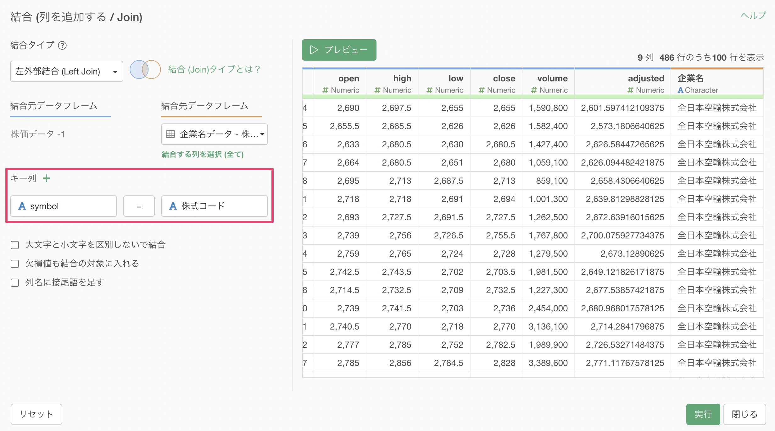 左側のキーに「シンボル(Symbol)」、右側のキーに「株式コード」を選択して実行します。