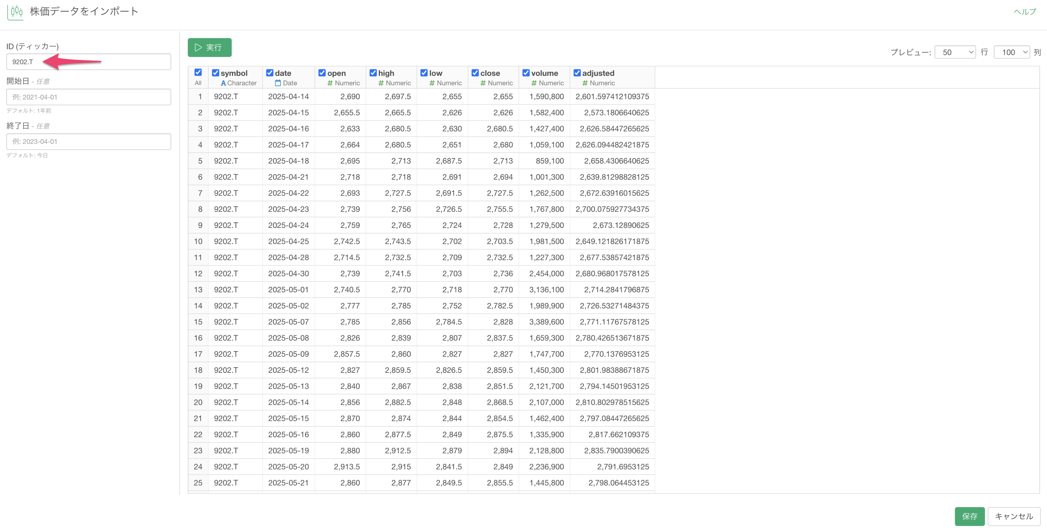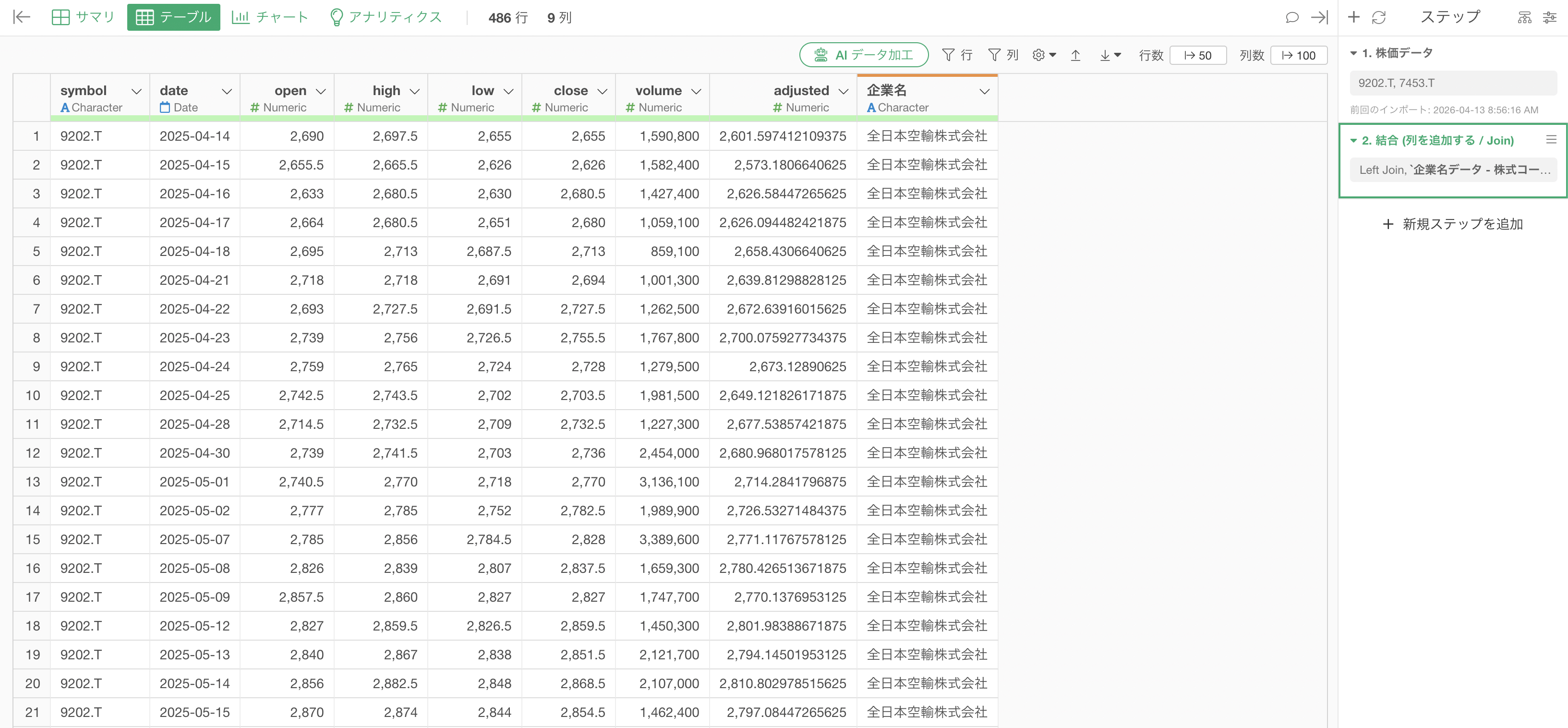 取得した株式コードを利用して、実際の株価データをExploratoryにインポートします。
