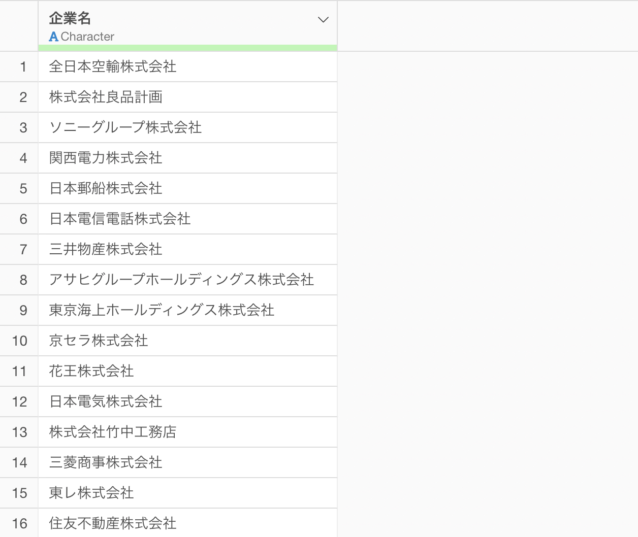 今回使用するデータは、1行が1企業名となっているシンプルなリストです。この企業名をもとに、AI 関数を活用して株式コードを特定します。