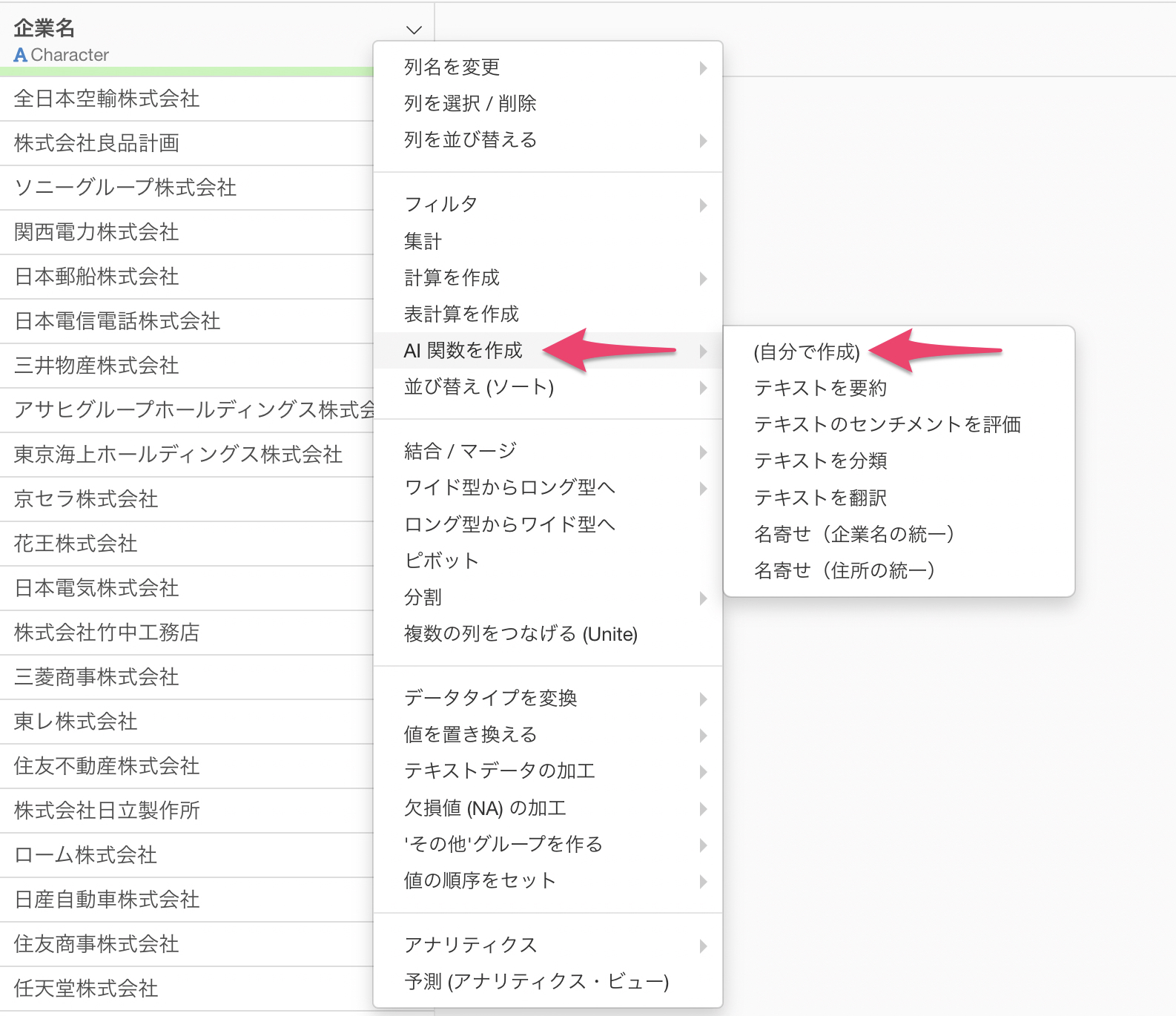 企業名が格納されている列のヘッダメニューから「AI関数を作成」を選択し、さらに「自分で作成」をクリックします。