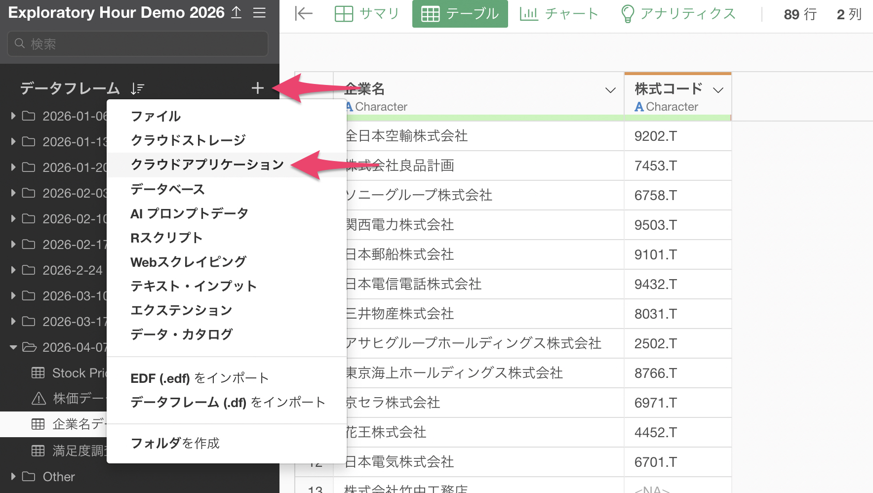 「データフレーム」のプラスボタンから「クラウドアプリケーション」を選択します。