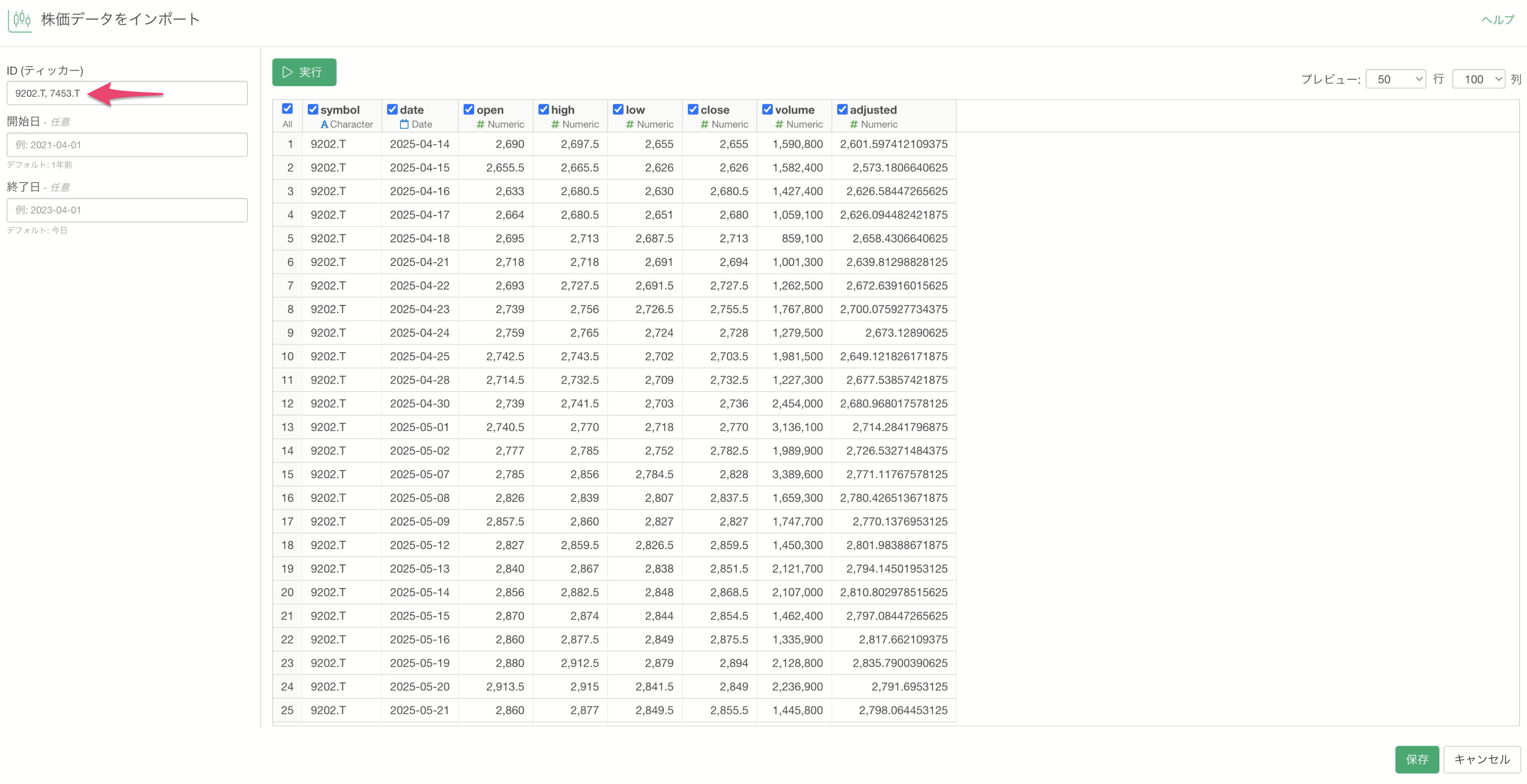 複数の企業のデータを一度に取得したい場合は、コードをカンマ区切りで指定します。例えば「9202.T, 7453.T」と入力して実行することで、それぞれの企業の時系列株価データが一括でインポートされます。