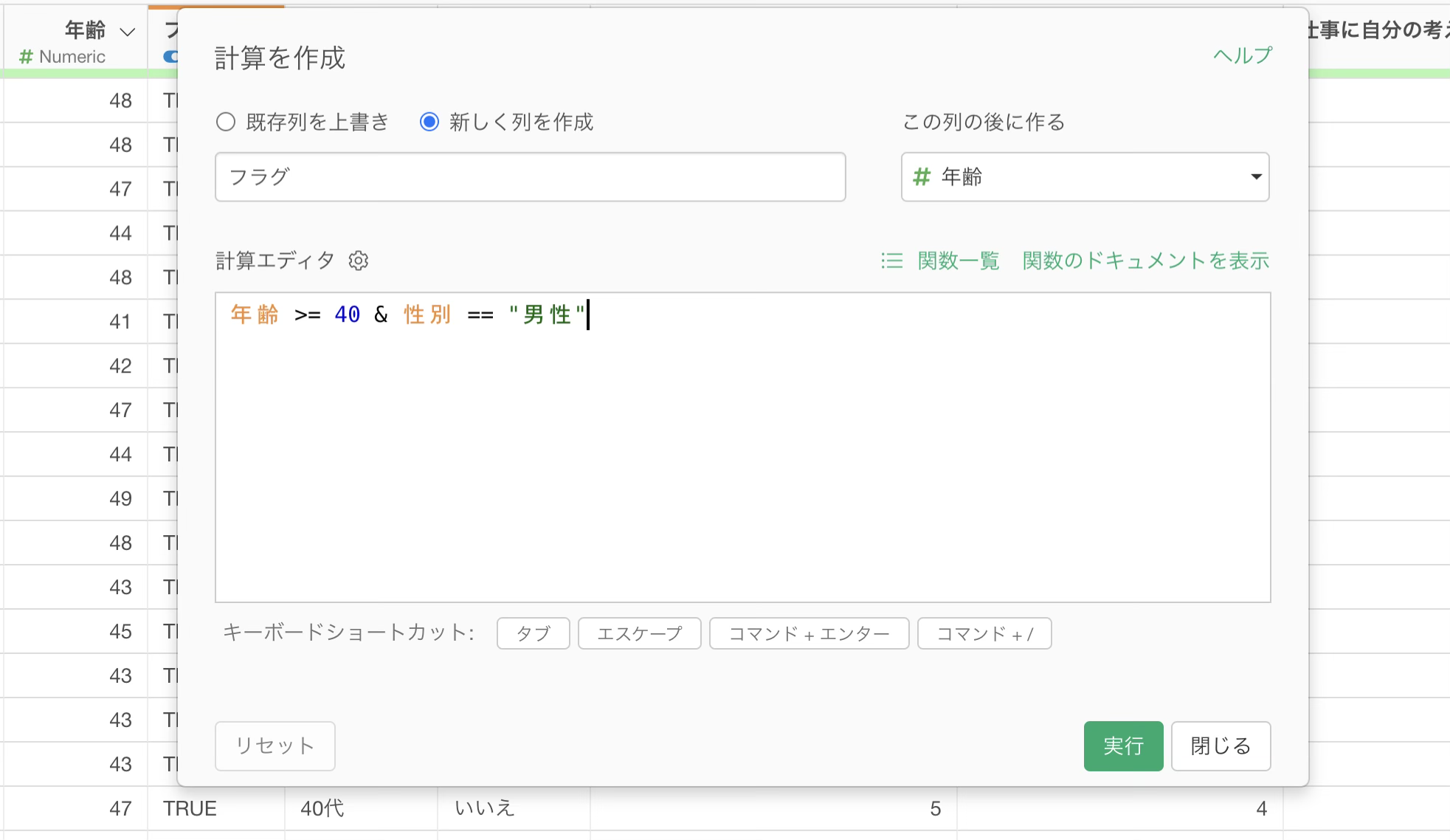 計算エディターのダイアログを開き、まず年齢 >= 40 & 性別 == "男性"の部分を括弧でくくって1つのグループ条件とします。