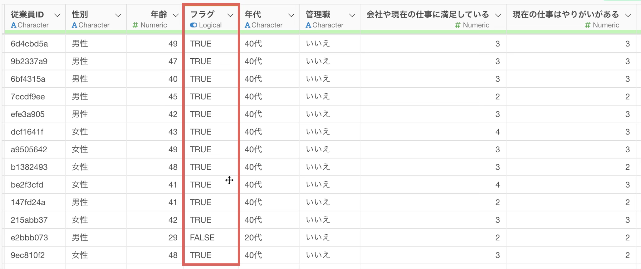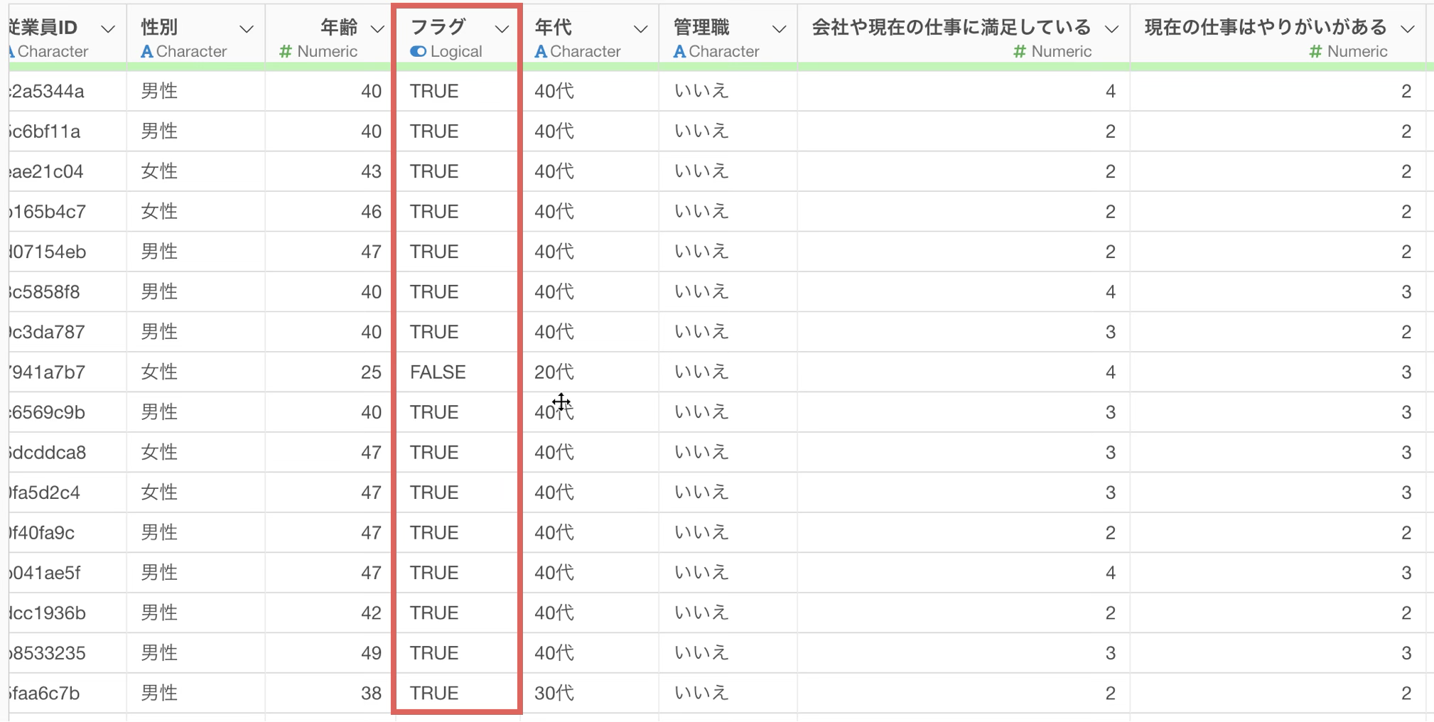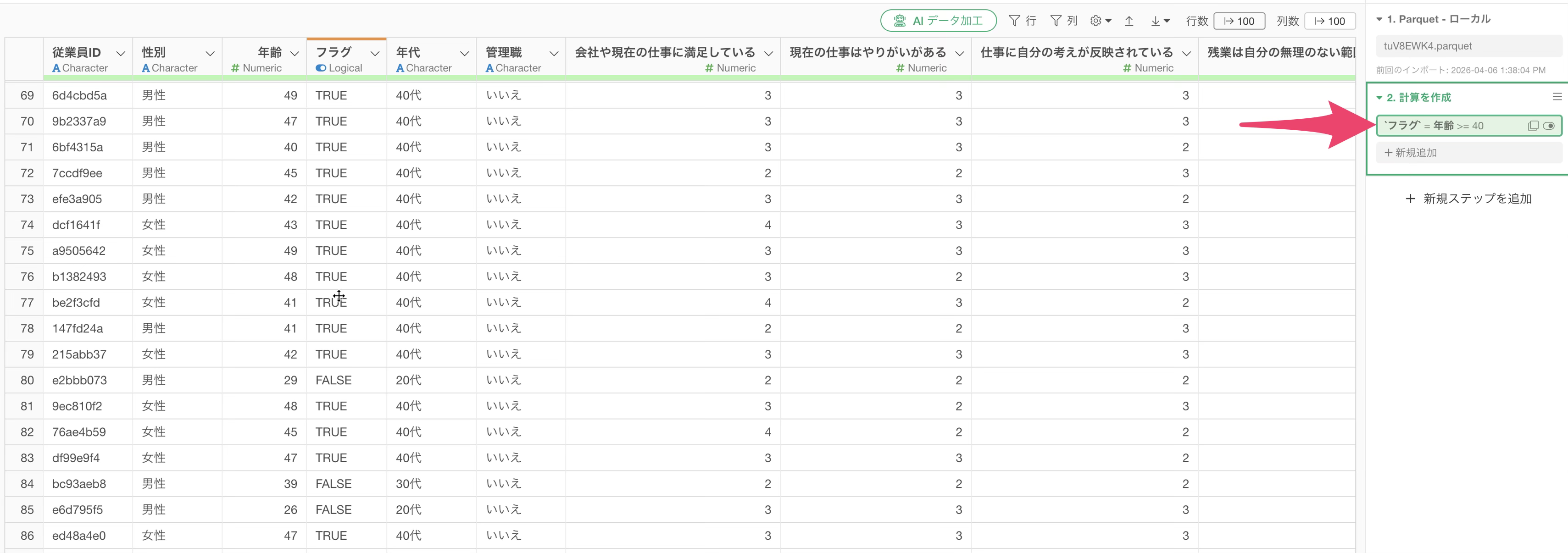 これで年齢が40歳以上の行にはTRUE、それ以外の行にはFALSEが設定されたフラグ列が作成できました。
