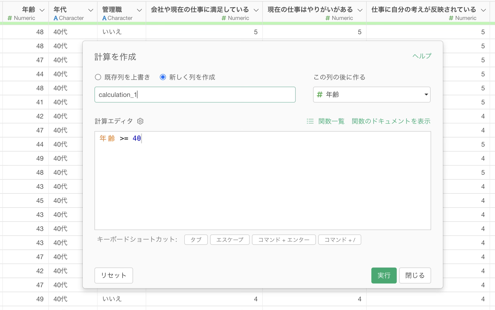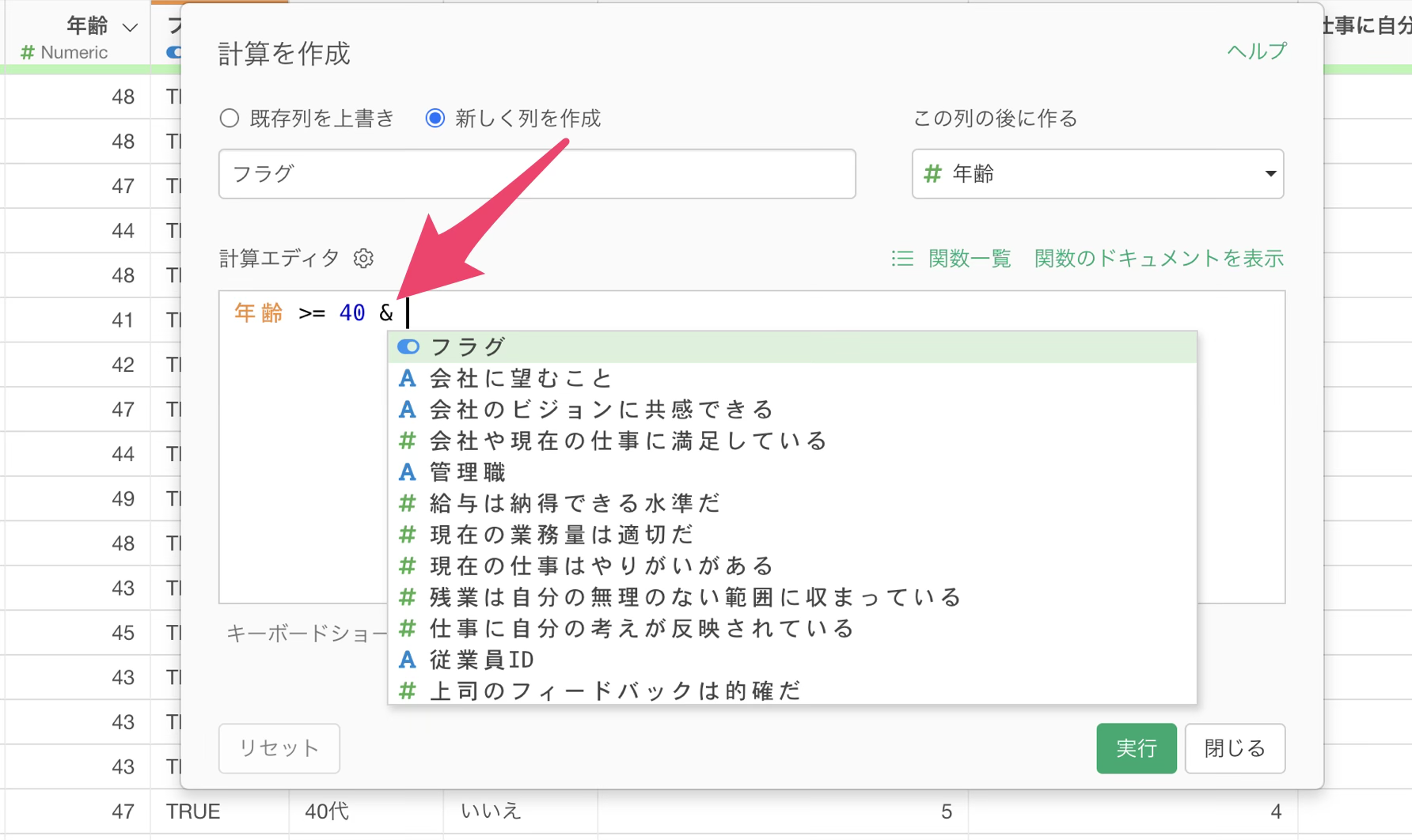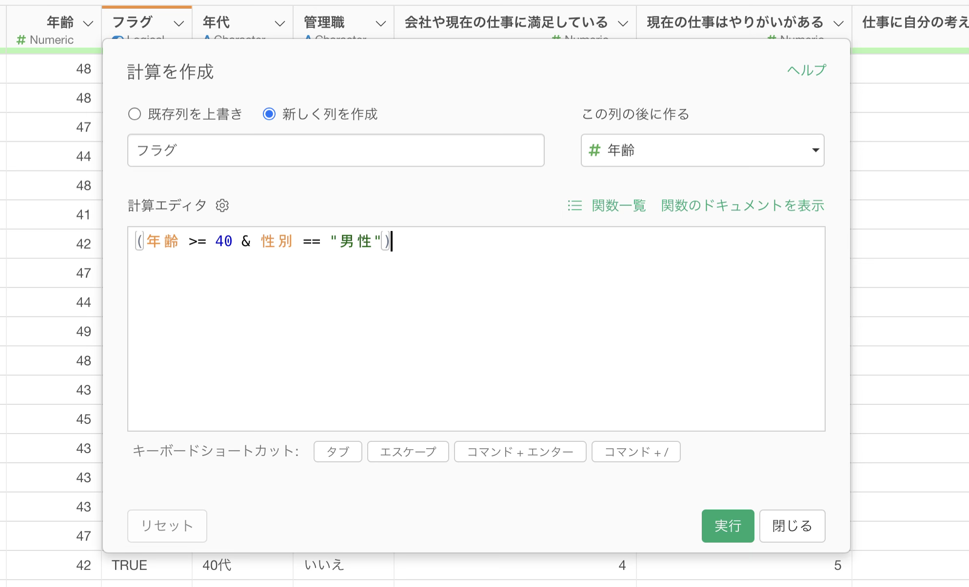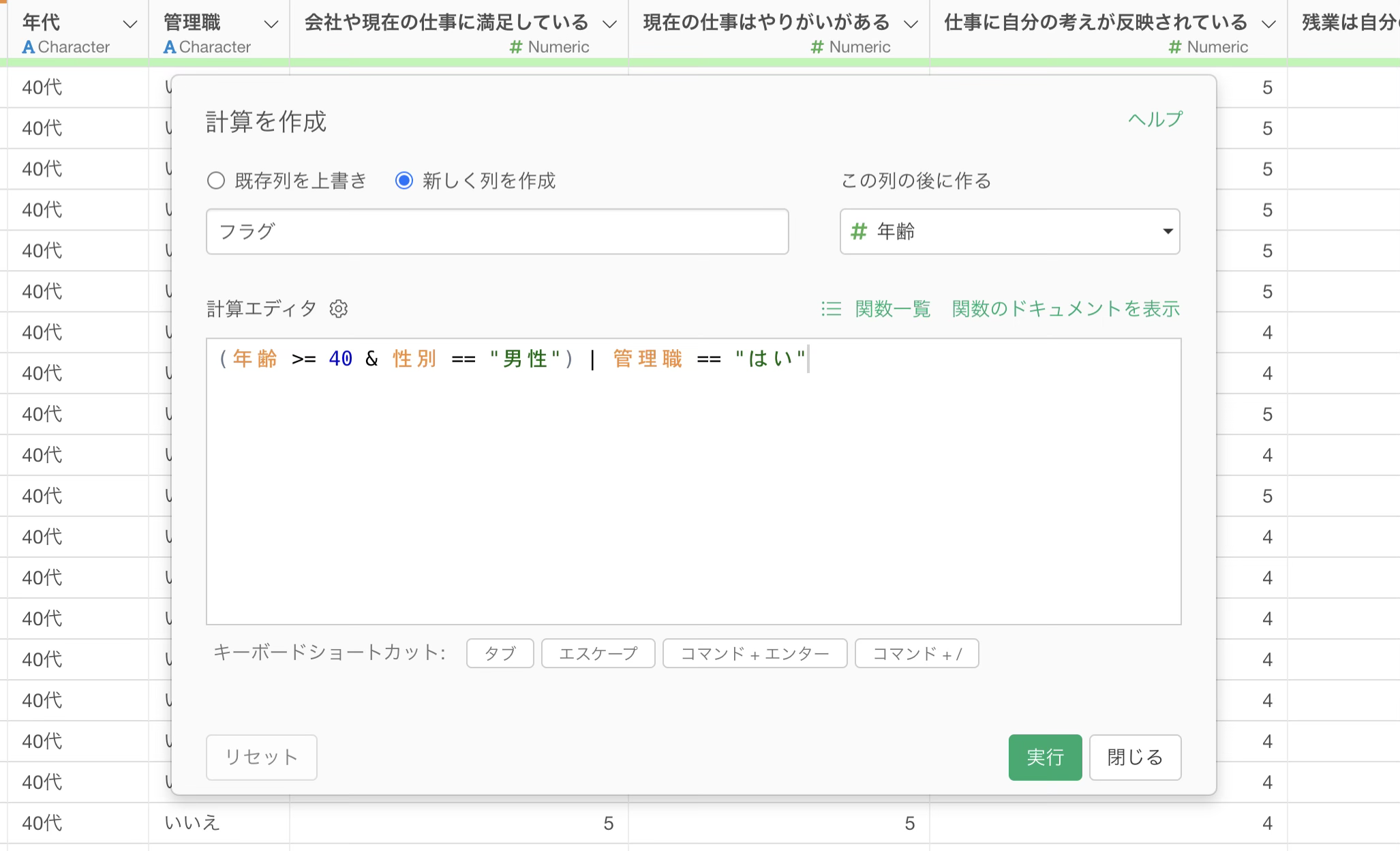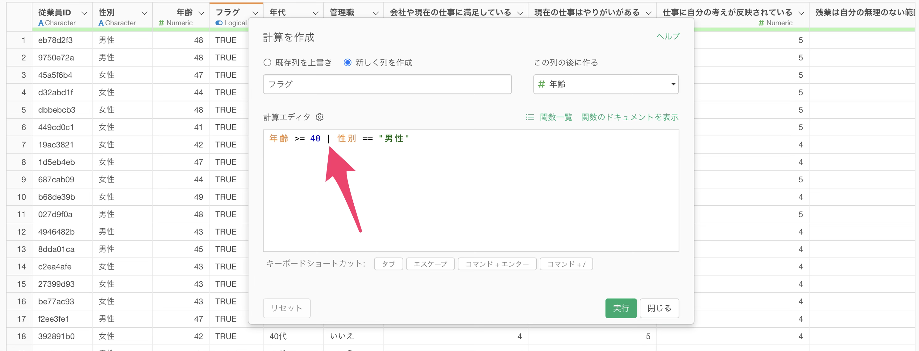 次に|を入力してOR条件を追加し、続けて管理職 == "はい"と入力します。これにより(年齢 >= 40 & 性別 == "男性") | 管理職 == "はい"という計算式が完成します。