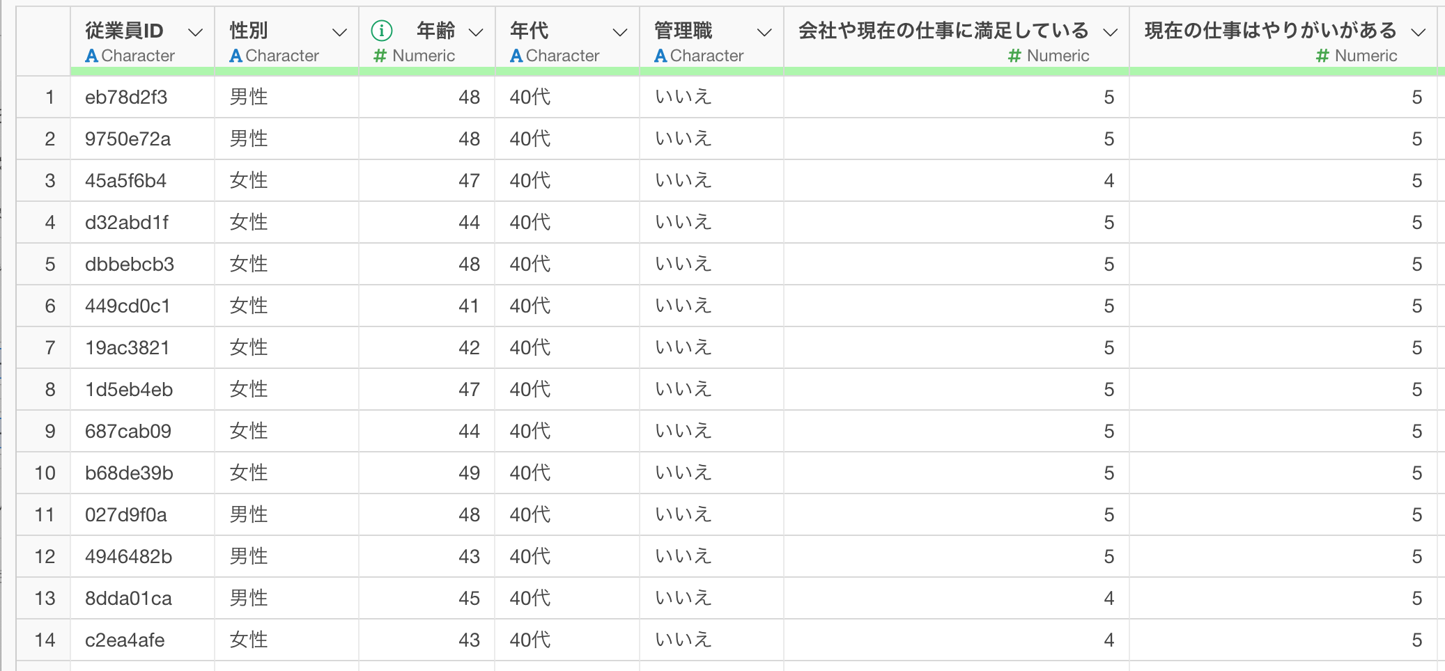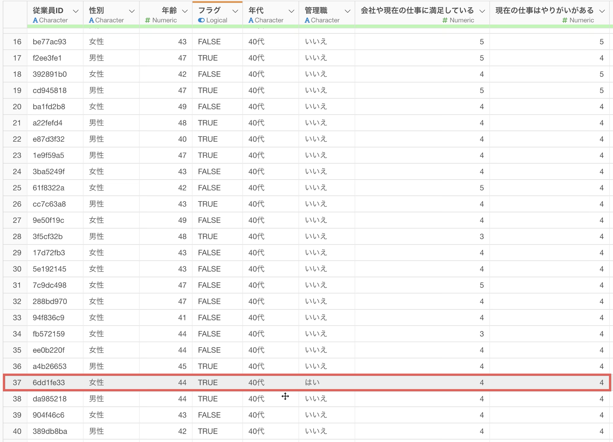 今回は1行が1人の回答者を表し、列には年齢・性別・管理職などの属性情報とアンケートのスコアが含まれているデータを利用します。