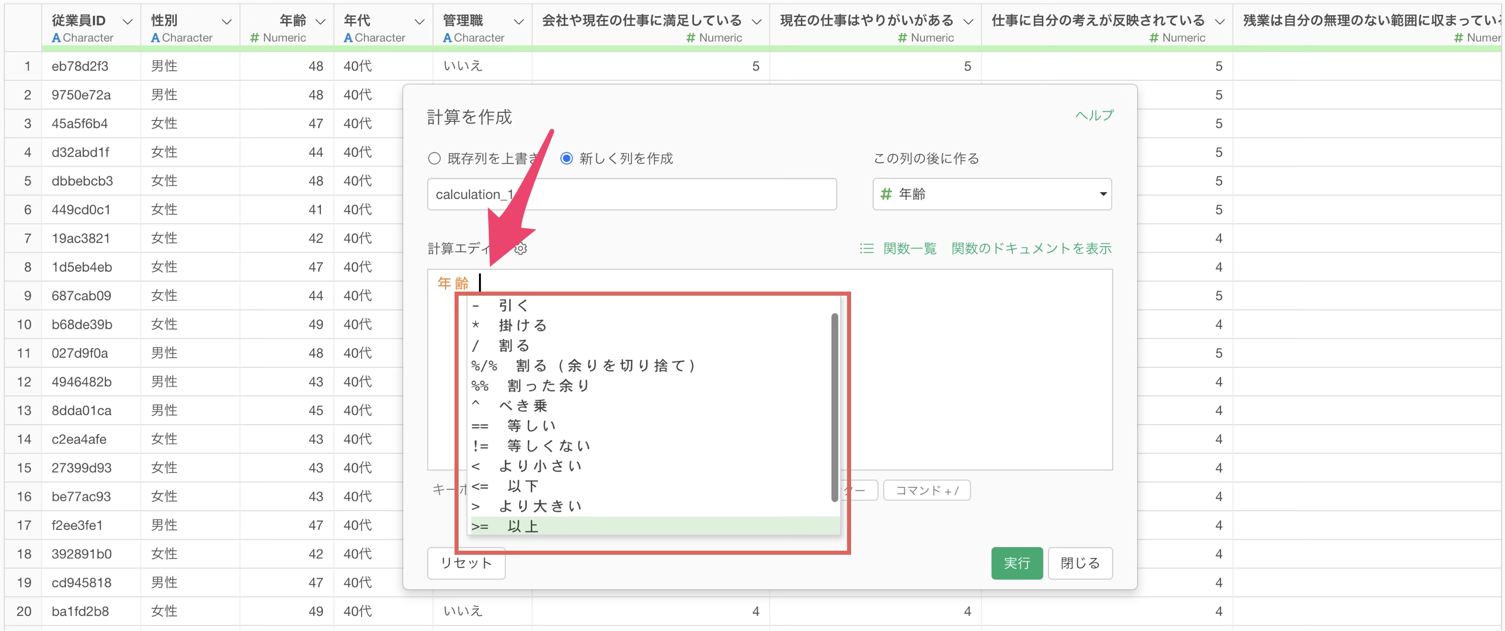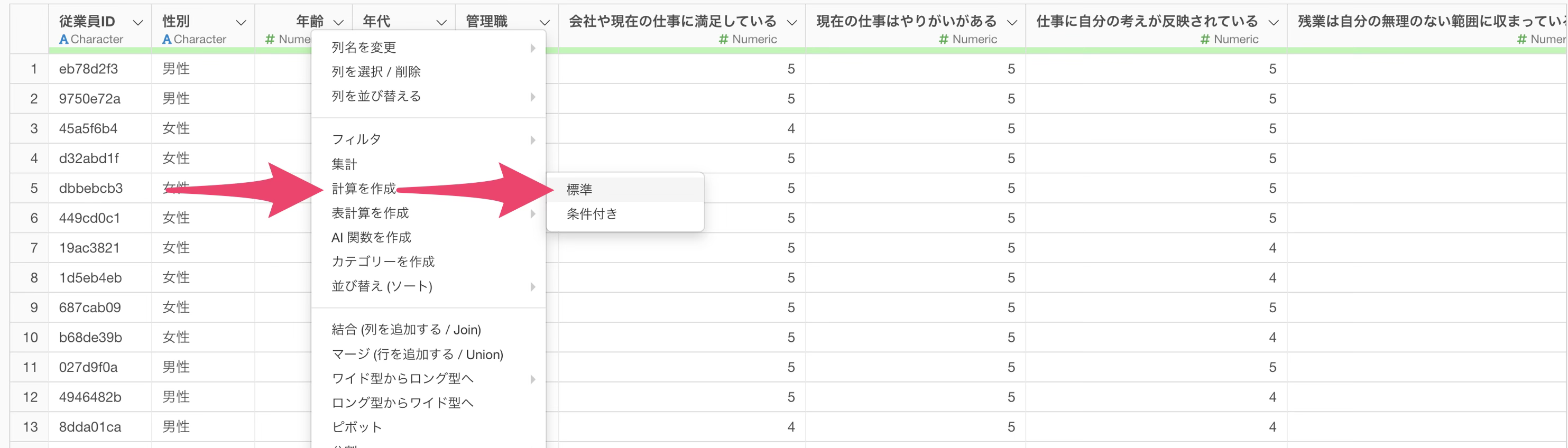 年齢列のヘッダーメニューから「計算を作成」の「標準」を選択します。