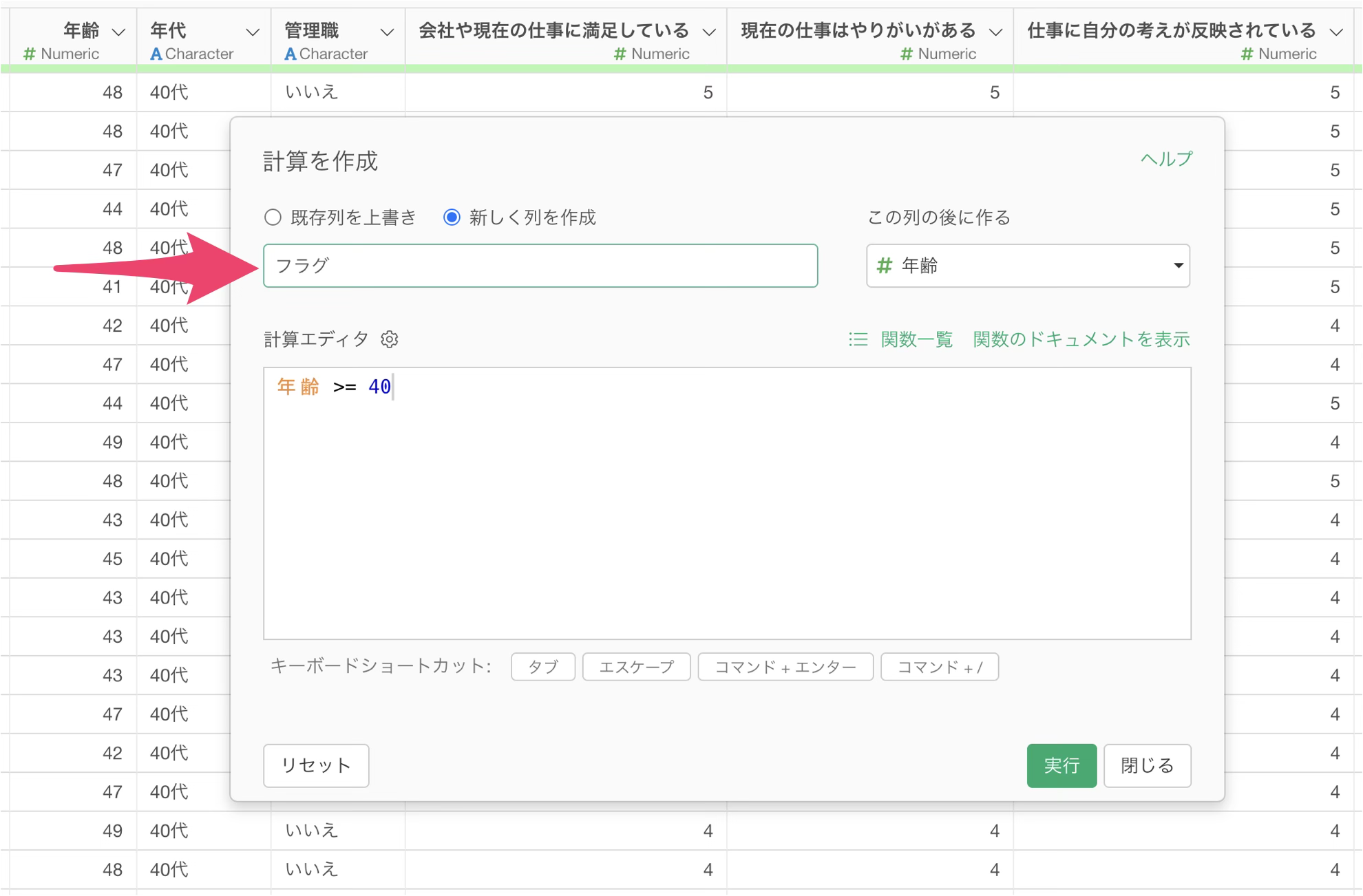 新しい列名に「フラグ」を入力し、実行ボタンをクリックします。