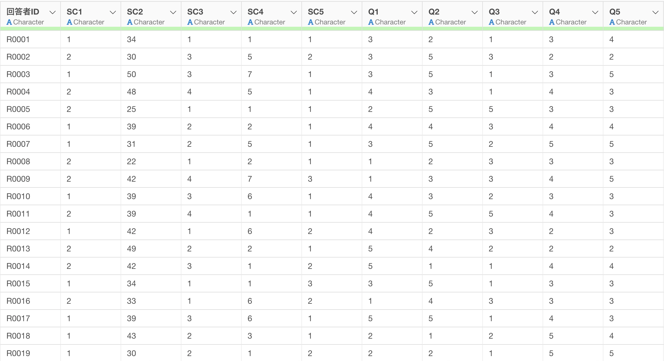 アンケートの回答データが「設問ごとに列が分かれている(ワイド型)」の状態では、外部のラベル対応表(マスターデータ)と一括で結合してラベルを置き換えることが困難です。また、回答コードが混在している場合、どの数値がどの意味を持つのかを個別に判断して置換していく作業は非常に手間がかかり、ミスの原因にもなります。