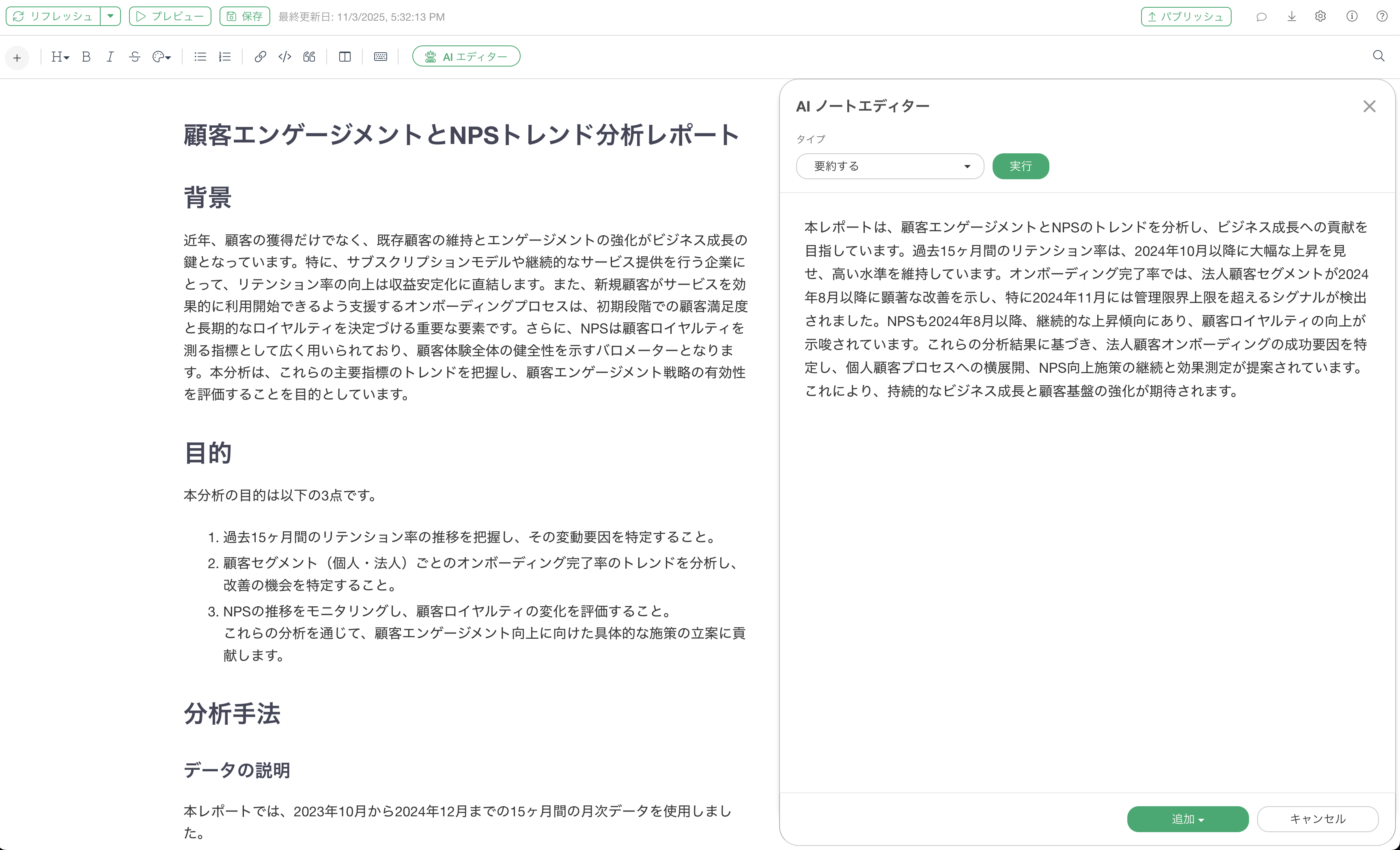 AI ノート エディターをはじめとする新機能を通して、データ分析におけるレポート作成の効率化をぜひ体験ください。