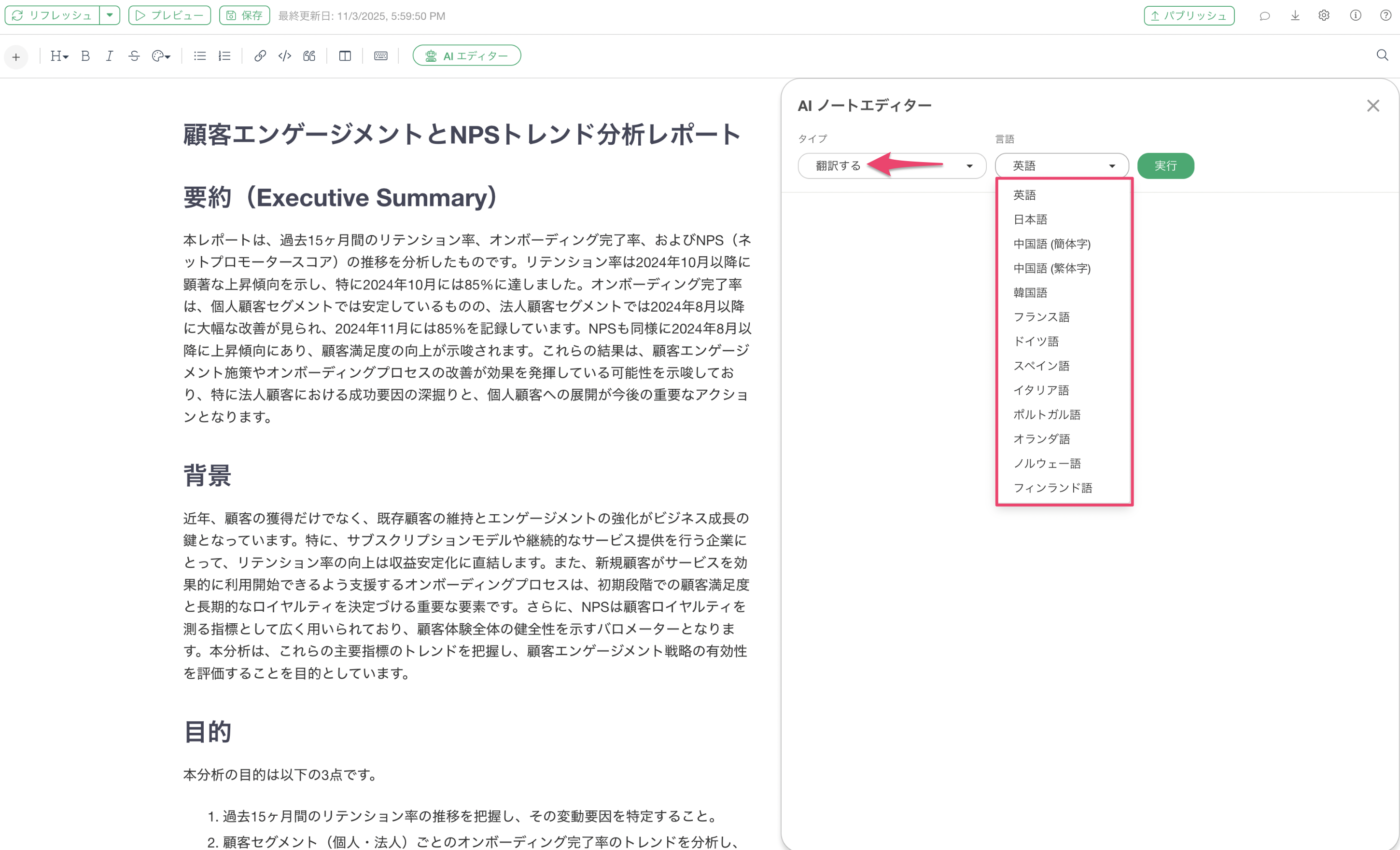 たとえば、日本語で作成したノートを英語版やフランス語版として公開したい場合、従来は別のツールで翻訳してからExploratoryに戻す必要がありましたが、AI ノート エディターを使えばワンクリックで完了します。