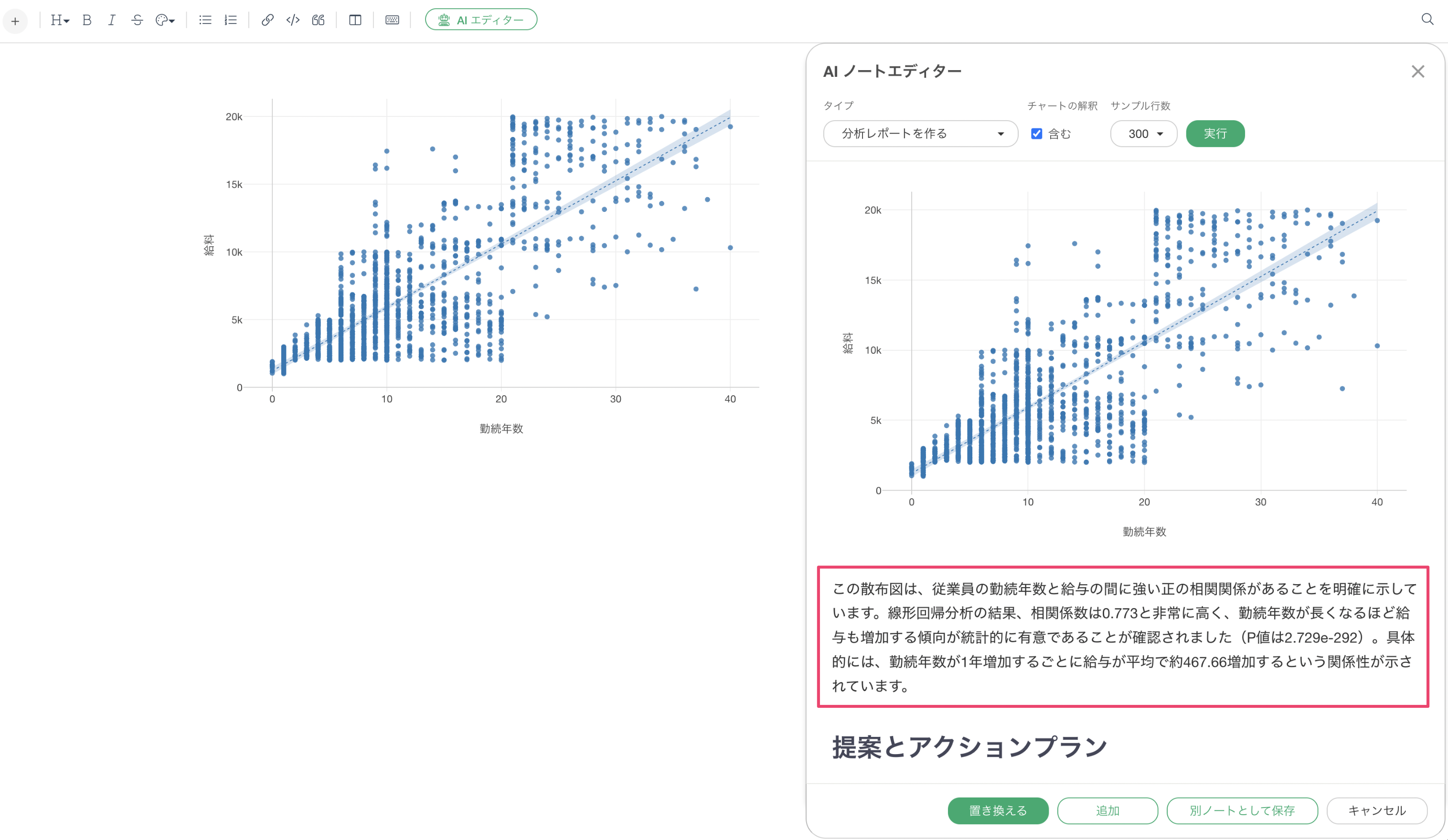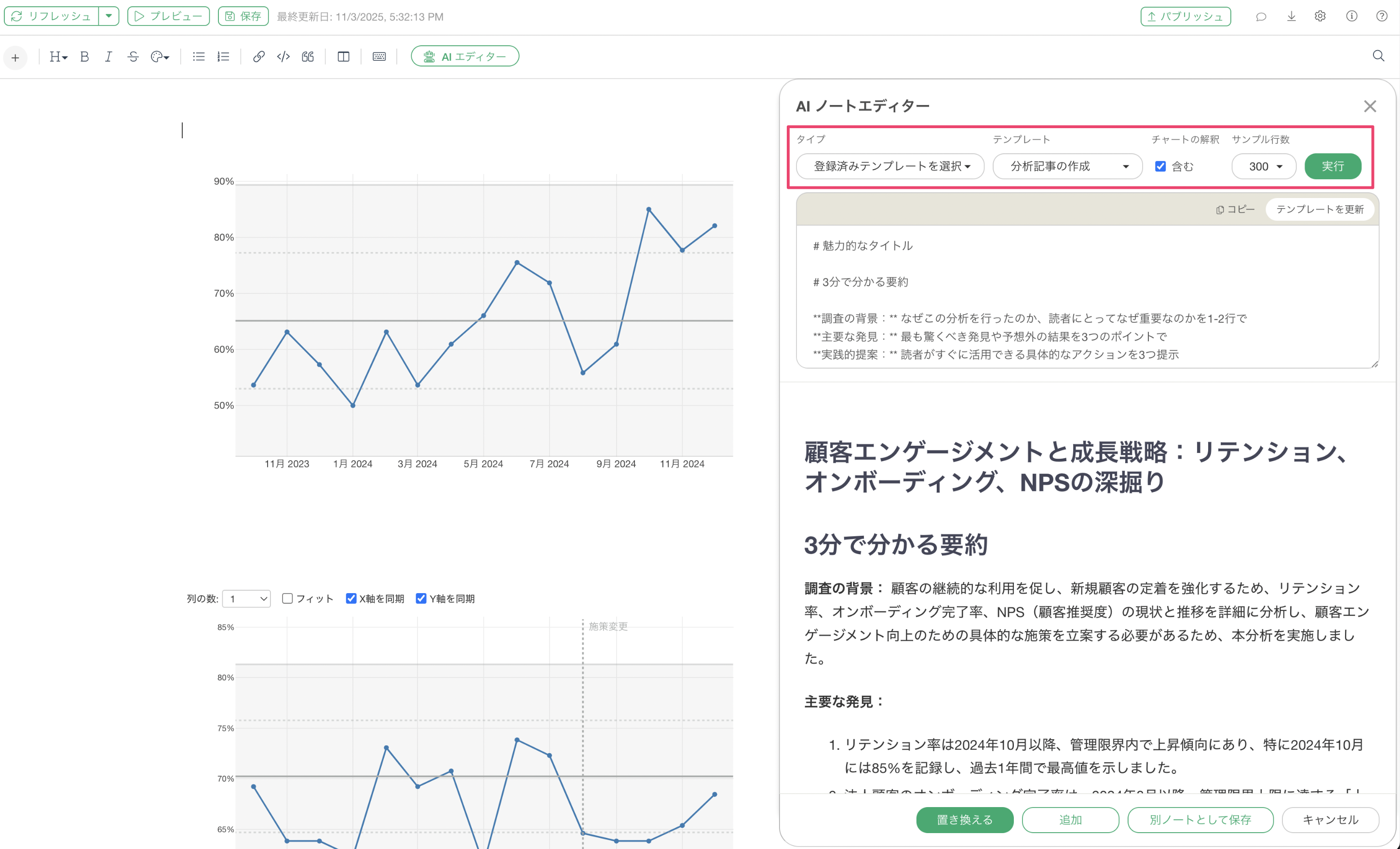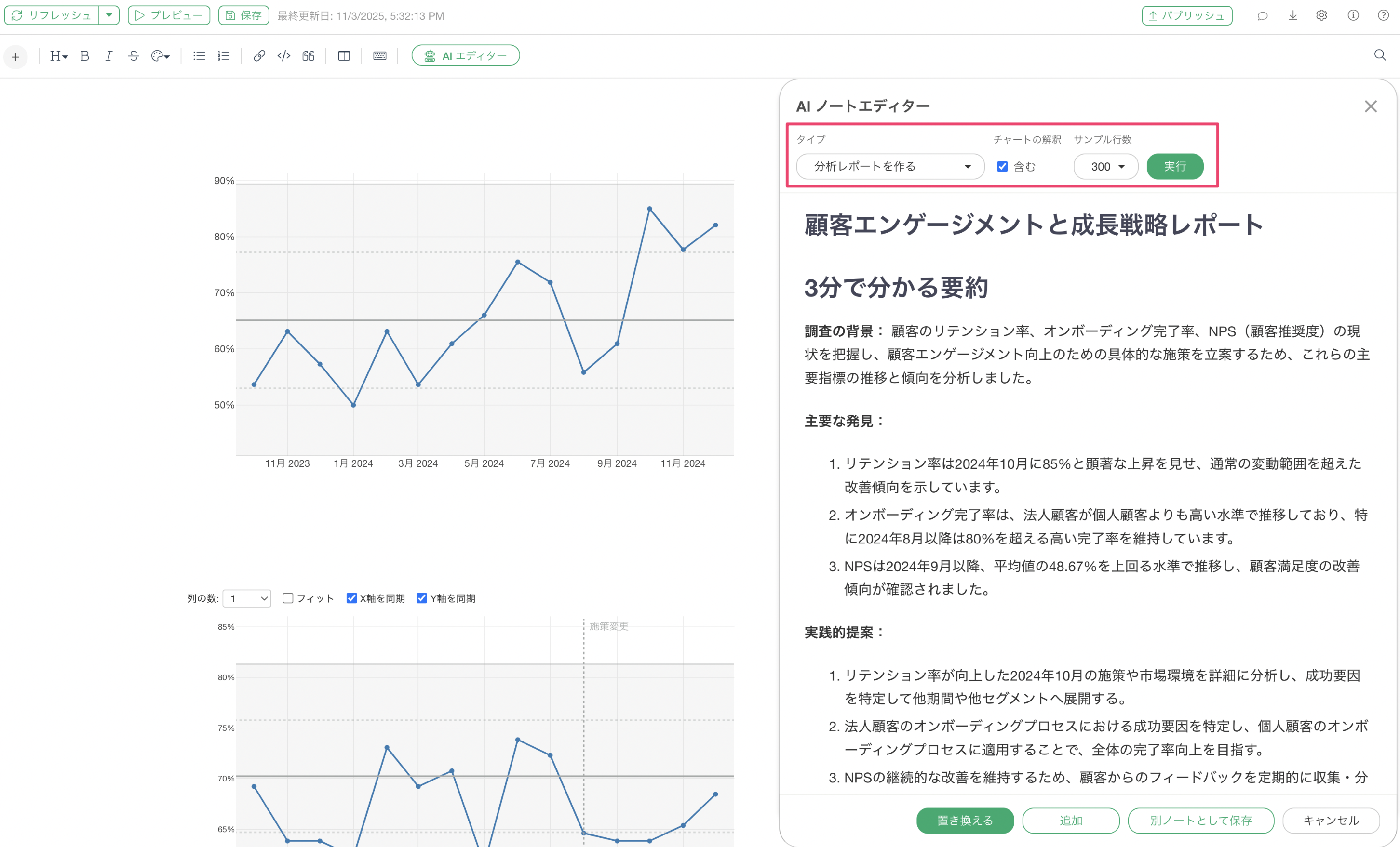 「置き換える」を押すことで、元のノートの内容を作成された分析レポートに置き換えることが可能です。