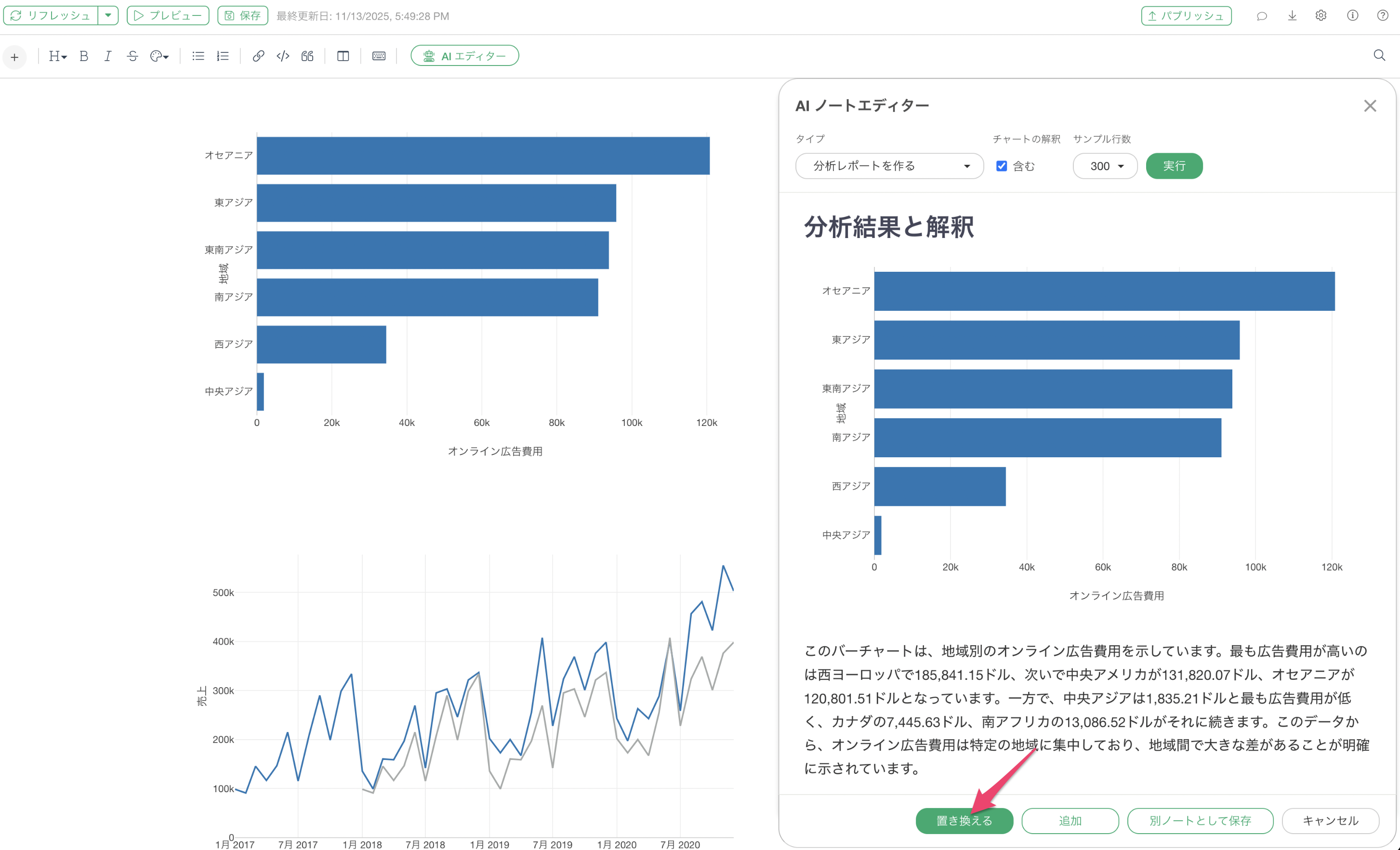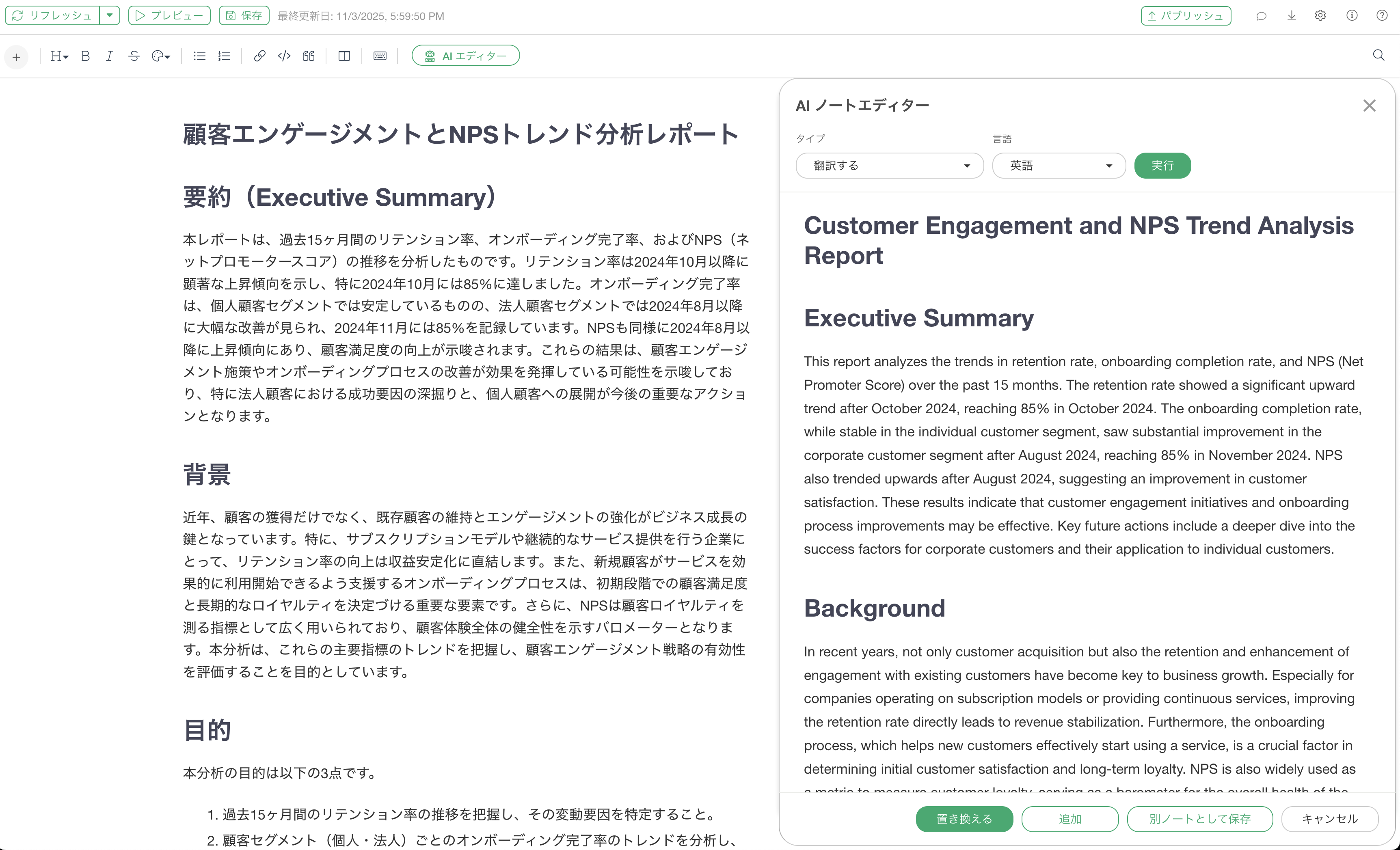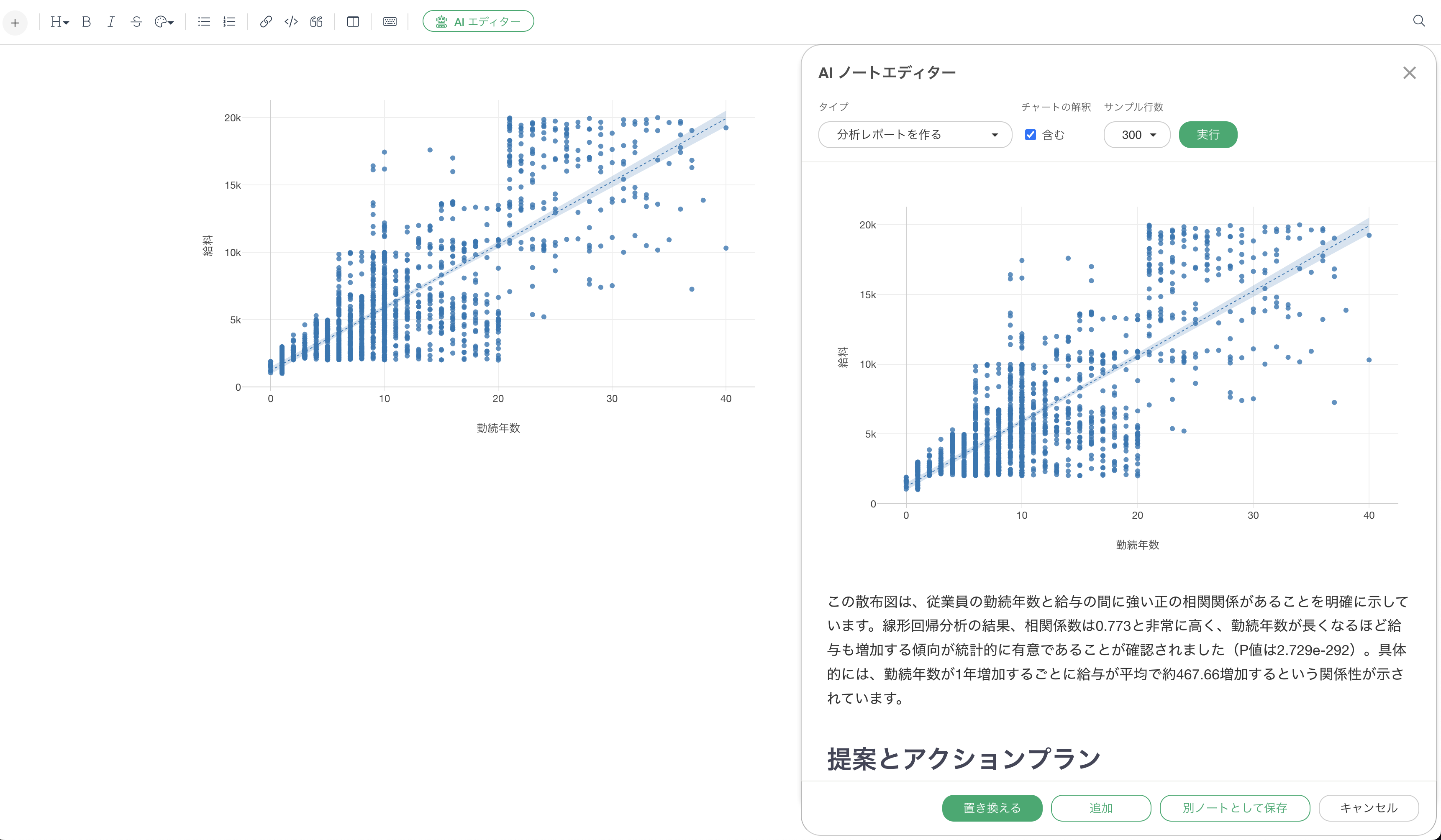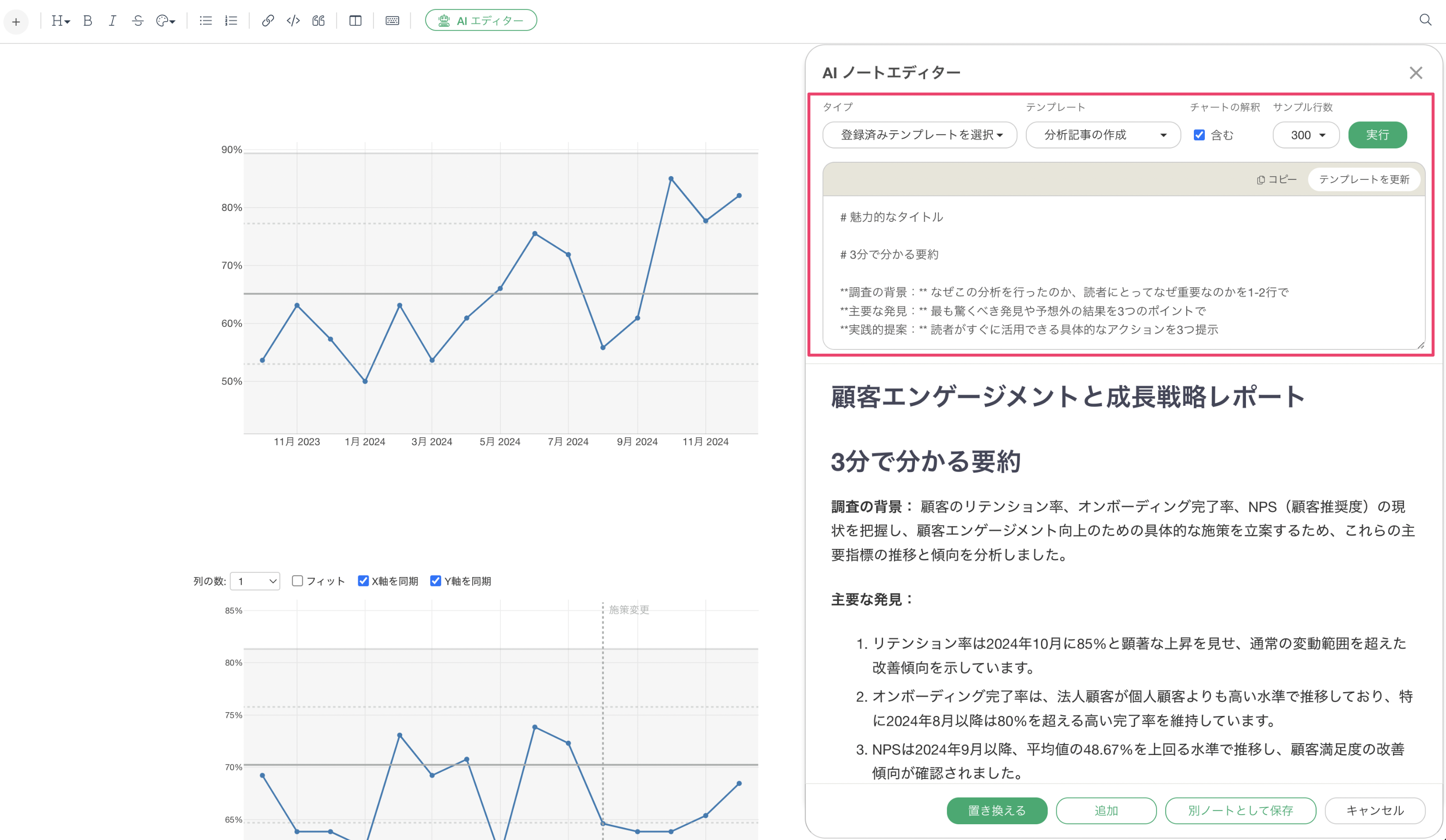 「置き換える」を押すことで、元のノートの内容を作成された分析レポートに置き換えることが可能です。