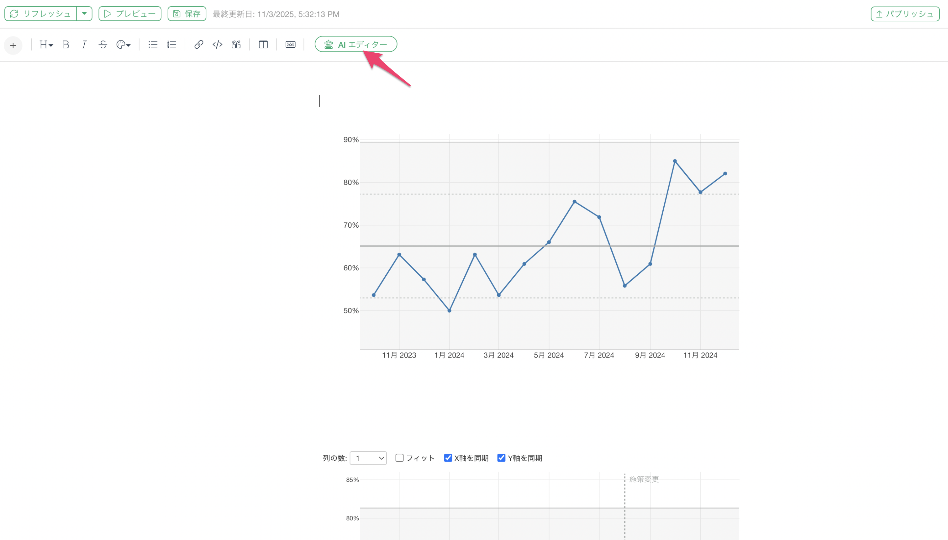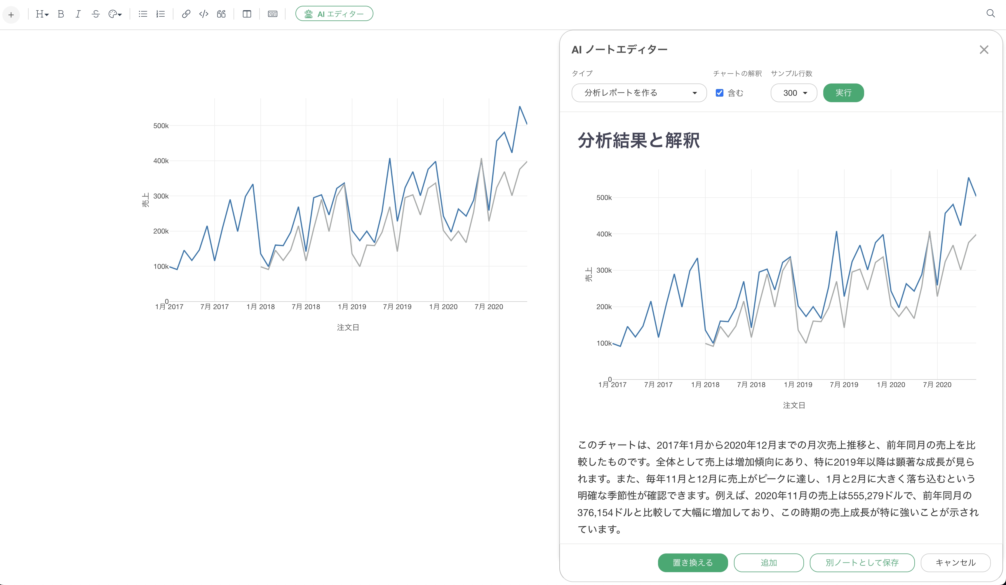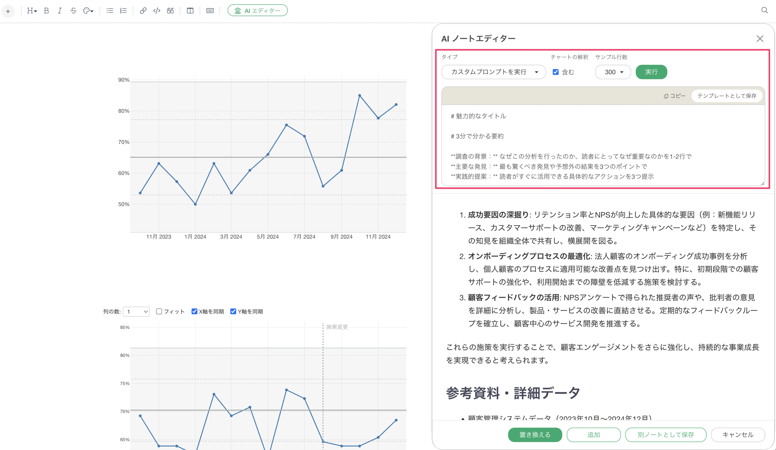 AI ノート エディターの最大の特徴は、チャートに含まれるデータを深く分析して解釈を自動生成できることです。