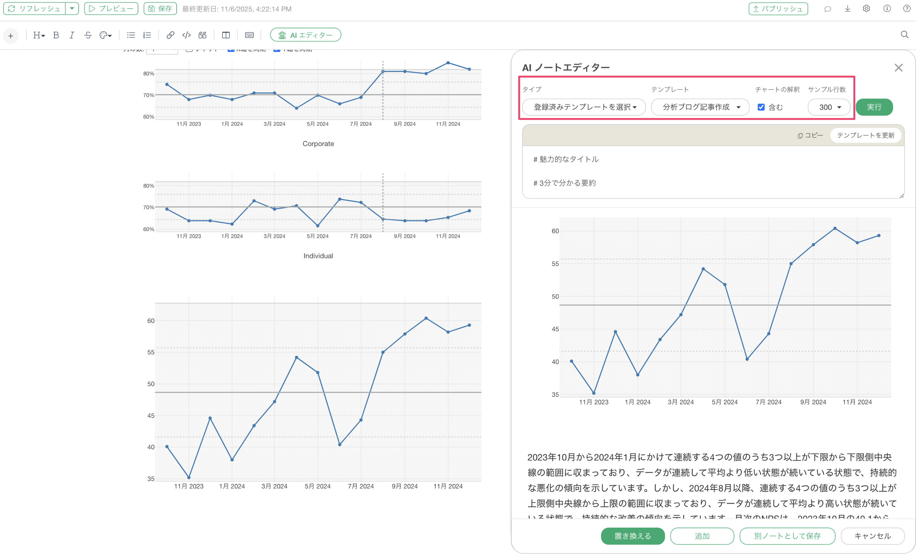 ノート内に埋め込んだチャートは、AIが自動的にデータを分析し、具体的な数値、統計的な根拠、トレンドやパターンを含む専門的な解釈を生成してくれます。自分でチャートの解釈について記述する必要がありません。