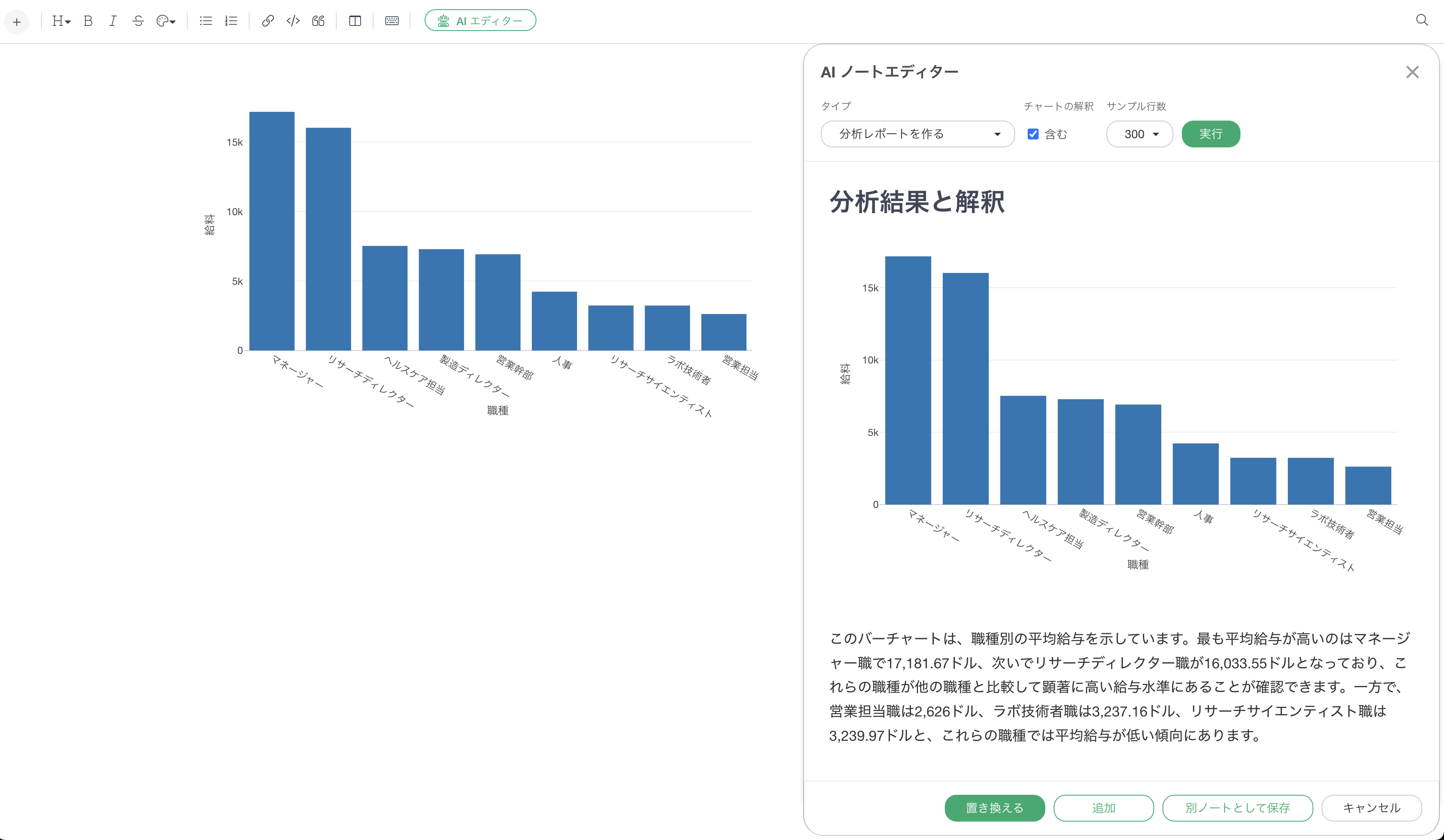 例えば、職種別の給料分布を示すバーチャートをノートに追加すると、AIは以下のような詳細な解釈を生成します。