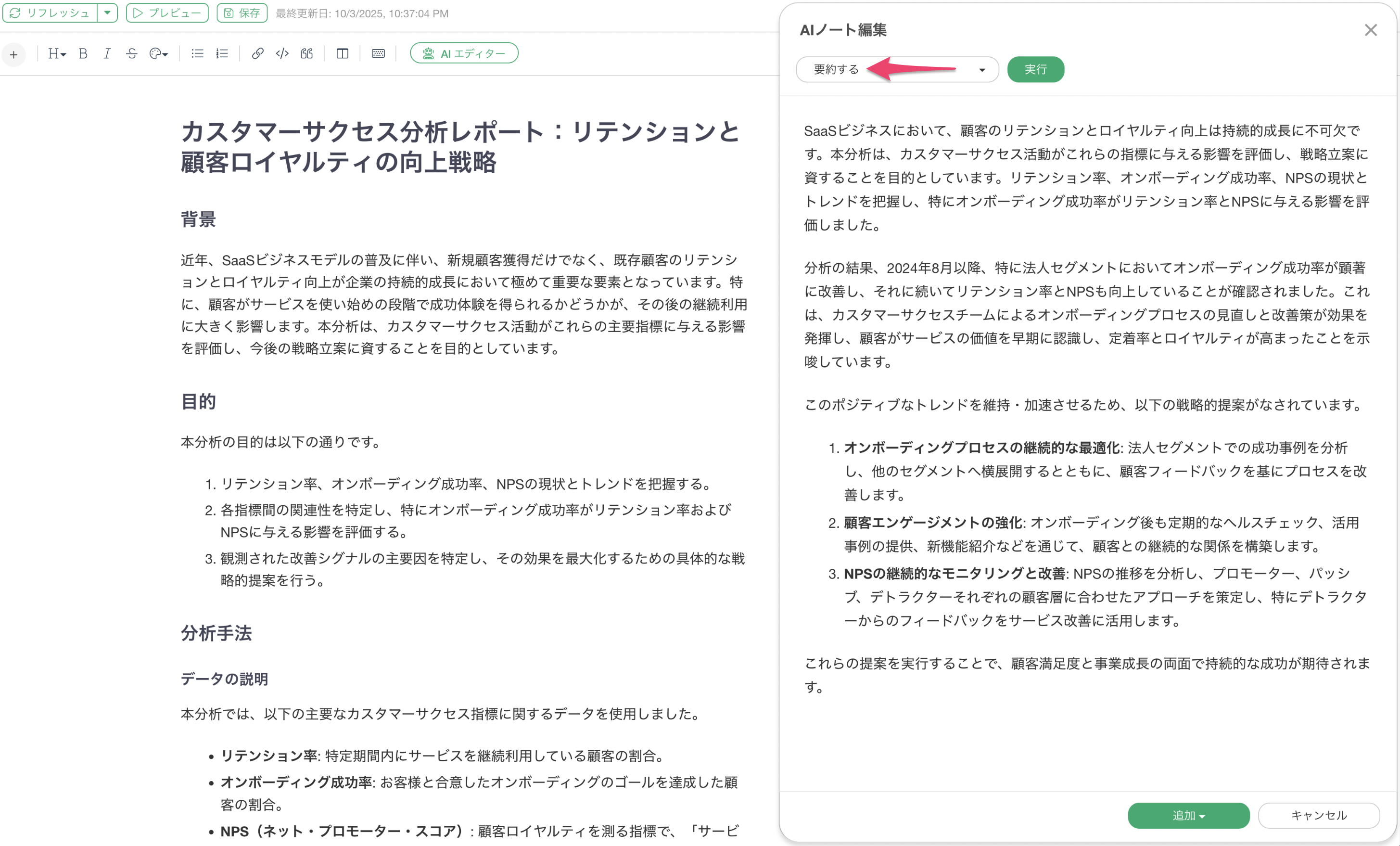 「分析レポートを作る」は、AI ノート エディターの最も強力な機能の一つです。