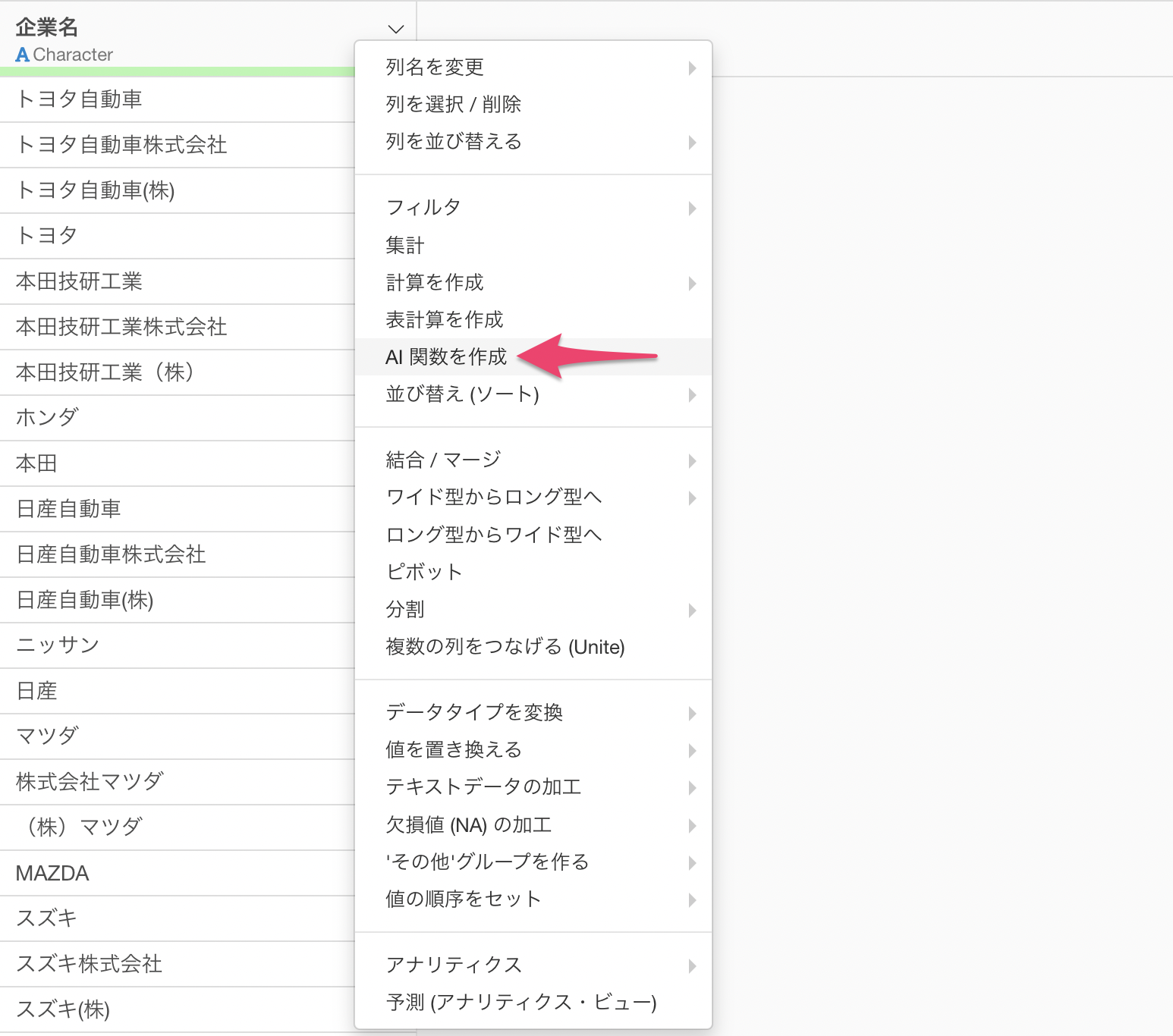 列ヘッダメニューから「AI 関数を作成」を選択します。