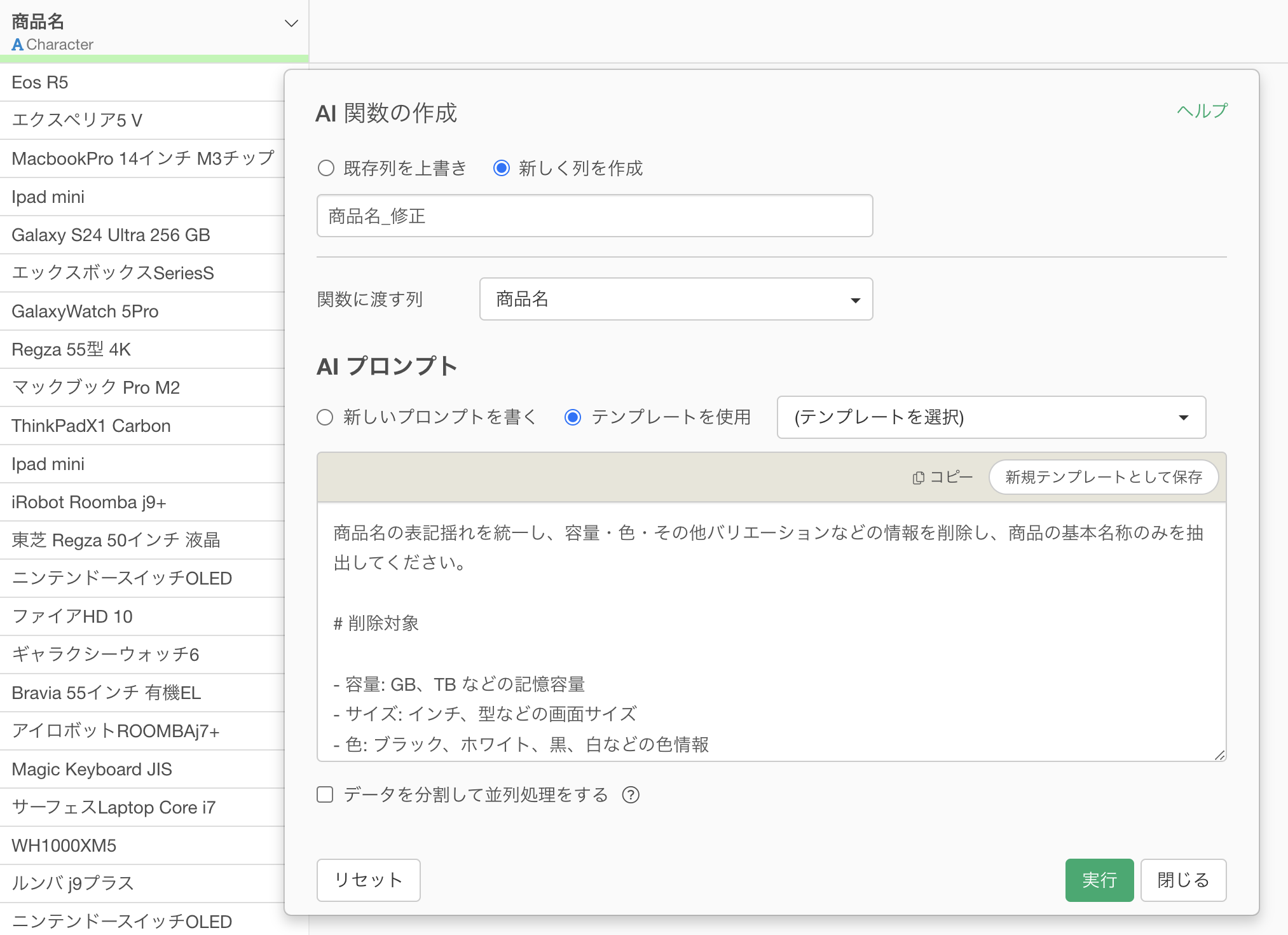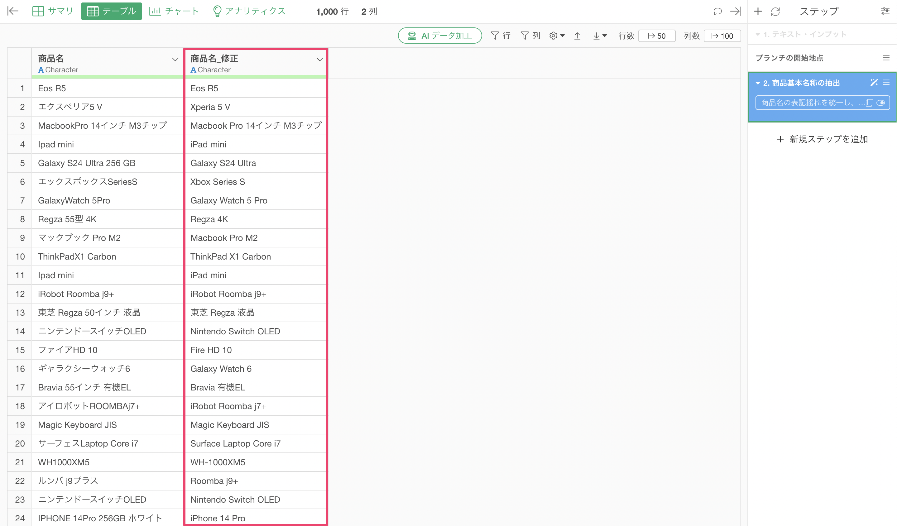 これにより、カタカナ表記の統一、不要な容量情報の削除、正式な商品名への変換。すべてが一度に完了しました。