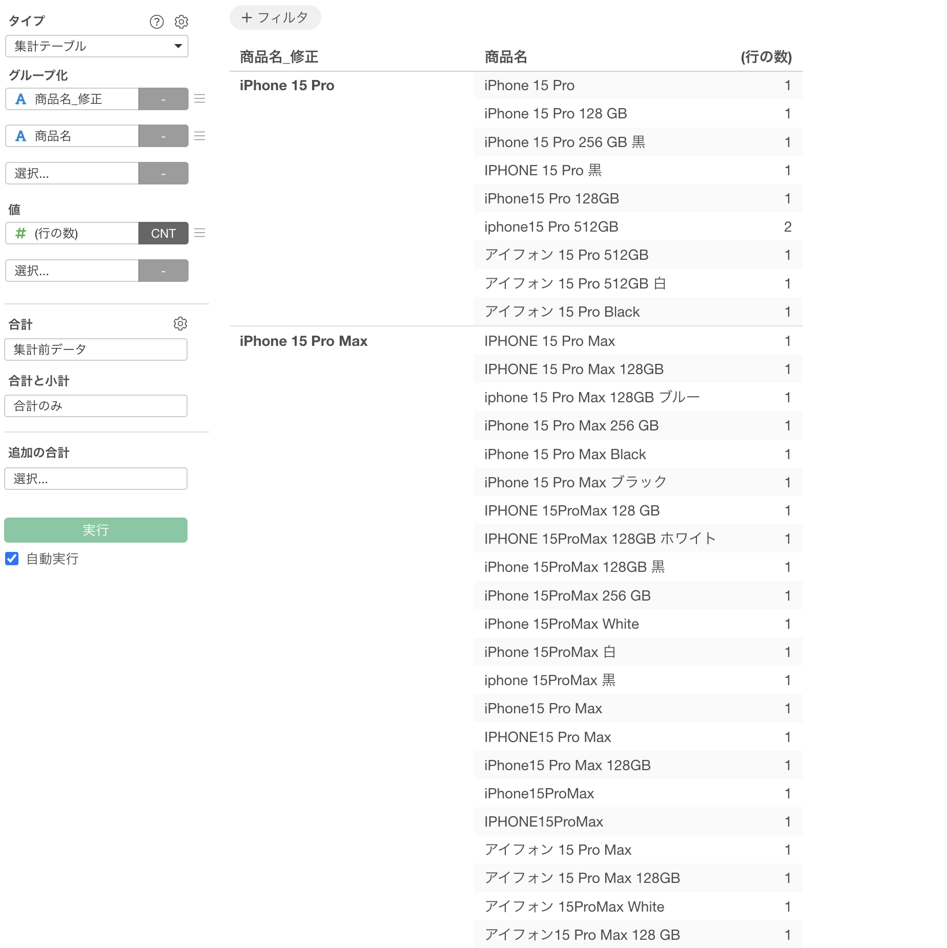 「iphone 15」という商品が、容量違いや色違いで、まるで別商品のように記録されているのです。