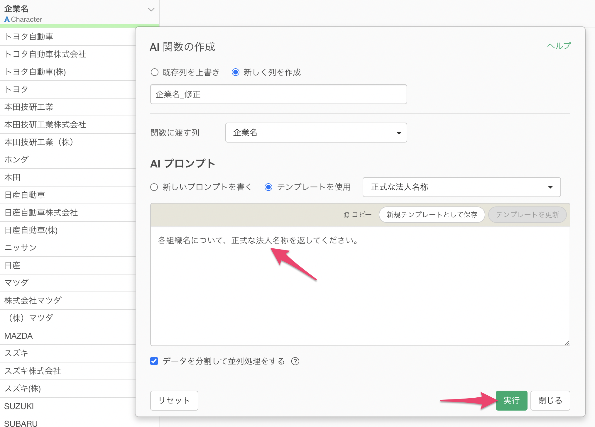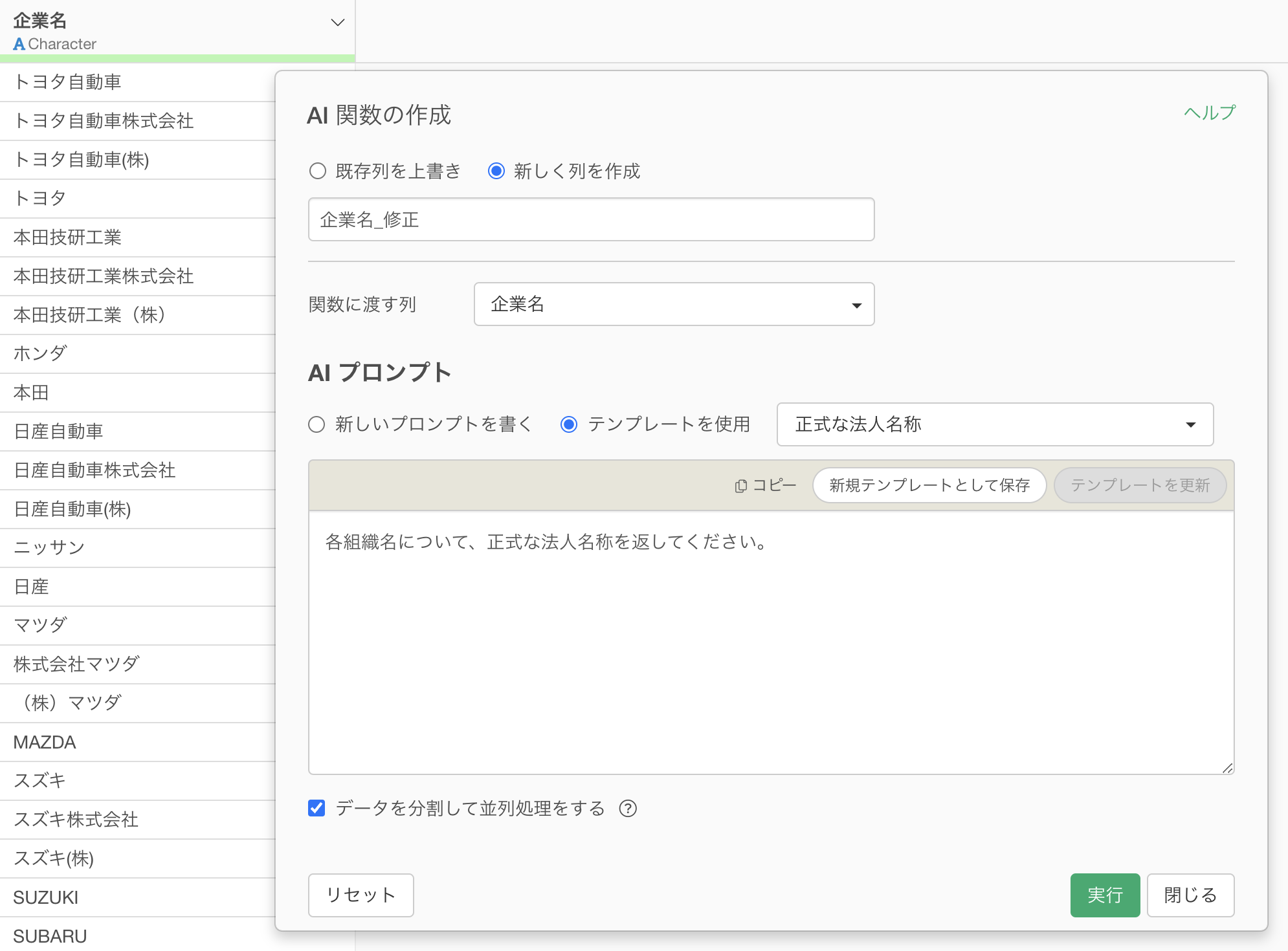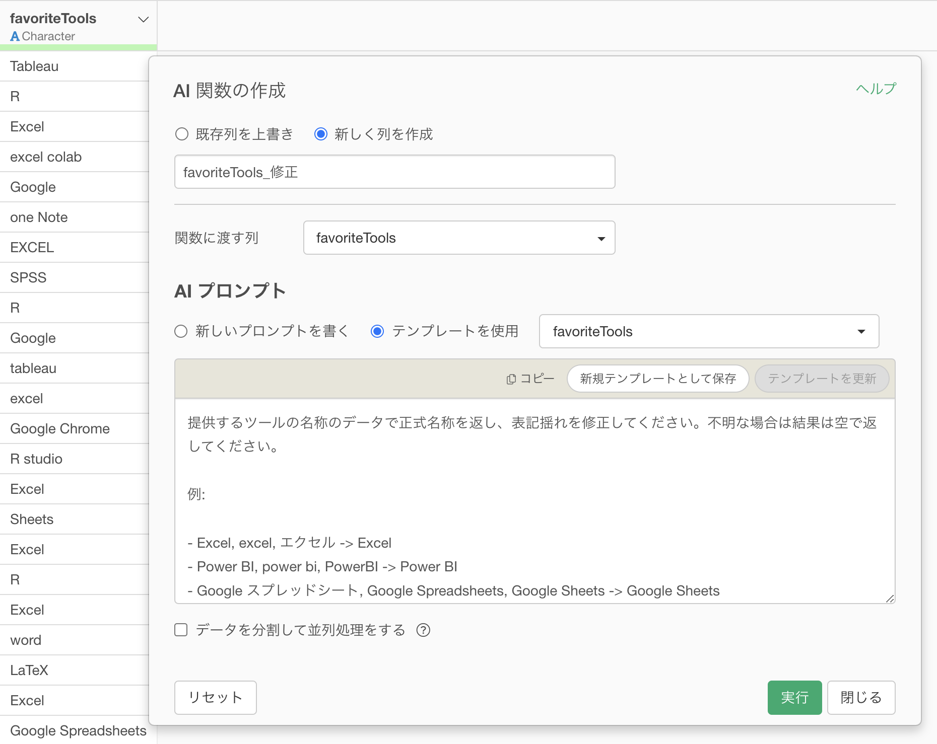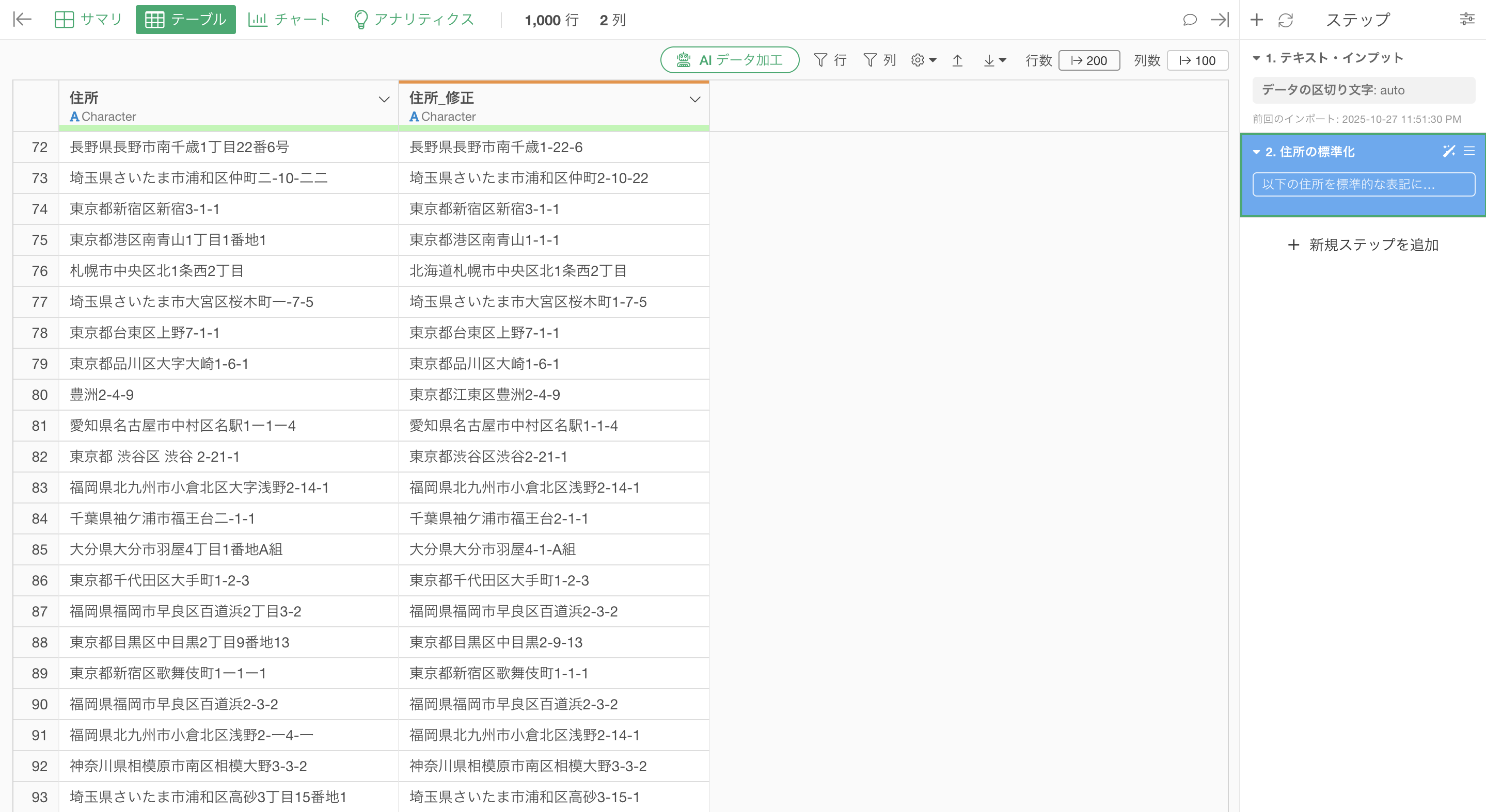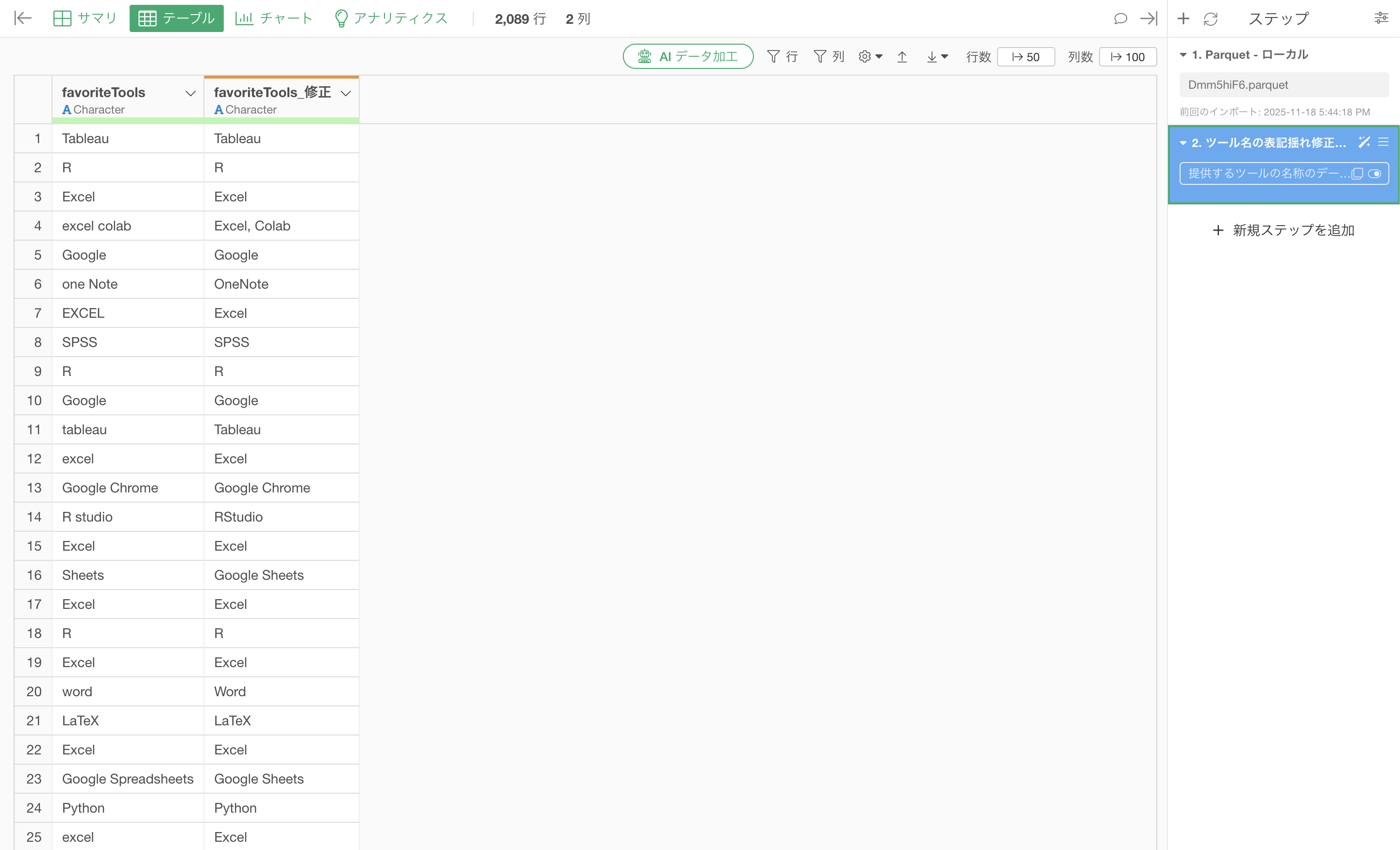 それだけで、数千行のデータに対する表記揺れ修正も、数十秒〜数分で完了します。