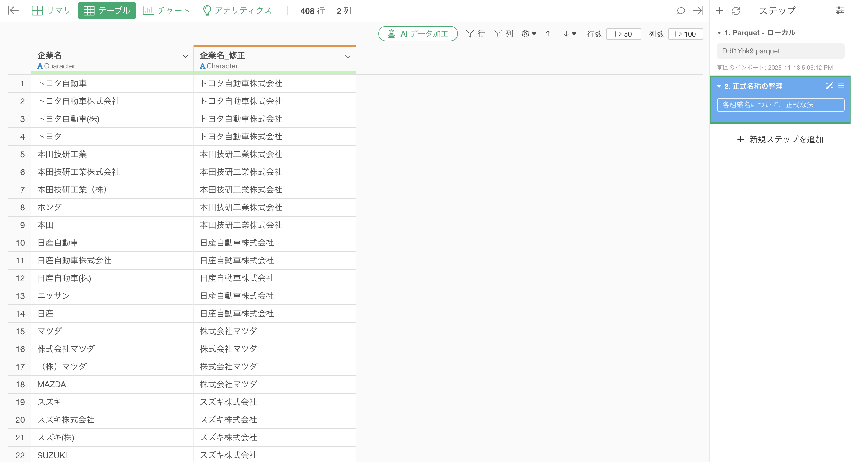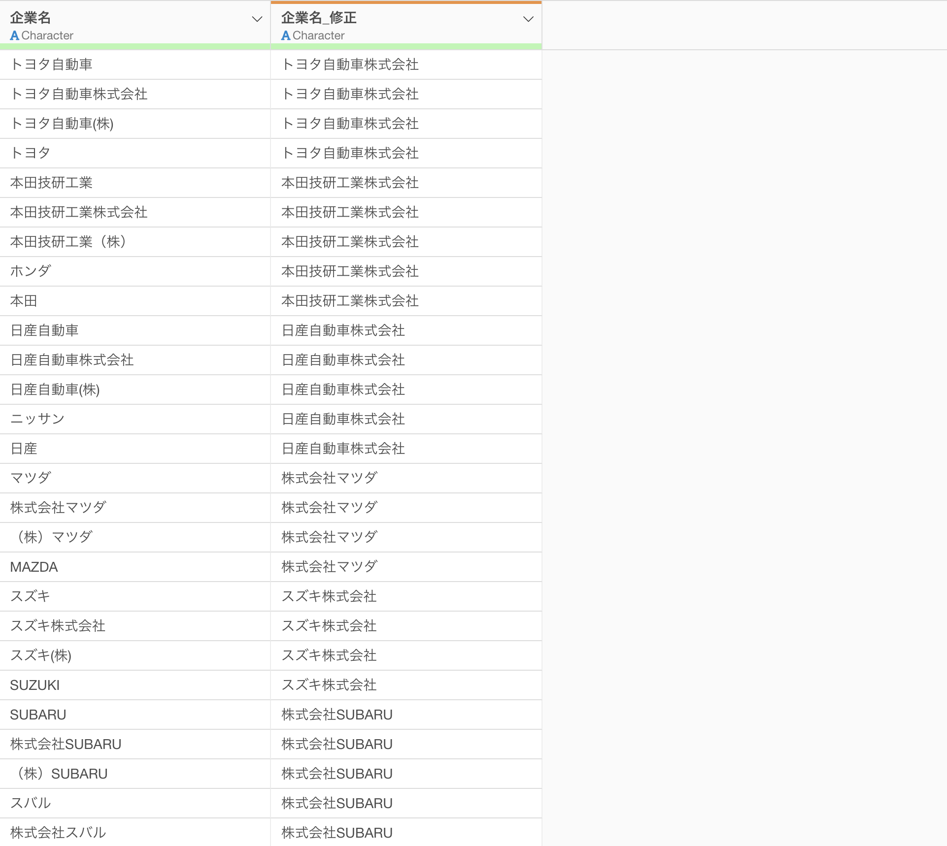 同じトヨタ自動車が「トヨタ」「トヨタ自動車」「トヨタ自動車(株)」「トヨタ自動車株式会社」と4つの別企業としてカウントされています。本田技研工業も「ホンダ」「本田」「本田技研工業(株)」とバラバラ。このままでは正確な企業数すら出せません。