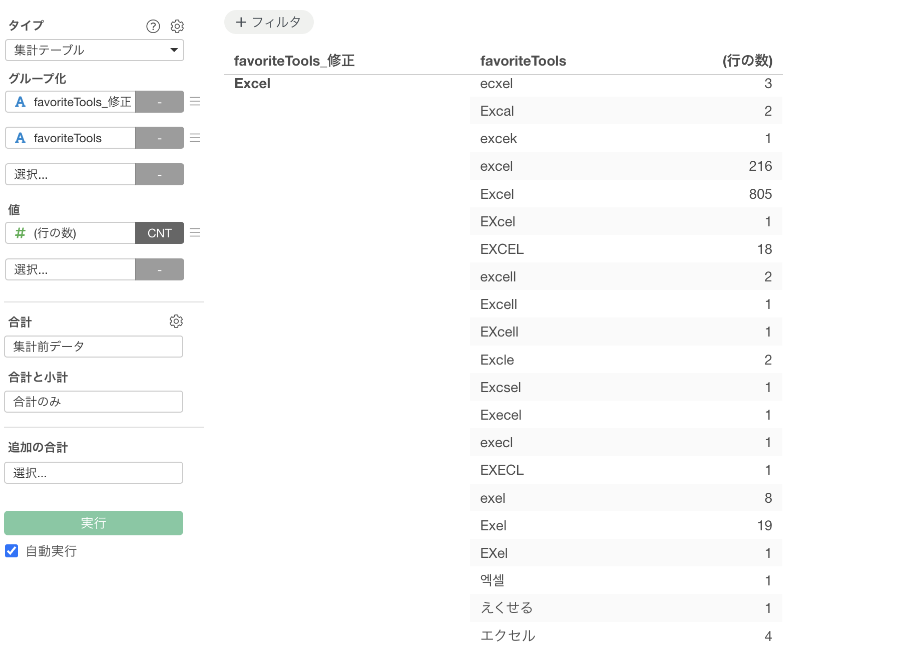 社内ツールの利用実態調査や特定の製品に関する自由回答の分析などで起こりがちですが、表記方法の違いによって別々な値として認識されてしまうため、正確な件数を把握したい場合に大きな妨げとなります。