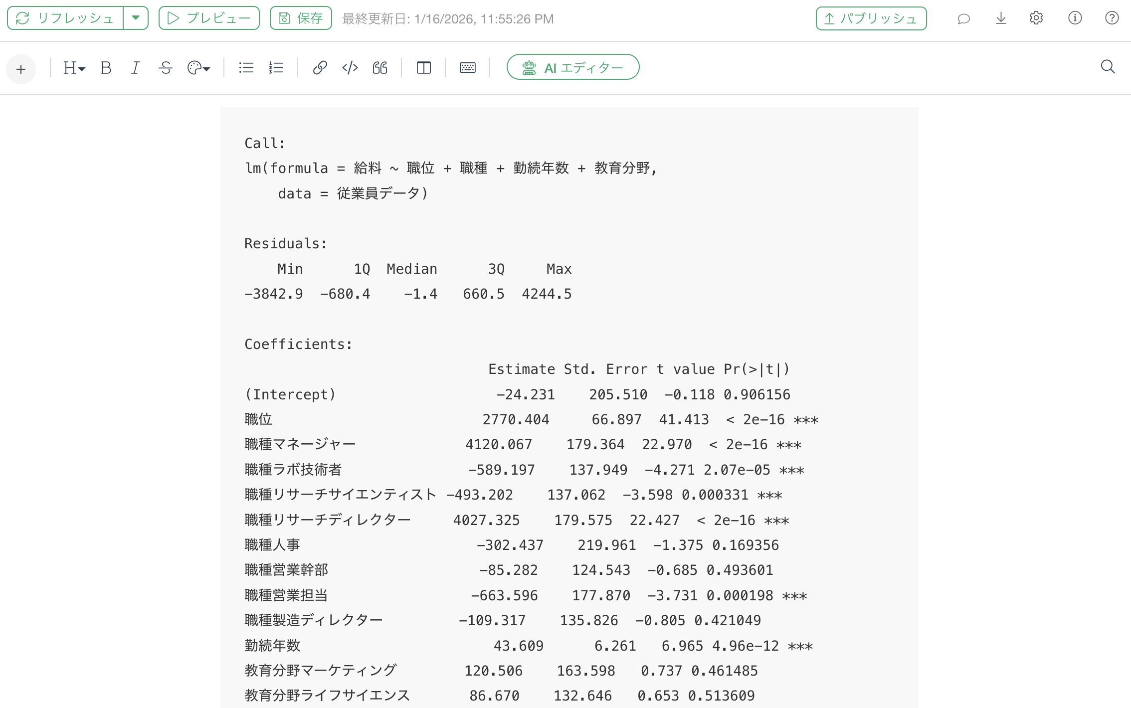 lm(formula = 給料 ~ 職位 + 職種 + 勤続年数 + 教育分野,